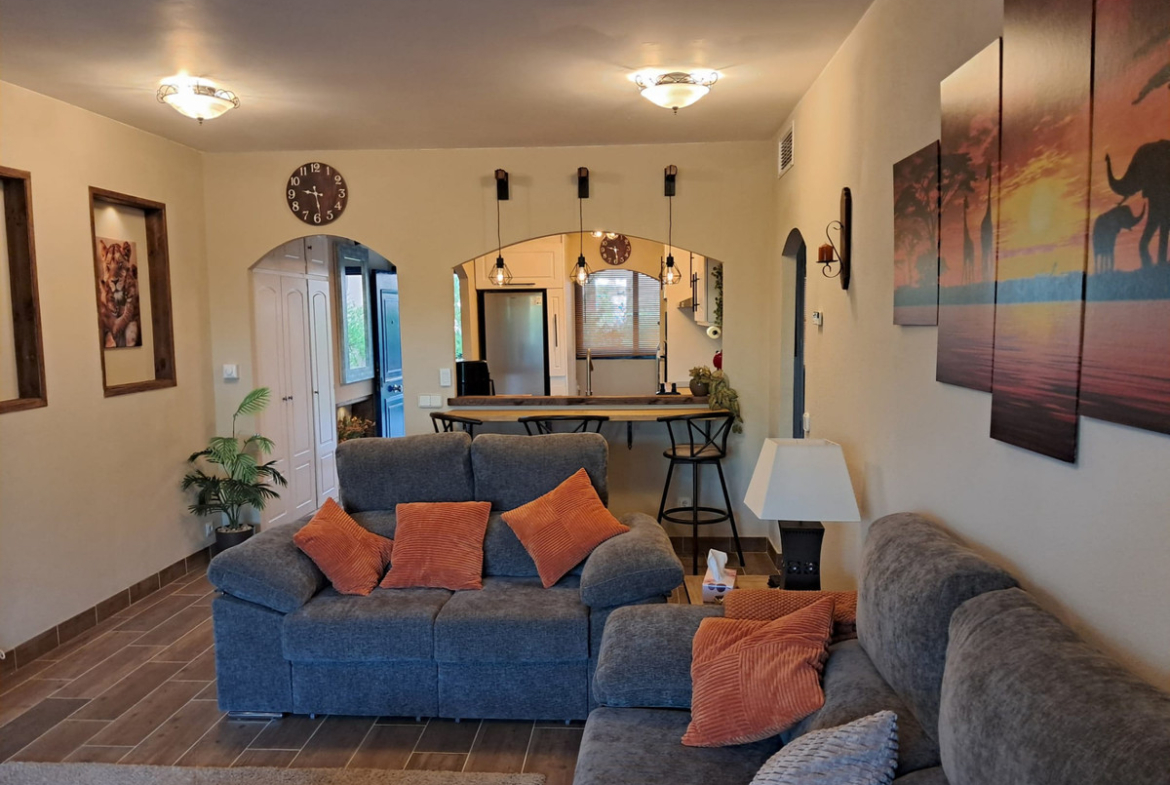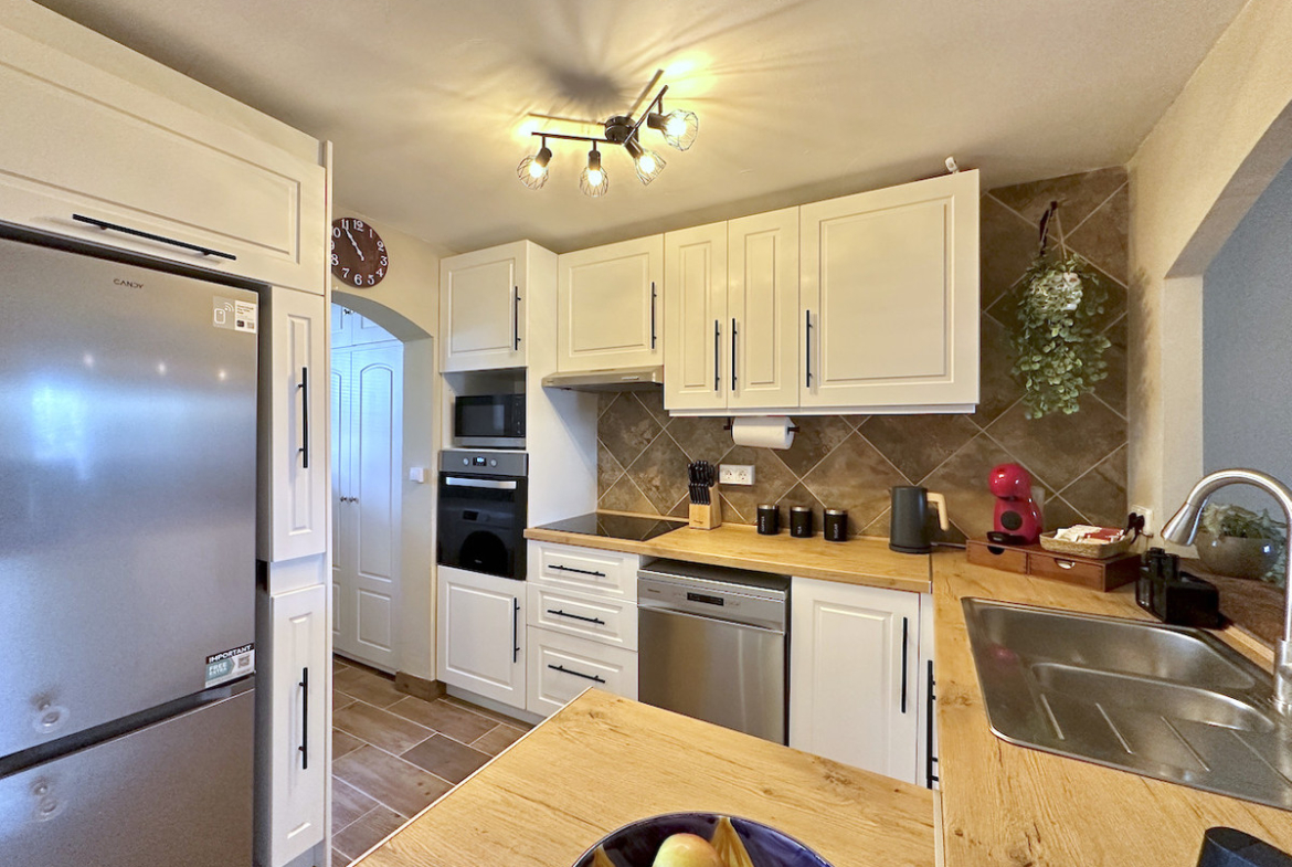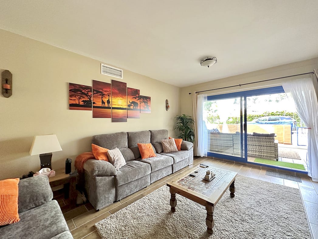 The apartment comprises two well-proportioned bedrooms and two modern bathrooms, including a stylish en-suite, as well as a guest toilet for added convenience. The open plan, fully fitted kitchen is equipped with high-quality appliances and is complemented by a separate utility and laundry room. The dining area flows seamlessly into the living space, which features a welcoming fireplace and direct access to the covered terrace, ideal for alfresco dining or relaxing in the Mediterranean climate. The property is offered fully furnished, with optional furniture packages available, and is in excellent, recently renovated condition.