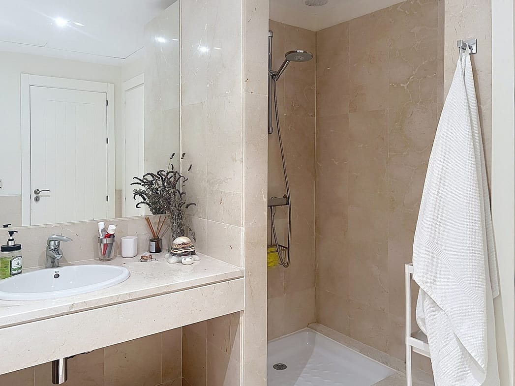This elevated ground-floor apartment offers spacious living areas, 2 bedrooms and 2 high-quality beige marble bathrooms, and a fully equipped kitchen that opens onto the living room through a serving hatch.