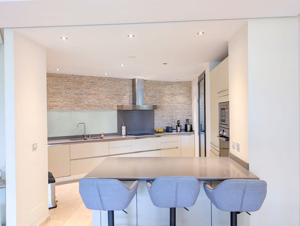 The fully equipped, modern kitchen offers premium appliances and ample storage, seamlessly combining functionality with sleek aesthetics. The master suite includes an en-suite bathroom and private access to the main terrace, offering a peaceful retreat. The second bedroom is generously sized and served by a full guest bathroom, making the layout ideal for families, guests, or home office use.