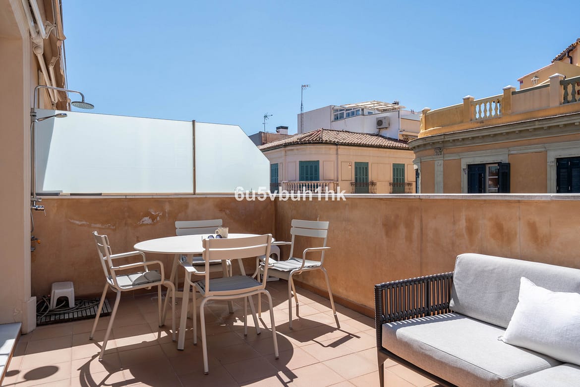 Just a few steps from the historic Atarazanas Market, this duplex penthouse offers a rare mix of character and modern design. The building has been fully renovated, preserving its charm while adapting it to today’s way of living. On the main floor, the open kitchen flows into a generous living and dining area with a striking double ceiling height and large terrace windows that flood the space with natural light. From here, you step directly onto a wide south- and west-facing terrace, perfect for long afternoons in the sun or evenings watching the city unwind. This level also includes a comfortable en suite bedroom, ideal for guests or as a second suite. Upstairs, the main bedroom feels bright and private, with wide windows framing the rooftops of Málaga. Its marble-finished bathroom completes the sense of understated elegance. Wooden floors, high ceilings, and clean architectural lines tie everything together, creating a home that feels both warm and sophisticated. A private garage adds practicality, while the tourist license gives flexibility for those who want to combine lifestyle and investment. This is a place where historic surroundings meet contemporary living, right in the heart of the city