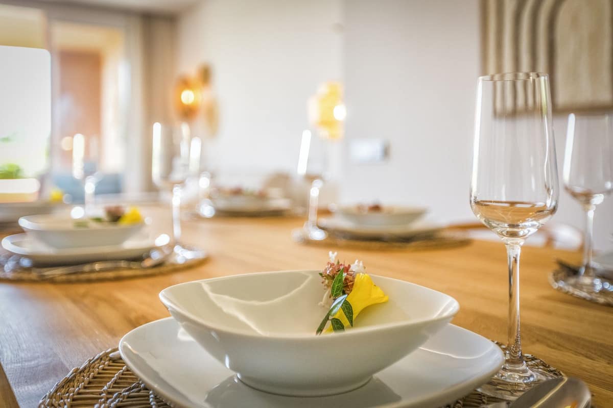 Inside you’ll find a bright living area that opens to a 57 m² partly covered terrace, a luxury kitchen, and a separate utility room. There are two bathrooms, one en-suite, and two good bedrooms. From the private terrace you look across to the main swimming pool.
