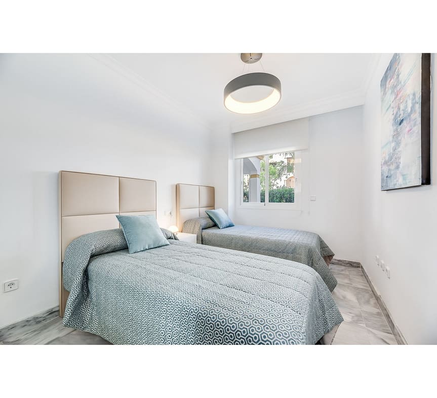 Discover the perfect blend of comfort, convenience, and Mediterranean charm in this bright 2-bedroom, 2-bathroom ground-floor apartment ideally located within walking distance of Puerto Banús and the beach. Set within a prestigious gated community with 24-hour security, this residence offers peace of mind and an exceptional lifestyle surrounded by 70,000 m² of lush landscaped gardens. Residents enjoy exclusive access to two stunning lagoon-style swimming pools, paddle tennis courts, children’s play area, and easy access to nearby golf courses.