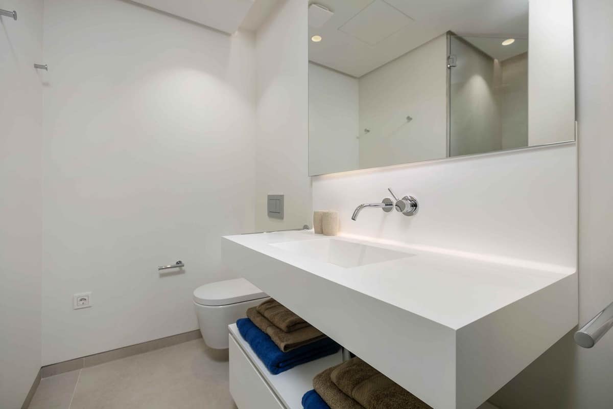 The apartment features a beautifully appointed master bedroom with an elegant en-suite bathroom, while the second bedroom is served by a separate bathroom conveniently located opposite. Both bathrooms are finished to a high standard and feature underfloor heating and luxurious walk-in showers, ensuring year-round comfort and a refined spa-like experience.