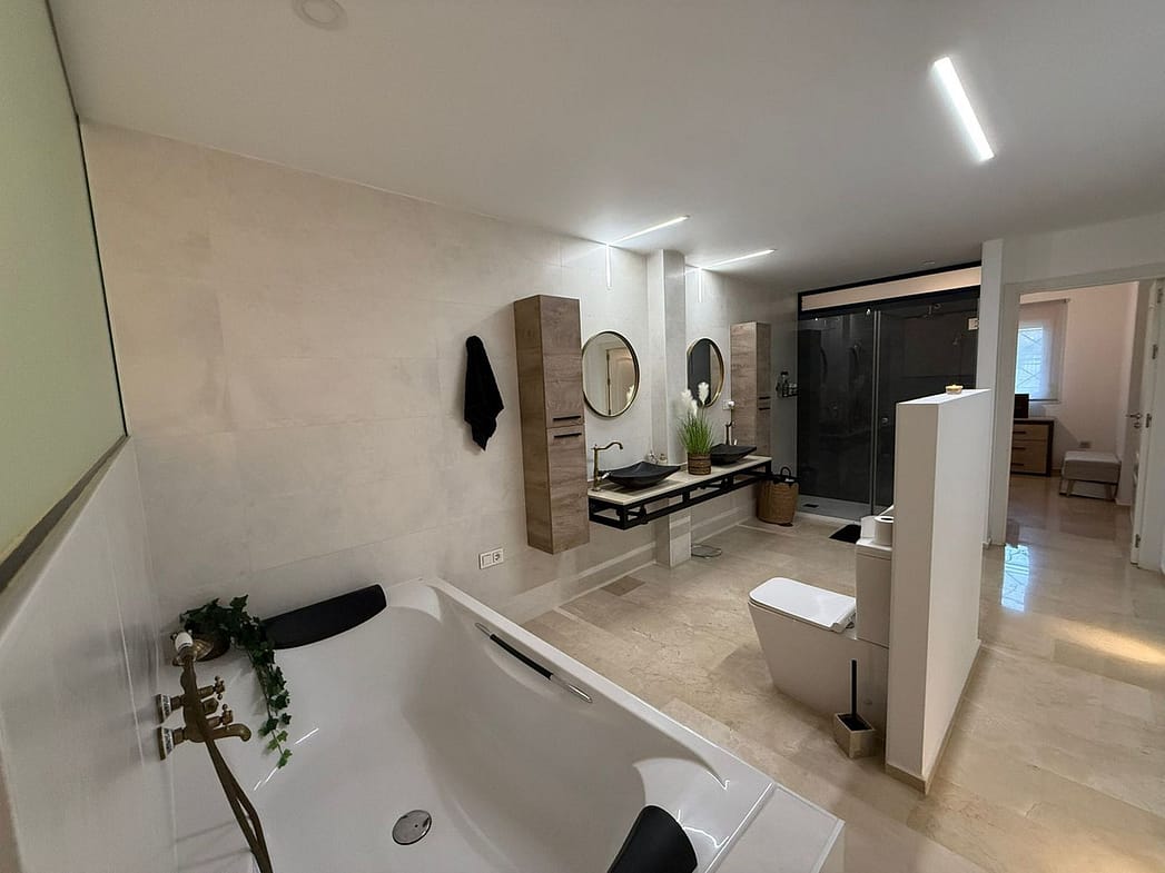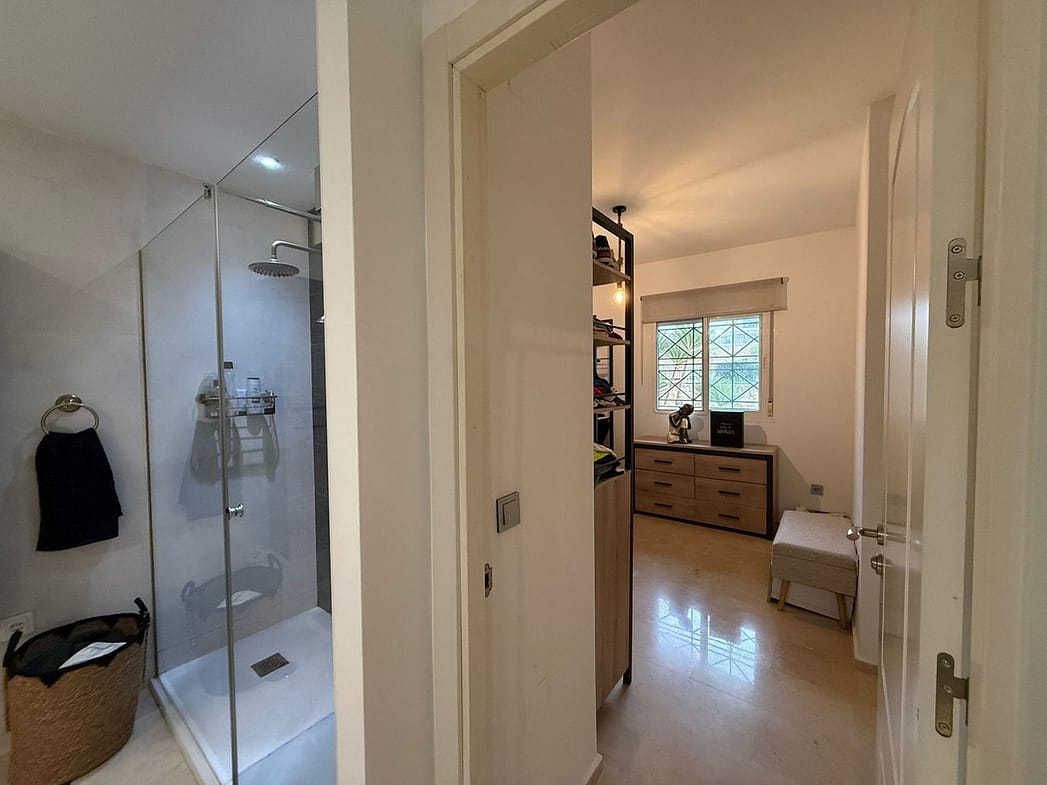 Upon entering, to the left is the open-plan kitchen, equipped with all new appliances, a window, and connected to the dining area where there is a table and 4 chairs.. Next is the spacious living room with an L-shaped sofa, hot/cold air conditioning, and access to the private covered terrace and an open section of the private garden. There are two bedrooms with windows and split-system hot/cold air conditioning. The two original bathrooms have been combined into a single, very large bathroom with a bathtub, a double shower, and a generously sized double sink area. However, it is easy to create two separate bathrooms again with drywall partitions. From the private garden, there is direct access to the communal garden and the communal swimming pool (no steps).