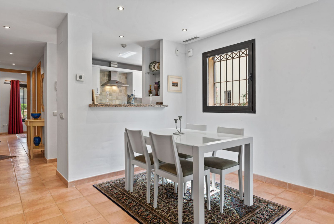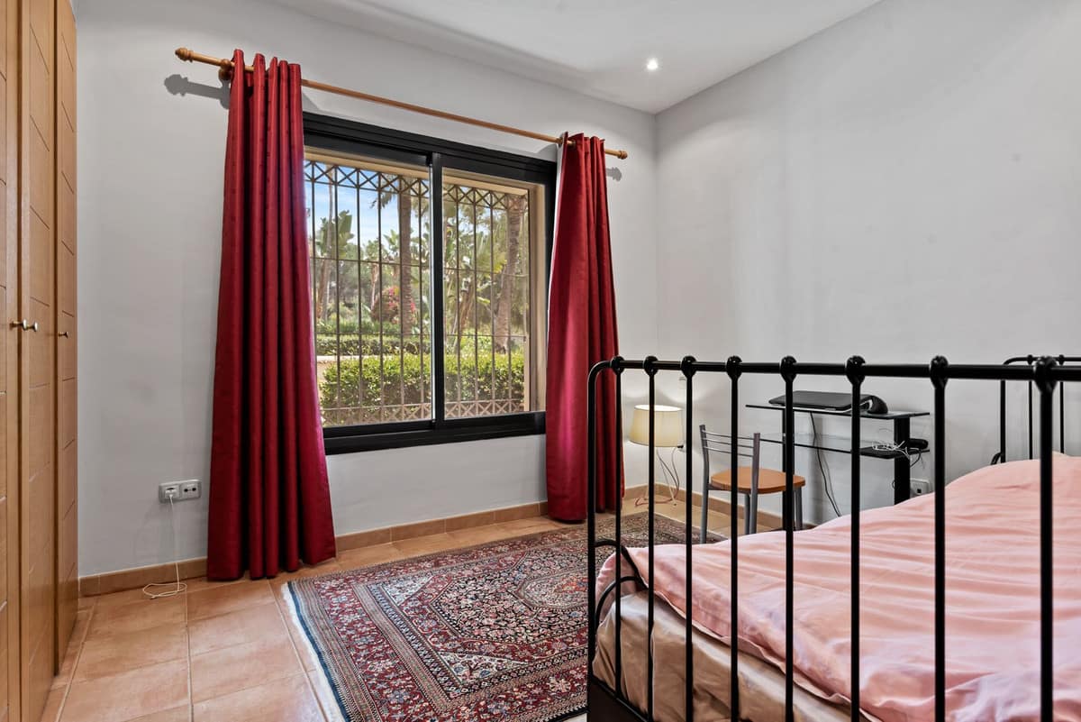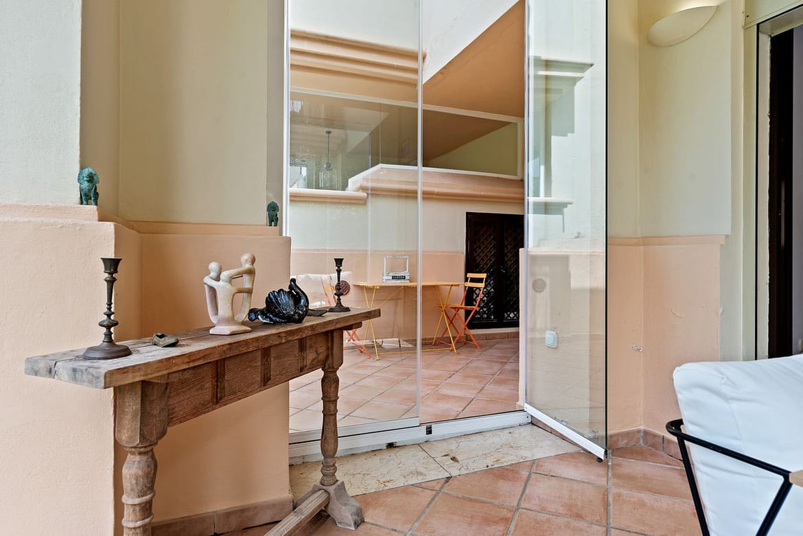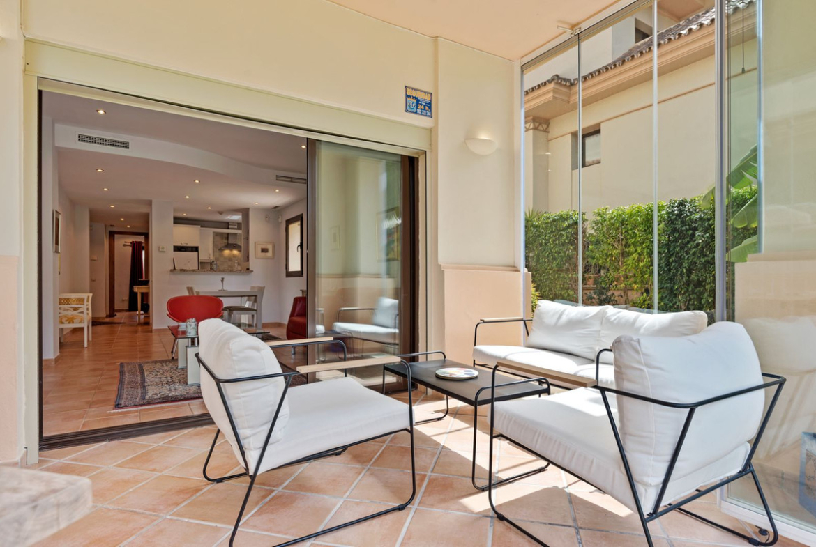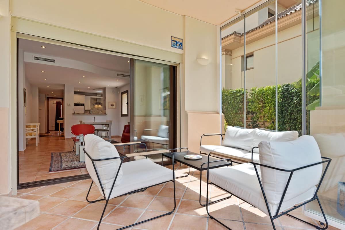 This Two Bedroom Corner Garden Apartment has a great private terrace with glass curtains, while a private garden offers you a tranquil oasis for relaxation. Urb. Pueblo del Rio is nestled on the banks of the Rio Real and surrounded by the majestic Sierra Blanca mountain peaks, is renowned as one of the most picturesque urbanizations in Marbella. Only seconds to one of the best beaches on the coast and minutes from the main city centre of Marbella and shopping center La Cañada.