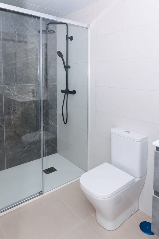 Bathrooms with integrated furniture, mirrors, and glass shower screens