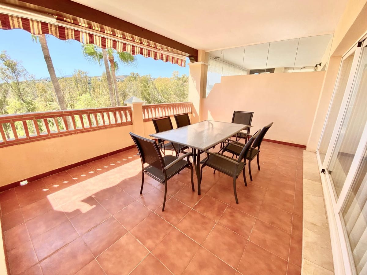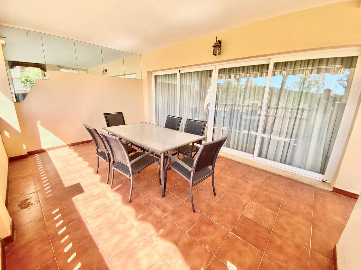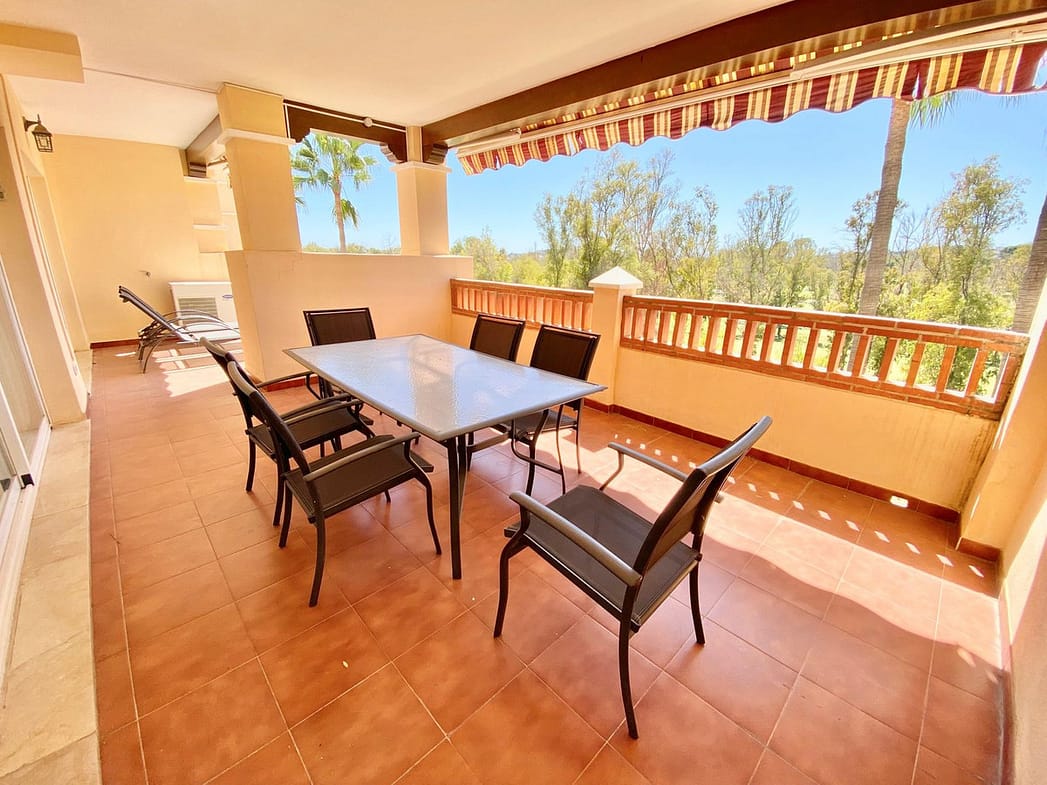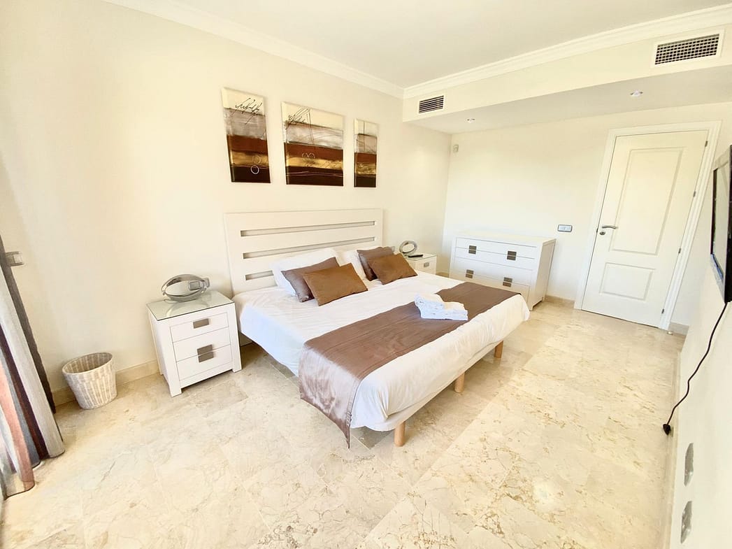 It features 2 bedrooms, 3 bathrooms, and a spacious 34 m² sunny terrace with views of mountains, and golf course.