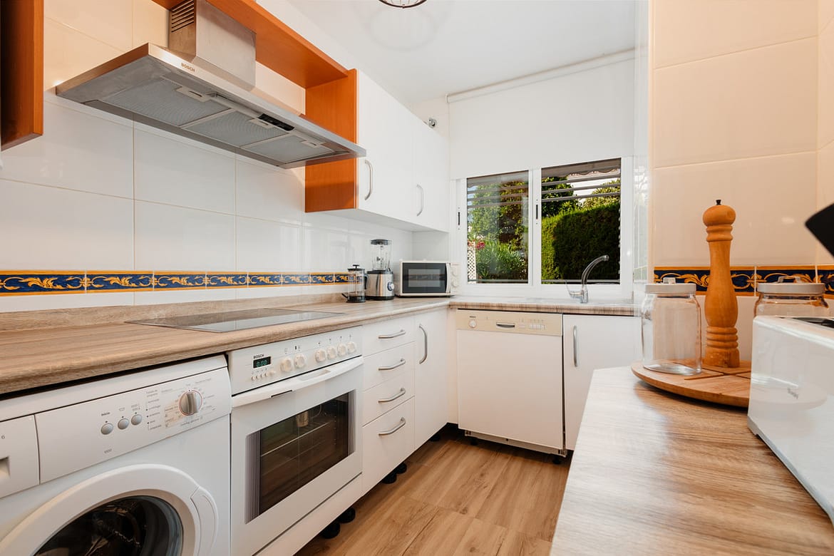 The kitchen is fully equipped with modern appliances, including refrigerator, oven, microwave, dishwasher, washing machine, coffee maker, toaster and grinder, and a basic kitchenware to make you feel that you lack absolutely nothing.