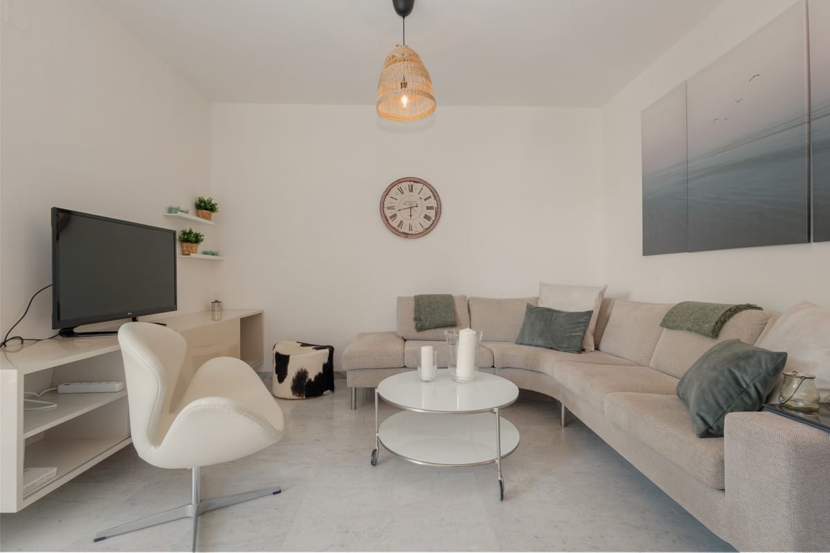 The spacious and bright living room, which has a smart TV, a comfortable arched sofa and a table, connects directly to the private terrace of the property, where you will find another great dining table ideal for meetings with friends and family without having to leave home.