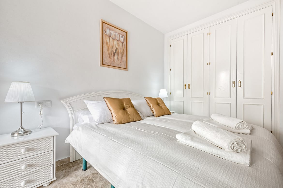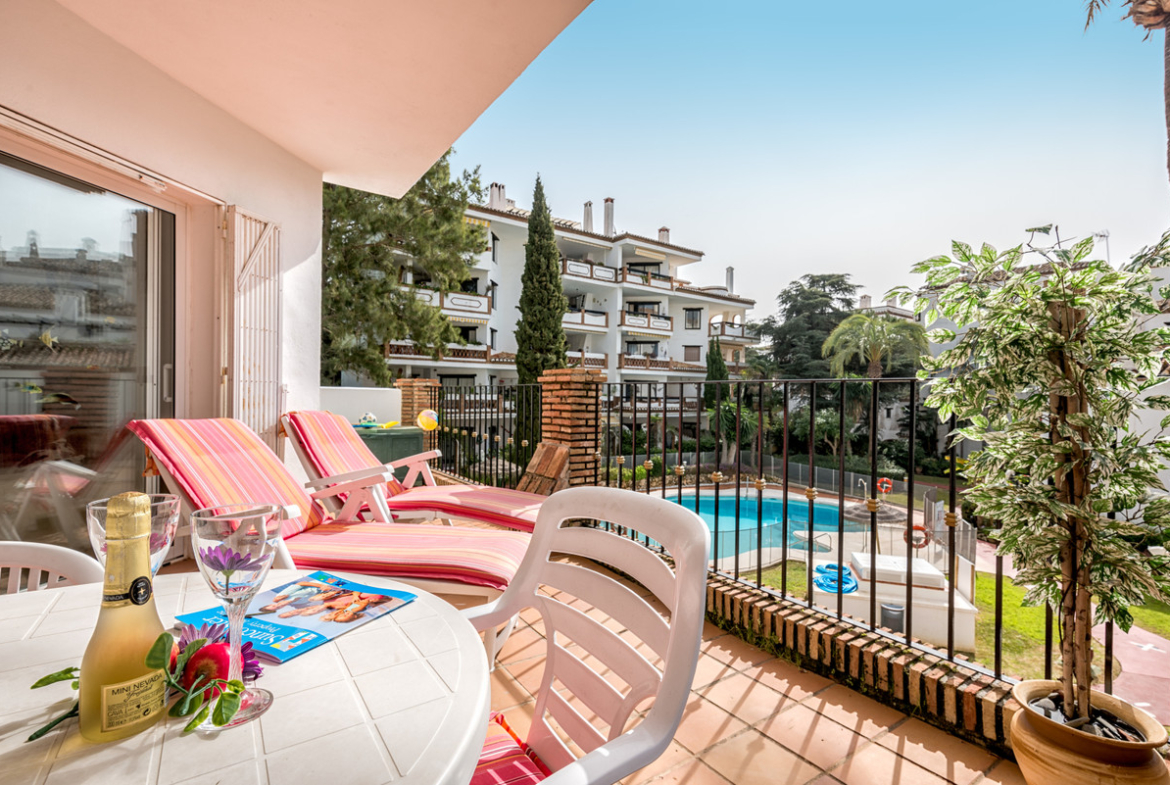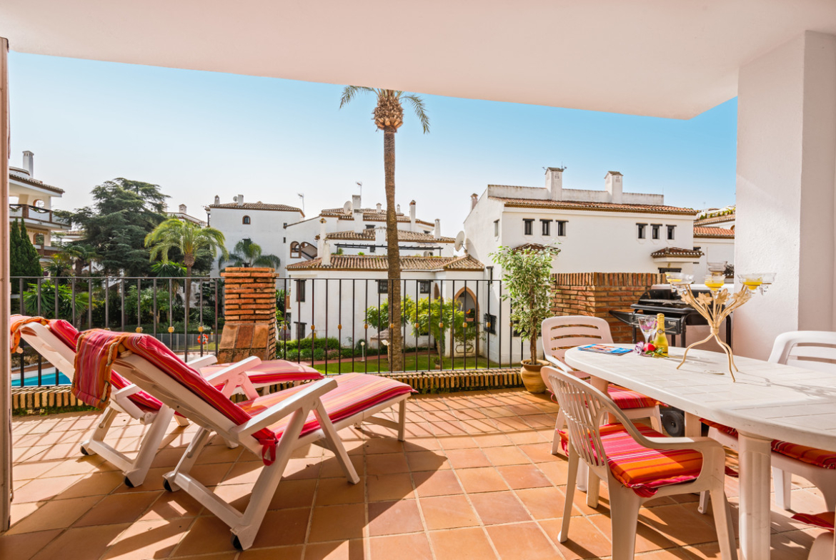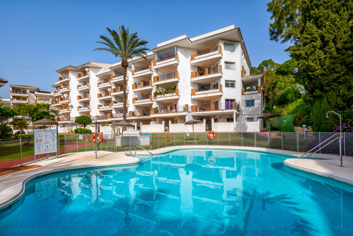 2 bedroom, 2 bathroom first floor, south facing apartment. This bright spacious two bedroom apartment is well furnished with a bright sunny lounge and two double bedrooms. There is Air conditioning/heating throughout and complementary Wi-Fi and internet enabled TV with a selection of international channels is provided.. Situated close to the beach and within walking distance of all amenities this complex has extensive lawned tropical gardens and 2 sparkling free form swimming pools.