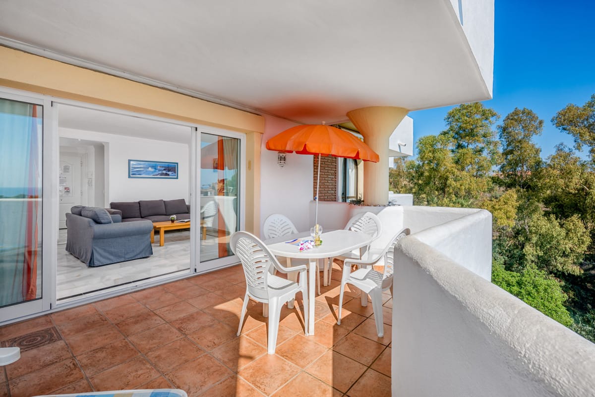 The apartment is situated on the 3rd floor with lift access with a bright spacious lounge. The comfortable sofas and dining table provides ample seating for a small family or 4 adults and the patio doors open out onto a good sized private terrace with outside dining area and fitted barbecue area overlooking the communal gardens and pool, with sea views. The kitchen is fully equipped with oven/ hob, washing machine, fridge/ freezer, toaster and kettle. Both bathrooms are shared, one with a fitted shower unit and the other with a bath with shower. The tropical gardens and communal pool are well maintained. There is secure off road parking available to this property, although a car is not essential.