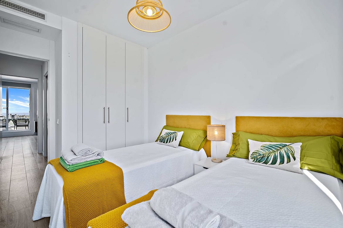 To the left of the entrance hall is a twin bedroom with built-in wardrobes and a bathroom. Through the lounge area the master bedroom is accessed with a super-king sized bed, a dressing area with fitted wardrobes, and a bathroom with a walk in shower.
