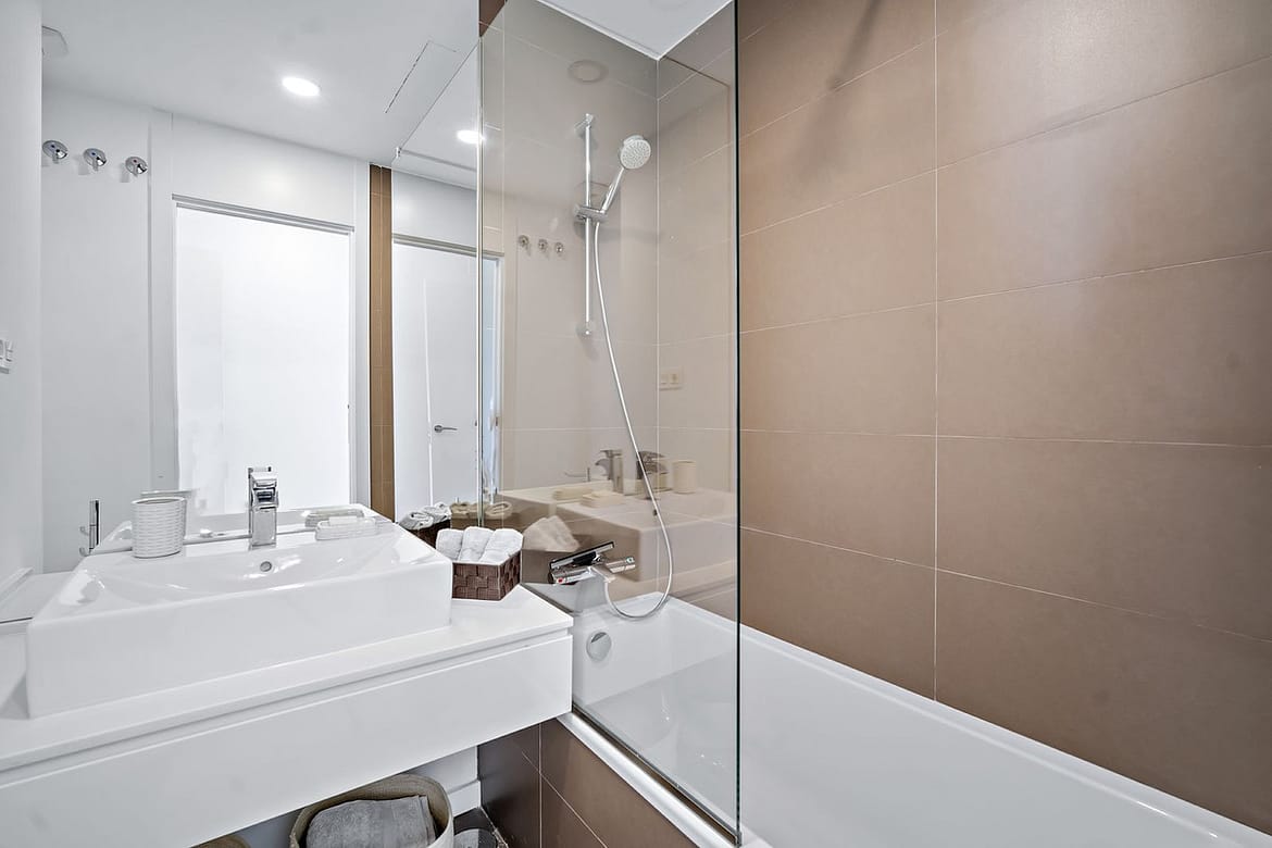 Guests have access to the communal pool and sunbathing areas staffed by a lifeguard during opening hours, as well as a private underground car parking spot, two private terraces with a barbeque, dining area, and sofa seating outdoors.