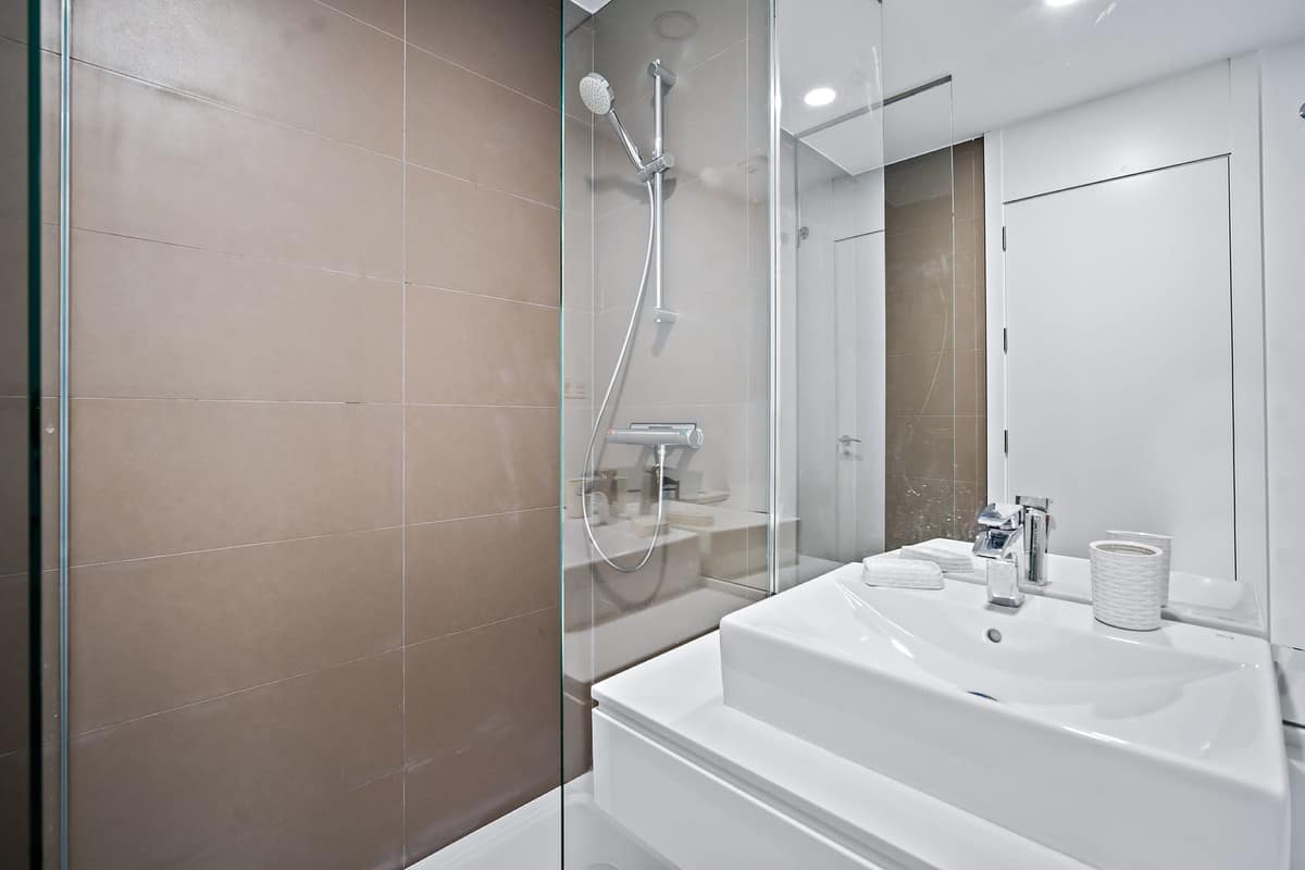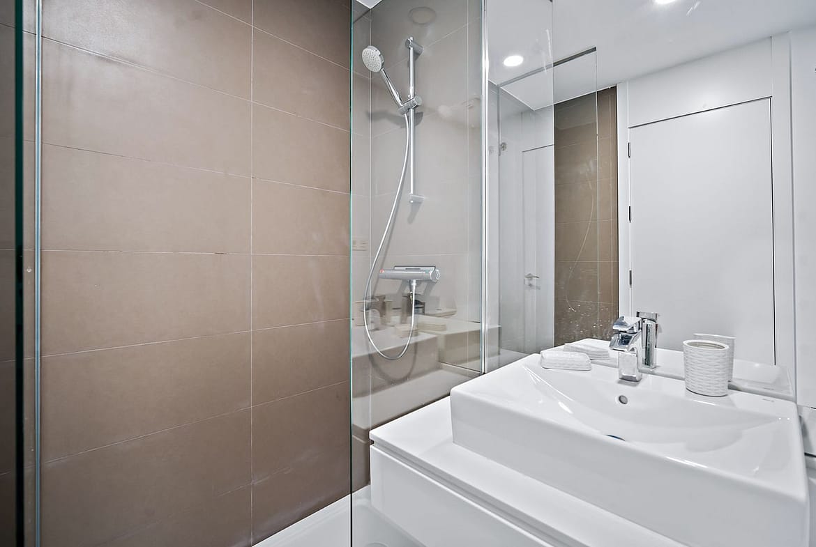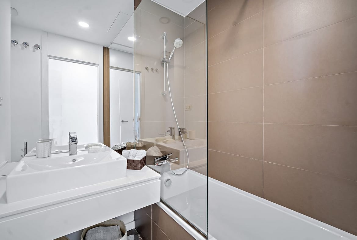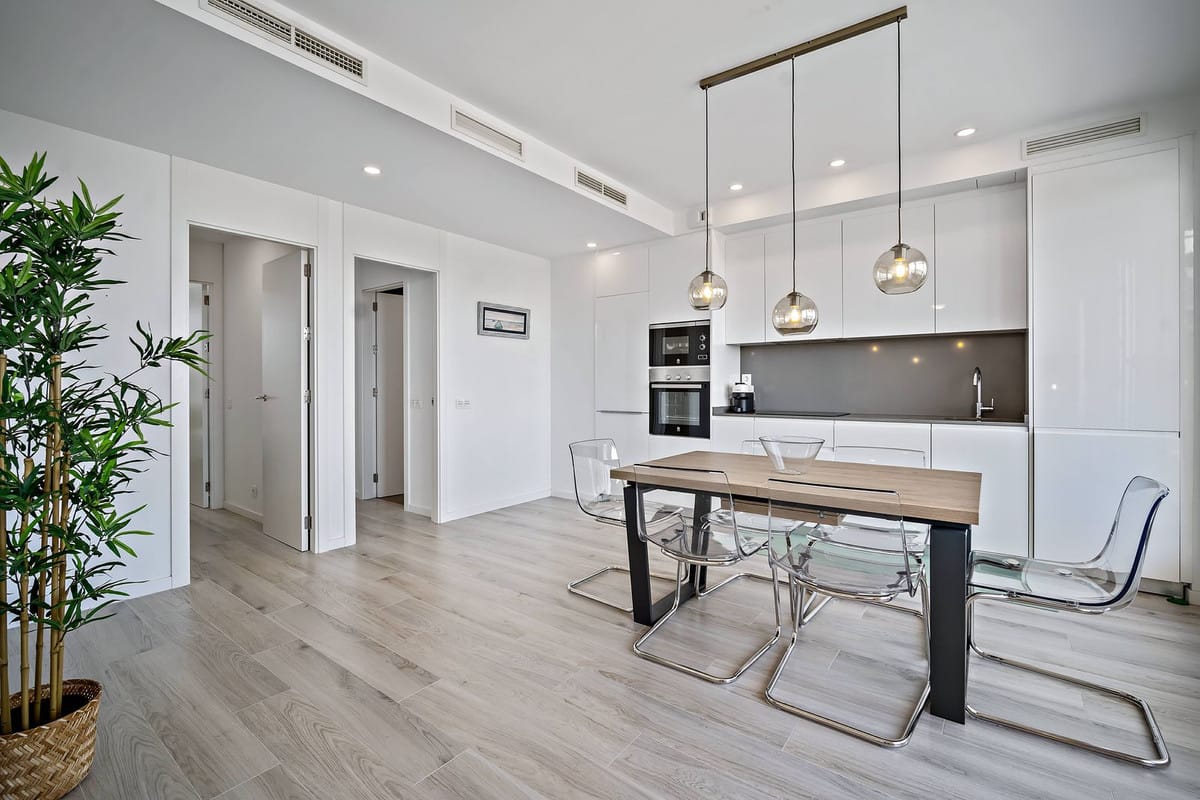 The second floor apartment is accessed by lift or stairs, and upon entering the light and open kitchen lounge and dining area, guests are greeted with open sea-views and wall-to wall windows to an excellent south-west-facing terrace. A well equipped kitchen has all the appliances you could need, right down to a Nespresso coffee machine!