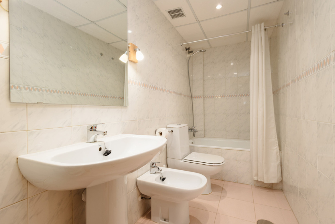The two bedrooms are practical and cozy. The master bedroom features a double bed, while the second has two single beds that can be joined to form a double. Both bathrooms have walk-in showers, sinks, and toilets, offering comfort and functionality.