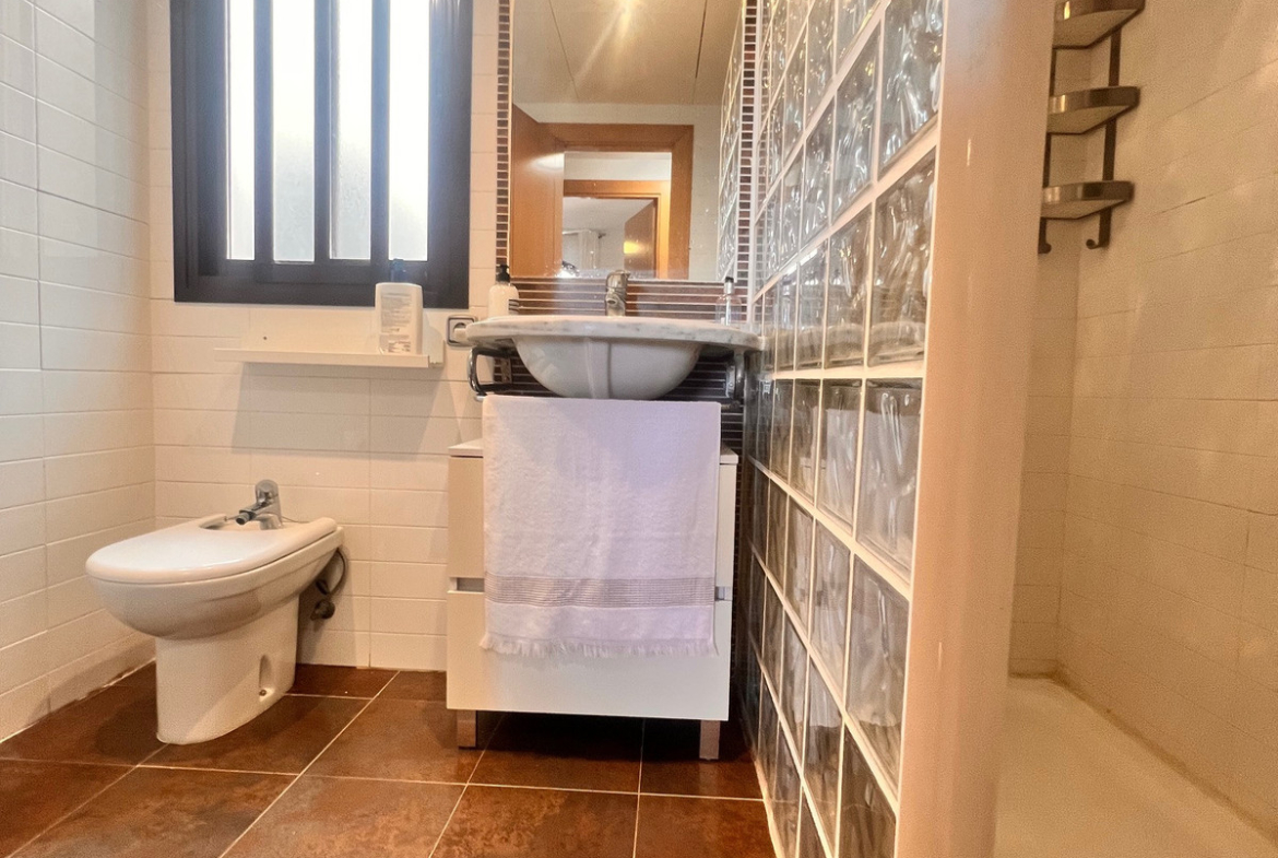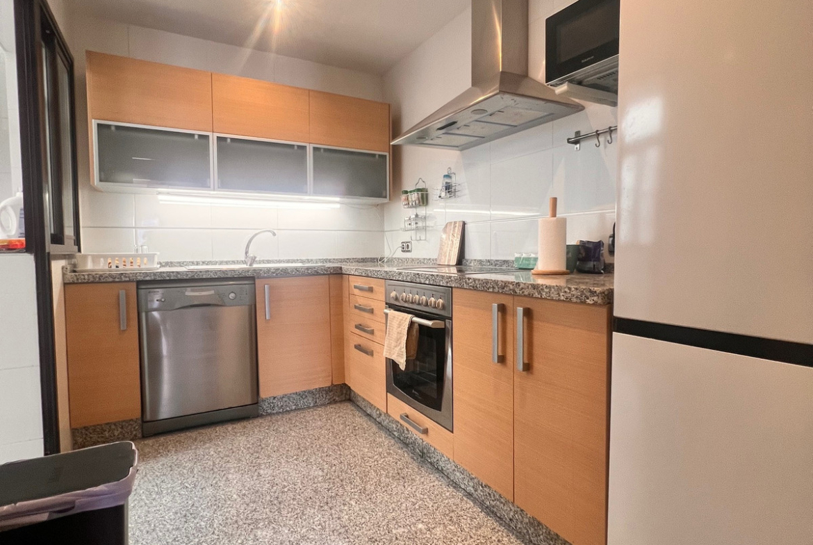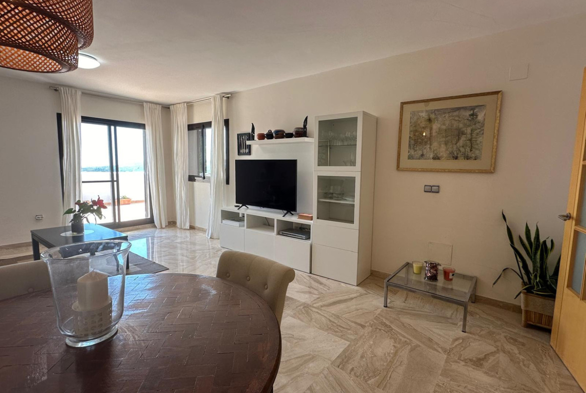 The bright living room with dining area opens onto a large terrace with stunning views of the Mediterranean Sea – the perfect spot to relax and enjoy the sunsets. The kitchen is fully equipped, combining functionality with style.