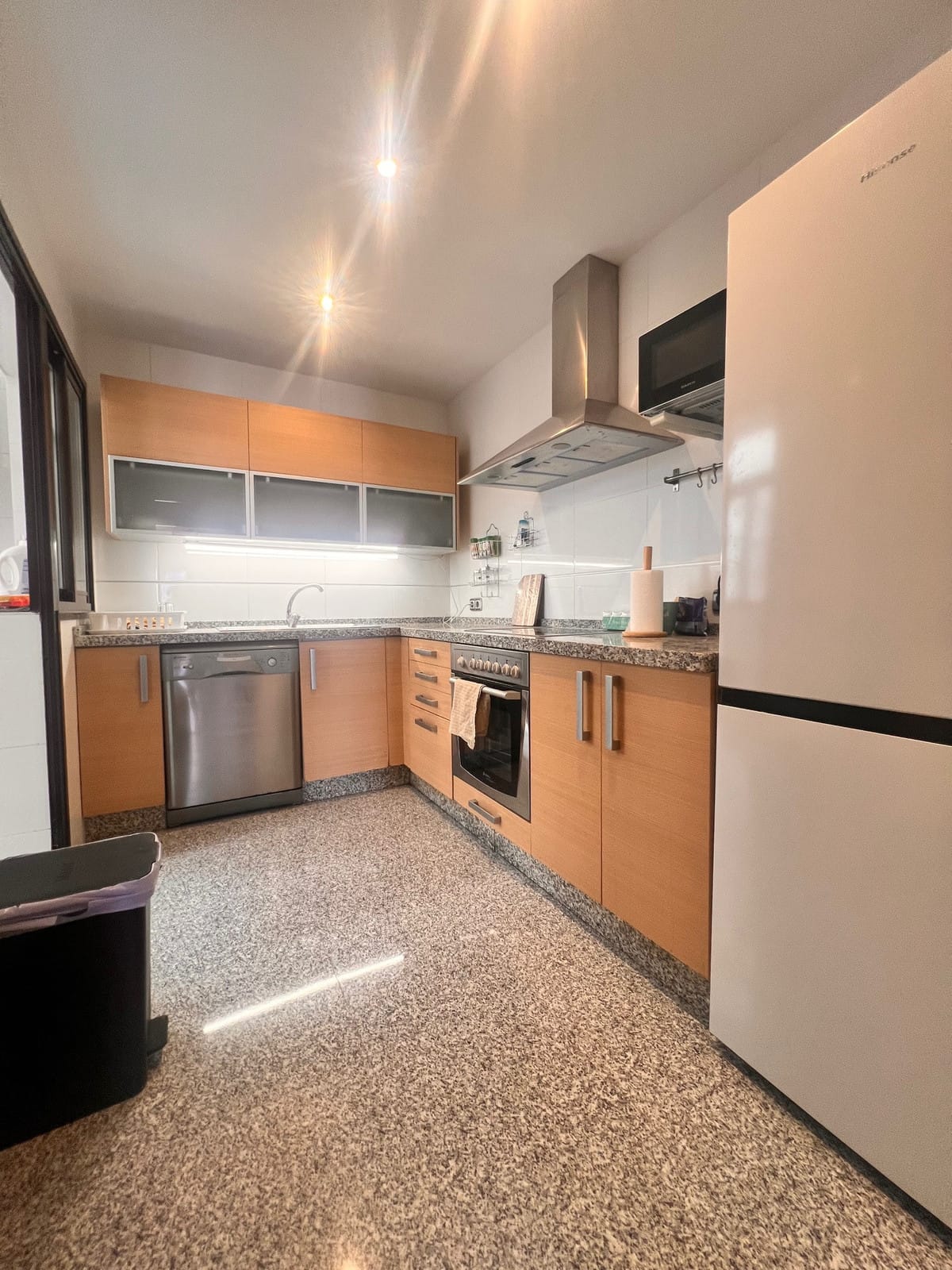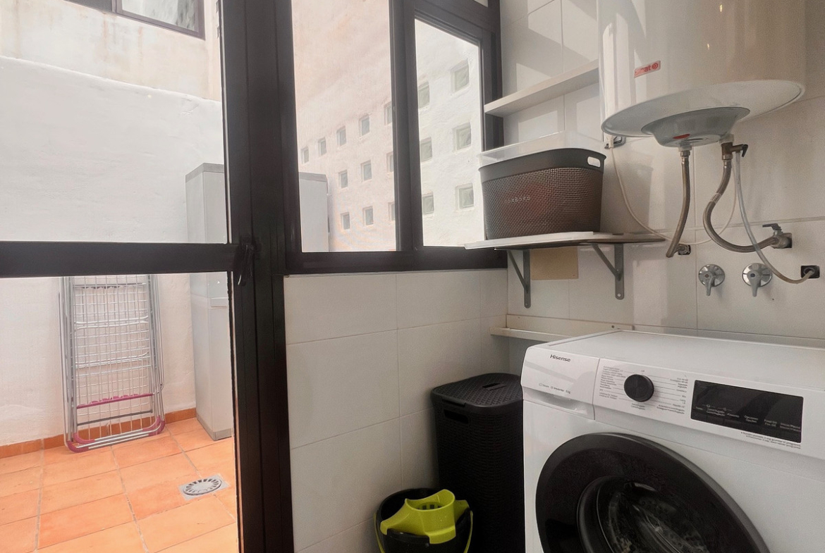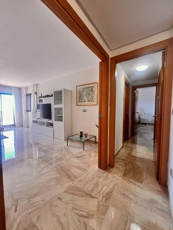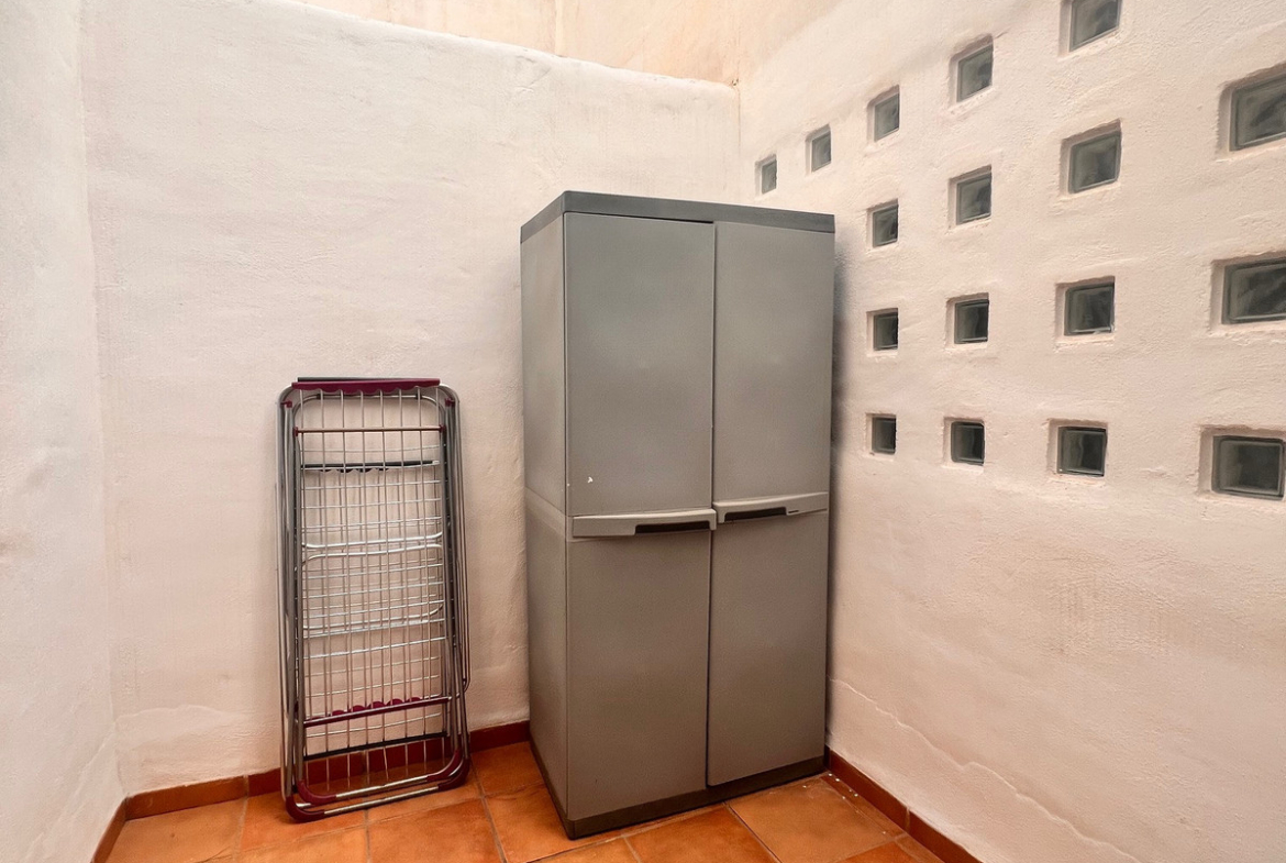 The bright living room with dining area opens onto a large terrace with stunning views of the Mediterranean Sea – the perfect spot to relax and enjoy the sunsets. The kitchen is fully equipped, combining functionality with style.