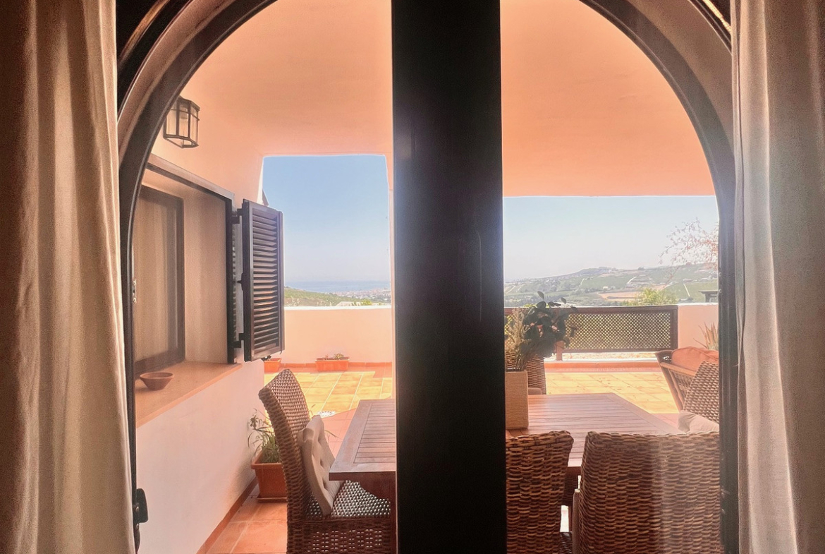 The residence is set in a quiet and well-maintained area, surrounded by golf courses and nature, yet close to the beaches of Casares Playa, Estepona, and all amenities.