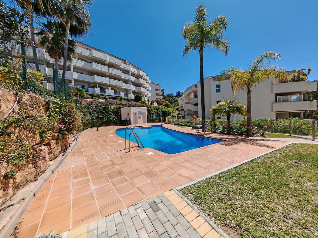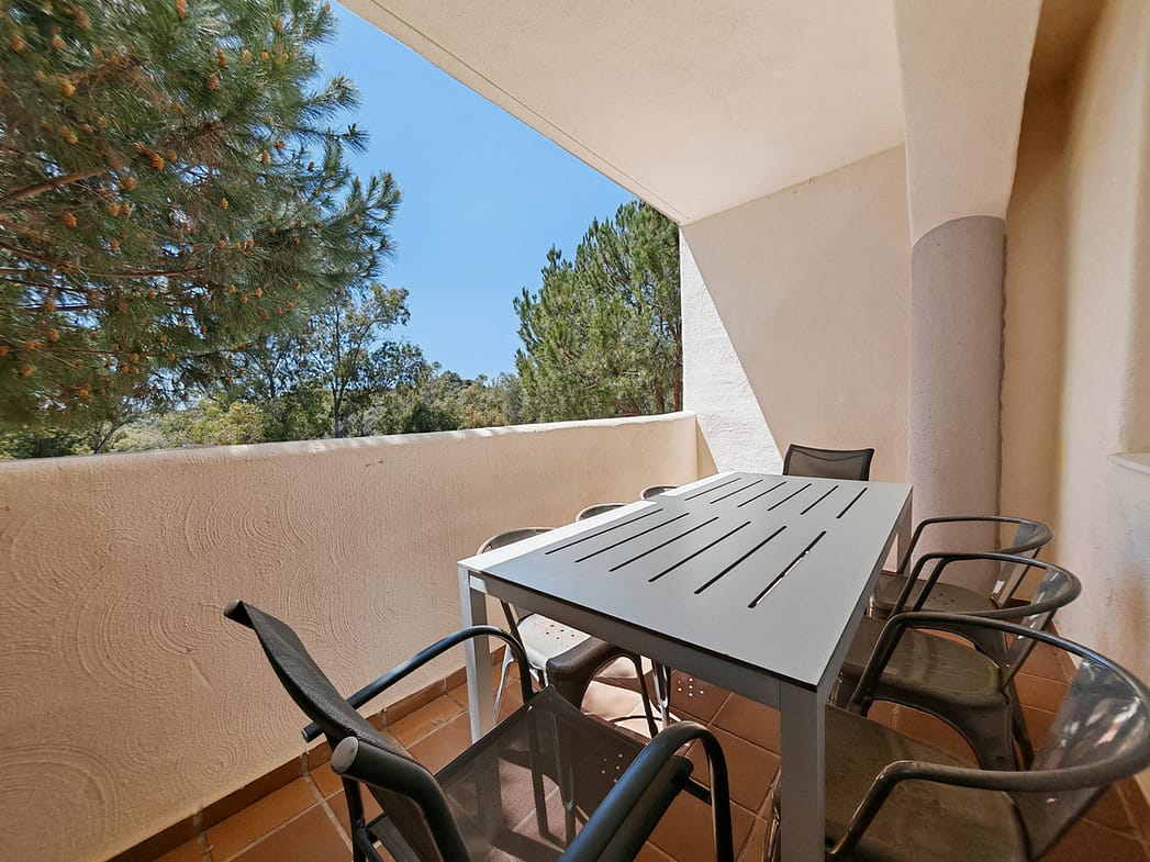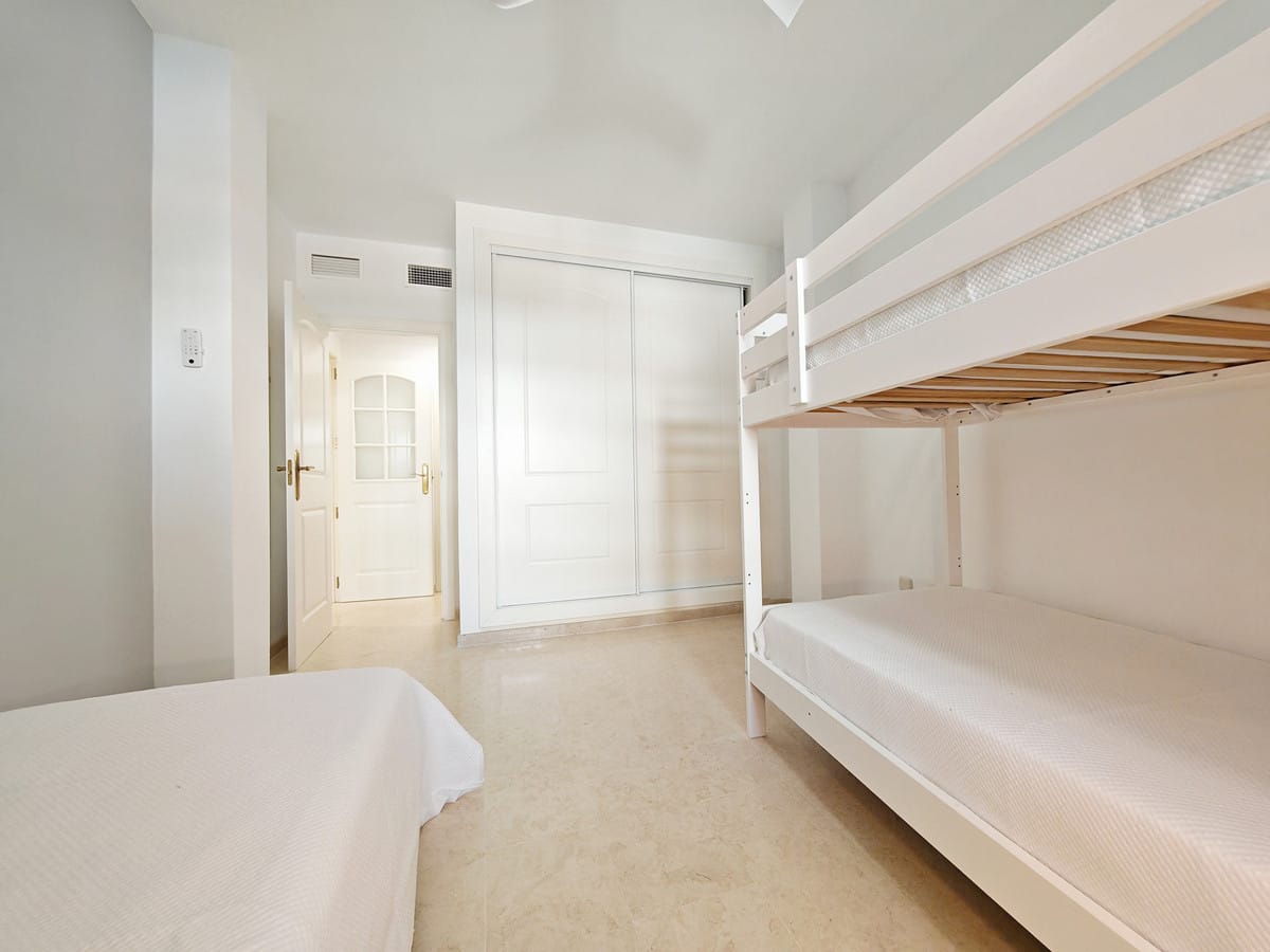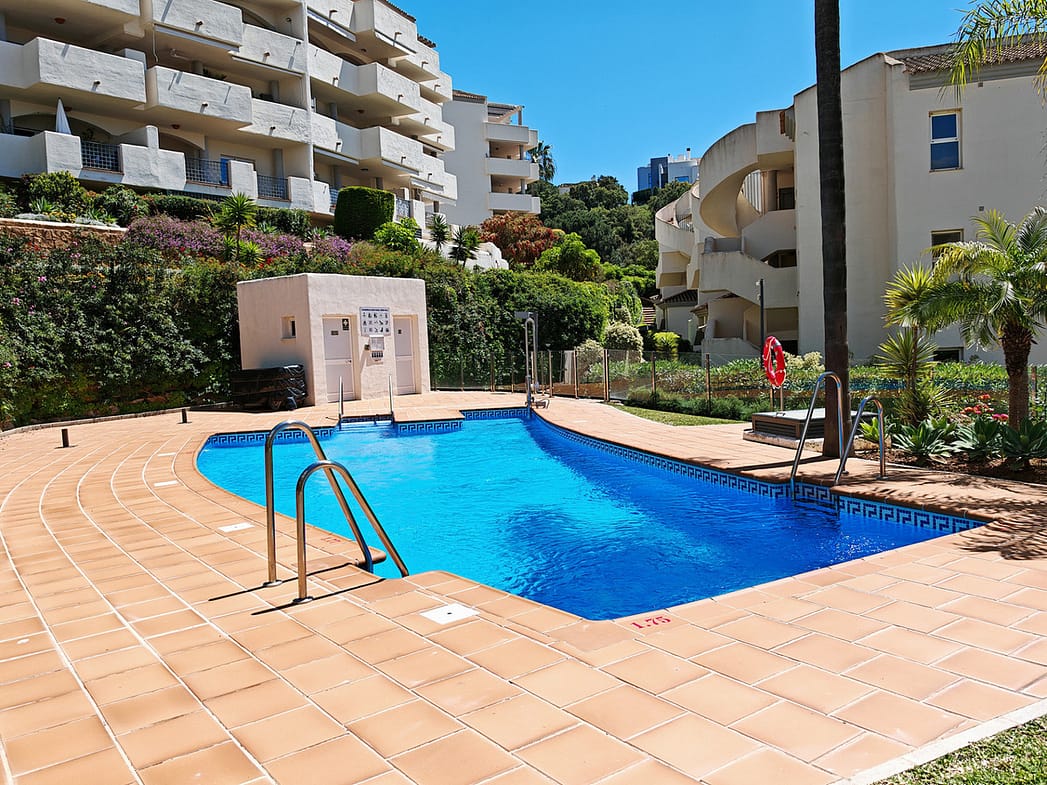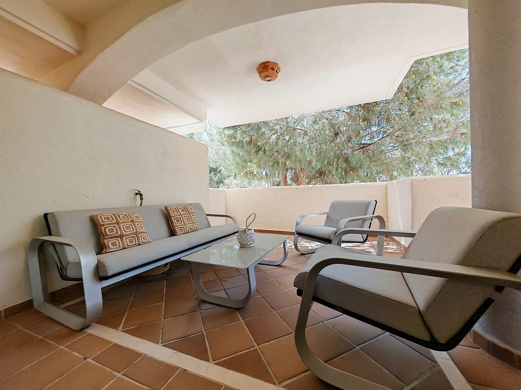 Apartment for rent in Elviria, Marbella with 2 bedrooms, 2 bathrooms, 1 on suite bathroom and with orientation south/west, with communal swimming pool, communal garage (1 parking spaces) and communal garden. Regarding property dimensions, it has 123 m² built and 16.25 m² terrace. Has the following facilities amenities near, air conditioning, fully furnished, fully fitted kitchen, marble floors, private terrace, kitchen equipped, water tank, country view, indoor pool, laundry room, internet – wi-fi, covered terrace, fitted wardrobes, gated community, lift, close to sea / beach, close to golf, balcony, excellent condition, ceiling cooling system, close to town, close to schools, surveillance cameras, inside golf resort and close to restaurants.