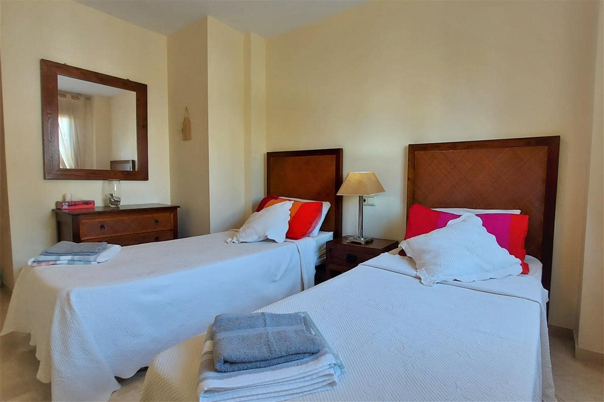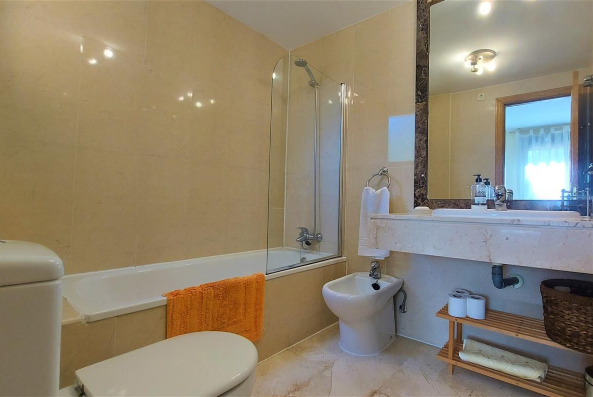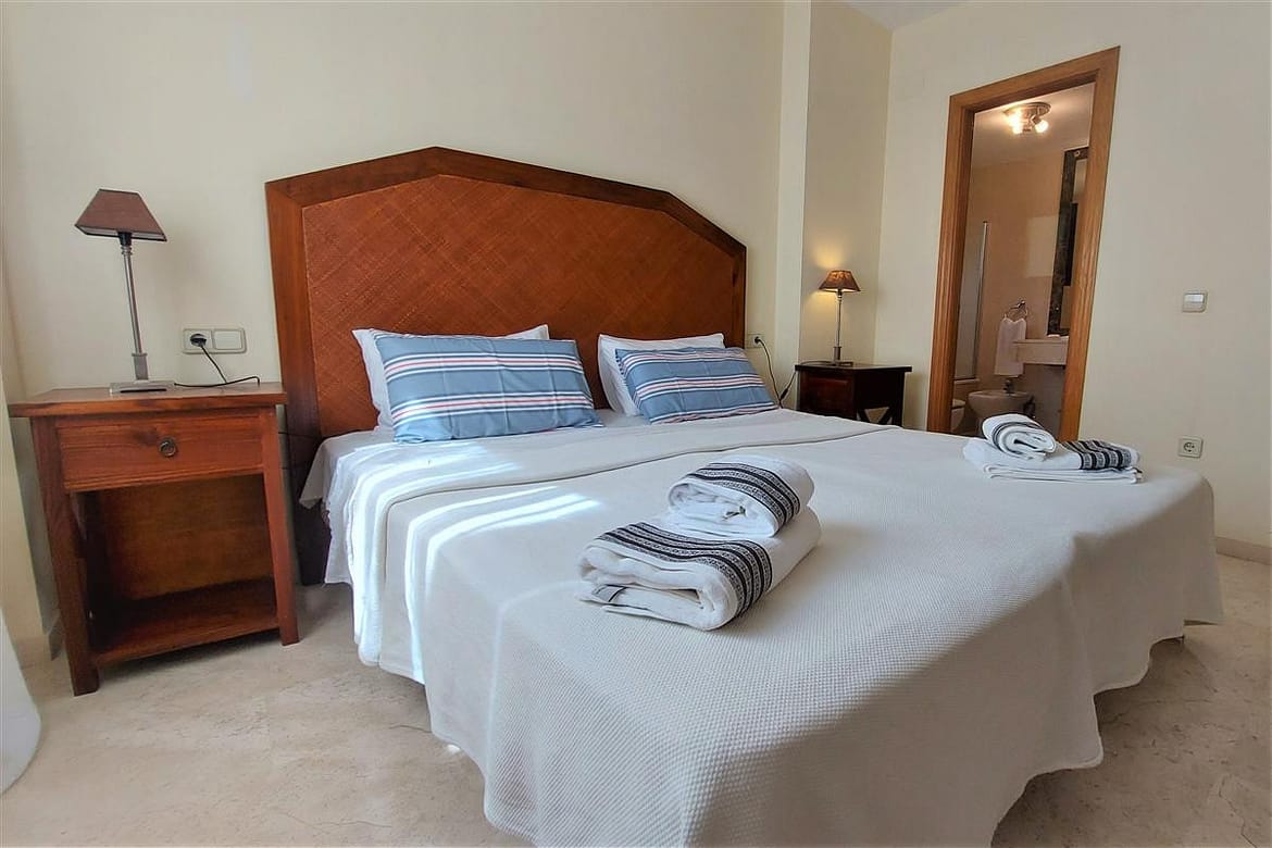 A modern apartment located on the popular development of Terrazas de Costalita, a beautiful and private complex on the beach-side of the Cancelada exit, only a 10 minute drive from Estepona town. This lovely second floor apartment has two bright and spacious bedrooms, two bathrooms, a lounge area and a quality fully fitted kitchen with balcony. The modern kitchen is very well equipped with all you may need for your holiday along with a laundry area with washing machine. There is also a breakfast bar for four guests in the kitchen. From the kitchen we head onto the dining area and lounge with comfortable quality sofas and a flat screen TV with dvd and international streaming TV channels including Sky. The apartment also provides a high speed fiber optic connection throughout the apartment. The lounge has direct access to the south west facing balcony with a lovely view over the community gardens and swimming pool. A spacious en-suite master bedroom with two single beds set up together to form a super king size bed and the second bedroom is a twin. Both bedrooms provide plenty of storage space in its built-in wardrobes. Both bathrooms in the apartment are equipped with bath, over head shower, WC, bidet and hand basin. Located on a second floor, this property is fully air conditioned and offers private parking in the underground garage. The secure community has beautiful and well-maintained gardens with tropical and Mediterranean plants and a large community swimming pool with separate children’s pool and a local bar. There is direct access to the local beach which makes this property the perfect option for your family holiday.