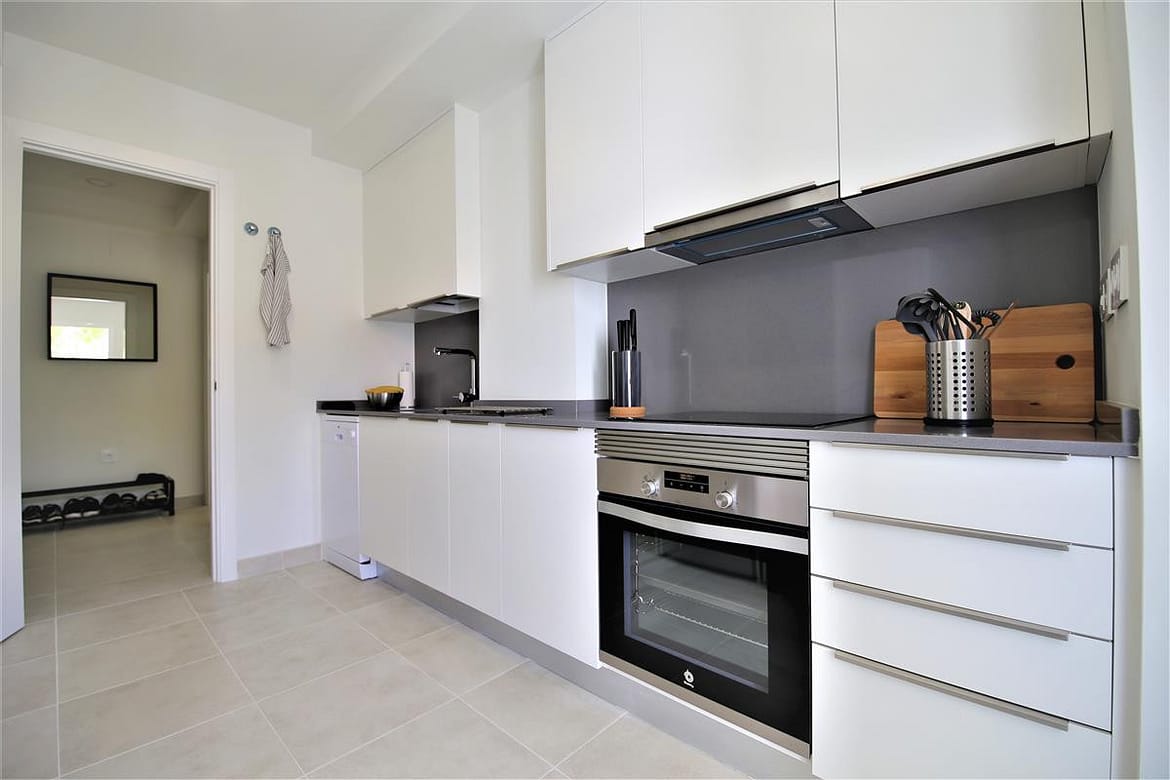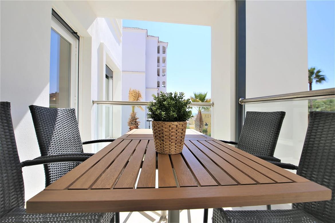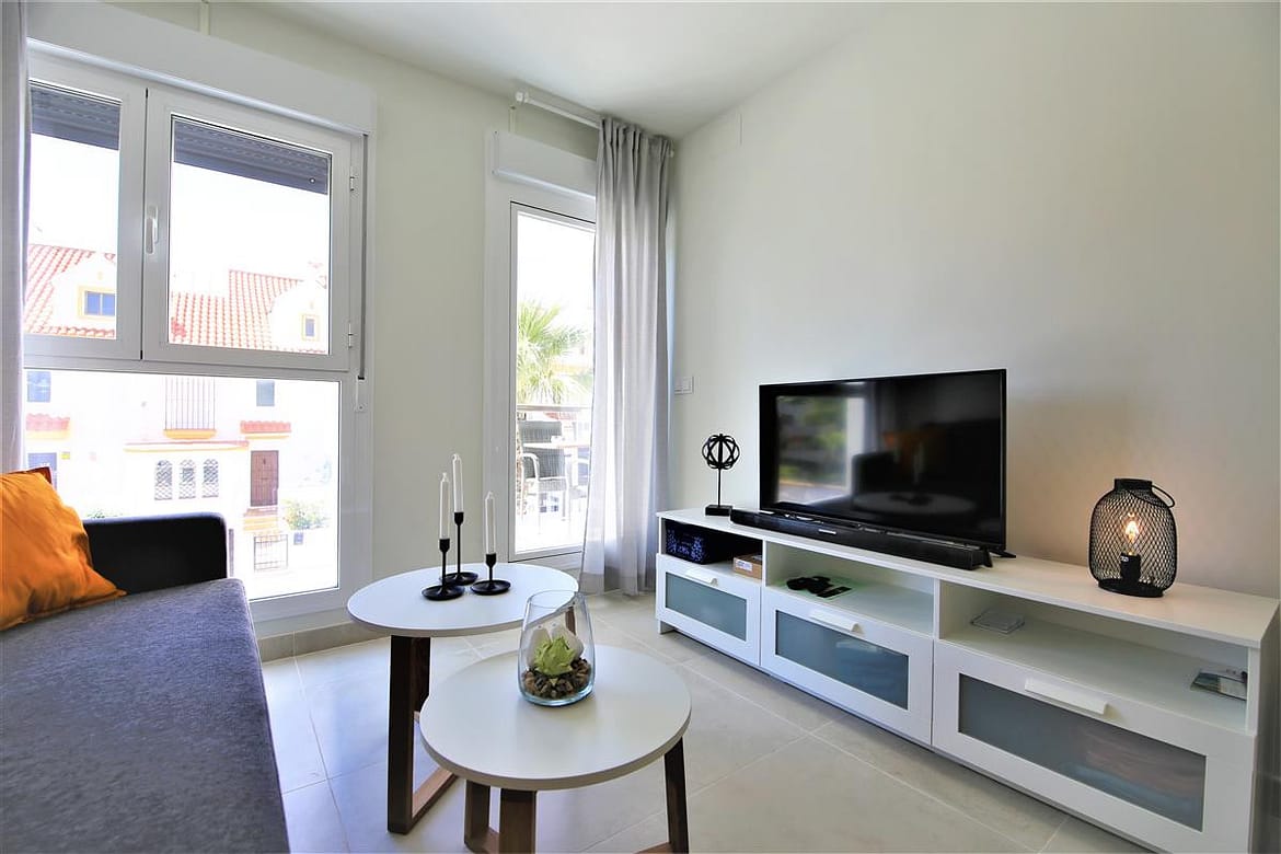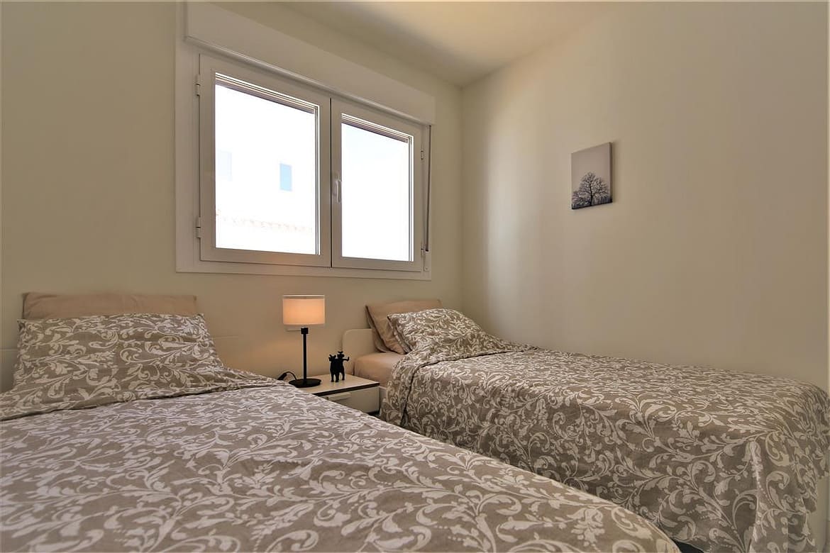 This very modern apartment is about a 10-12 minute walk from the marina of Estepona. It offers two bedrooms and two bathrooms and a spacious balcony for outside dining or sun bathing. It is perfect for families due to the location and amenities. In the master bedroom, with its king-size bed and plenty of wardrobe space, you'll find the en-suite bathroom with its modern feel and white suite comprising of bath with hand-held shower, hand basin, WC and bidet. The smaller twin bedroom has two single beds and uses the family shower room with shower cubicle, hand basin and WC. The kitchen has all mod cons, including a small dishwasher, three ring cooking hob, oven and microwave. There is also a separate laundry area with washing machine. On the south-west facing balcony you’ll find a dining set for four guests, it is surrounded by glass panels to make it feel even more spacious. The lounge comprises of a dining table with four chairs, a comfortable three seater sofa and a flat screen television with its international multi-channel system, offering British, French, Dutch, German and Scandinavian languages. The apartment is fully air-conditioned with a new and efficient central system and has a high-speed fibre optic internet connection for your use. Within the urbanisation of Puerto Blanco, you'll find the large community swimming pool only a short walk from the property (around 200m). A car is not necessary but there is a private parking space in the secure underground car park if needed however the parking space is only suitable for small or medium sized cars. All in all, a great family holiday apartment.