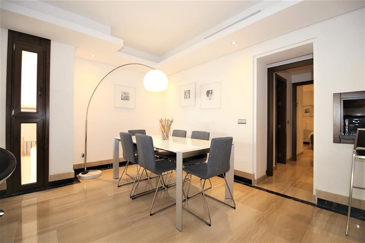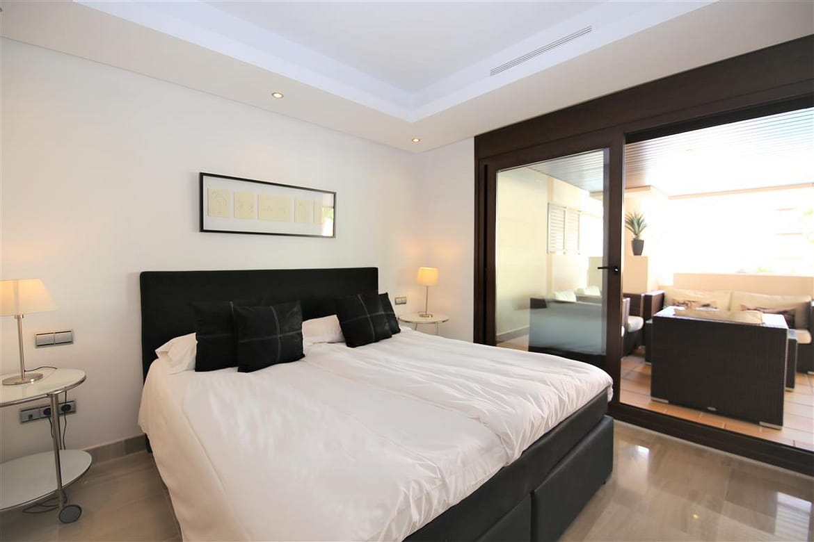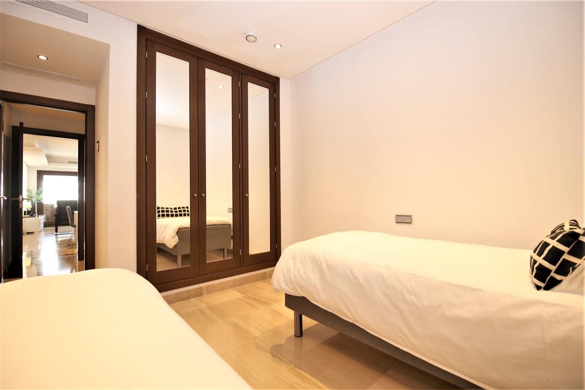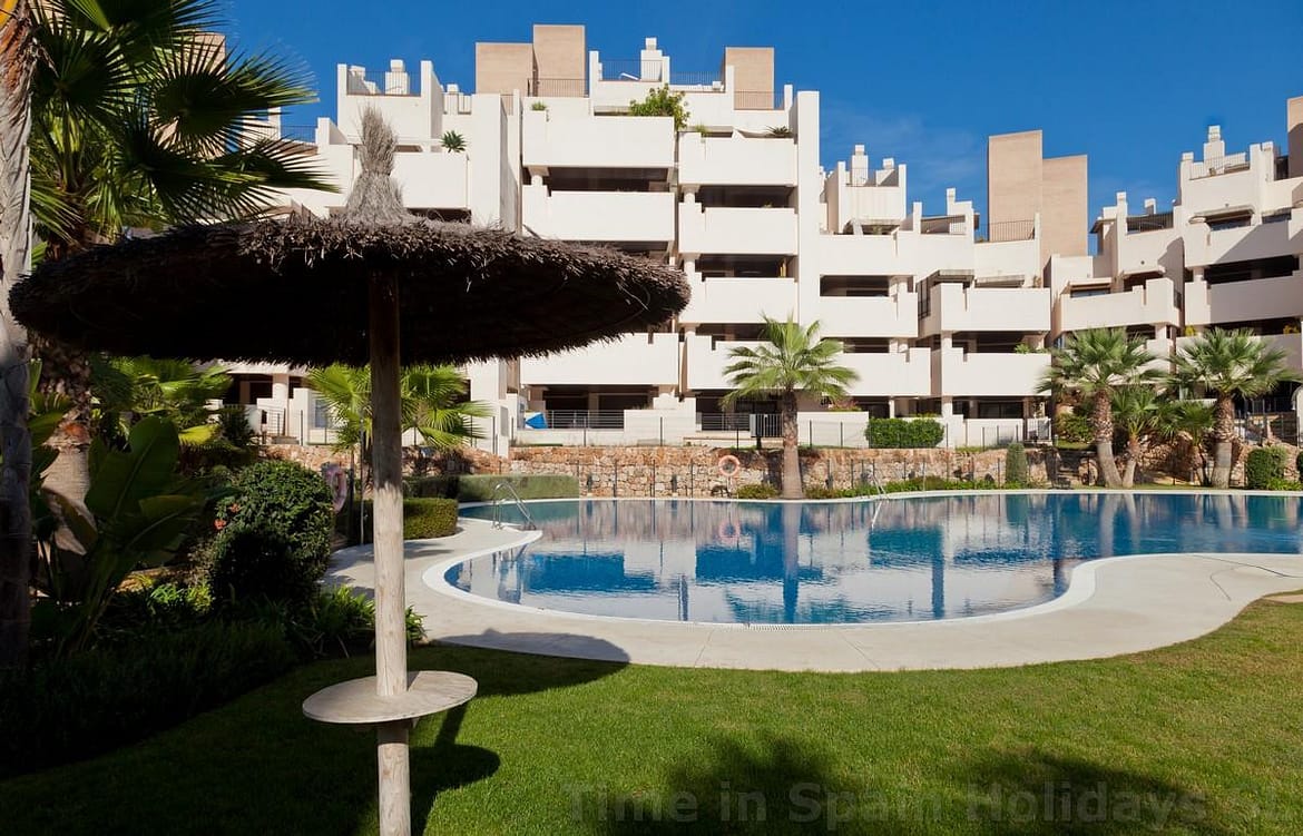 A fantastic, quality apartment located on a first floor in the popular urbanisation of Bahia de la Plata in Estepona. This elegant family apartment, with its tasteful decoration, offers comfortable accommodation for four guests. The property has two large bedrooms equipped with spacious built-in wardrobes and central air conditioning. The master bedroom offers a comfortable, king size bed and also has an elegant en-suite bathroom. The bathroom has a bath with over-head shower, double hand basin, WC and bidet, it is also equipped with underfloor heating (only available during the winter months). The second bedroom has two single beds and a modern en-suite bathroom with walk-in shower, hand basin, WC and bidet. The modern kitchen is fully equipped with high-end appliances and also has a small laundry room with a washing machine and mini fridge. The kitchen has a small breakfast bar for two with bar stools, which connects to the living-dining area. The spacious living room is very well presented and offers a dining area for up to six guests and a seating area with comfortable sofas and a flatscreen TV with a high speed fiber optic internet connection and international channels such as Sky. The lounge has direct access to the large south west facing balcony through the sliding doors. From here you have great views towards the inviting communal swimming pool and lovely gardens. The balcony is equipped with two sun loungers, an outdoor dining area for four guests and a relaxer/sofa area with comfortable seating for six. The community features two large pools with separate children's pool and direct access to a secluded beach and promenade. The community also has a well equipped spacious gym, paddle court and spa including indoor pool, Jacuzzi, sauna and steam room. A private parking space is also available in the underground communal garage along with plenty of street parking just outside the urbanisation. In general, due to the location and the qualitiy of this apartment, there is no doubt that this is the perfect accommodation for your family holidays in Estepona on the Costa del Sol.