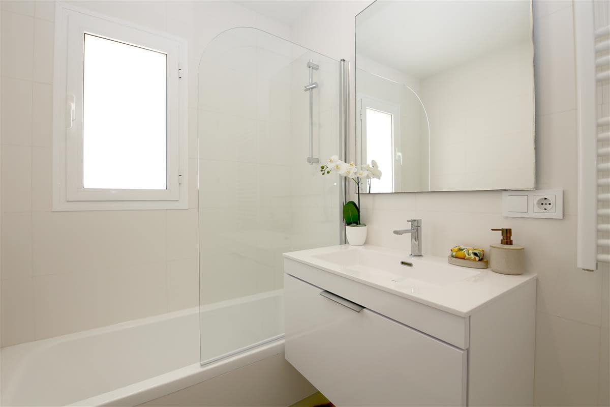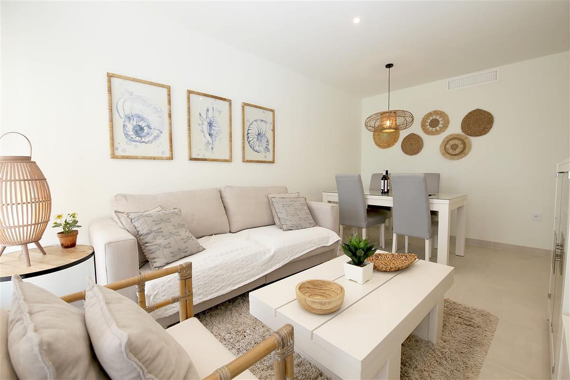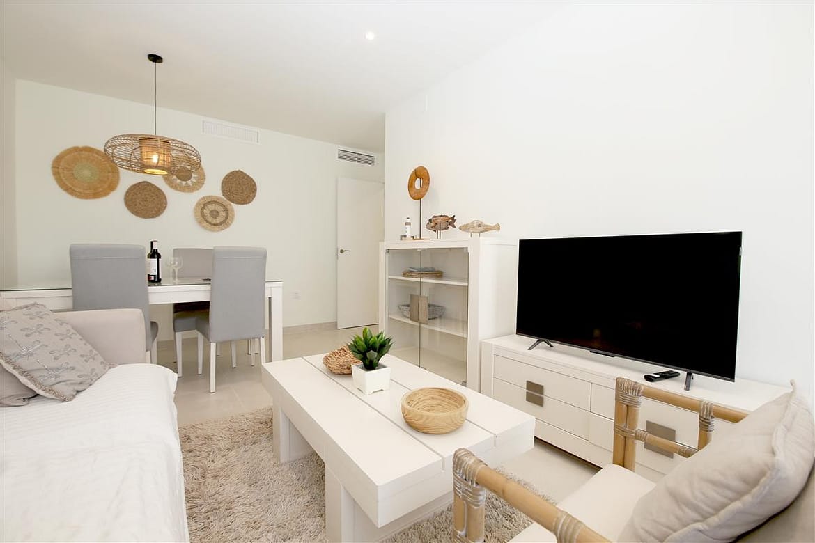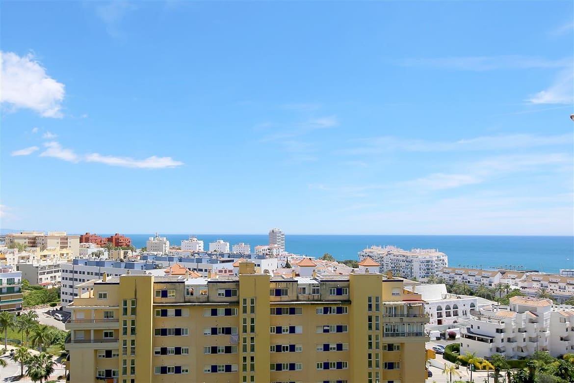 A stylish and modern apartment only a short walk to Estepona port. This lovely property has two bedrooms and two bathrooms offering comfortable accommodation for up to four guests, ideal for families due to its location and amenities. The master bedroom, with its king size bed (160x200cm) and ample closet space has an en-suite bathroom with a modern feel, consisting of a bath with over-head shower, hand basin, WC, and bidet. The second bedroom has two single beds (90x200cm) and uses the family bathroom with a walk-in shower, hand basin and WC. The kitchen is equipped with most appliances, including a small dishwasher, three-ring hob, oven, microwave/grill combo, fridge freezer, toaster, espresso machine and kettle. There is also a separate laundry area with washing machine for your use. The south-east facing balcony features a dining table and chairs for alfresco dining, surrounded by glass panels to make it appear even more spacious. The living room consists of a dining table with four chairs, a comfortable sofa, an additional armchair, and a flatscreen Smart TV with international TV including Sky. The apartment is fully air conditioned with a new and efficient central heating/cooling system and has a high speed fibre optic connection for your use throughout the property. Within the Puerto Blanco residential complex, you'll find the large communal pool just a short walk from the property (approximately 250m). A car is not necessary, but there is private parking in the secure underground garage if needed however the parking space is only suitable for small or medium sized cars. All in all, a great apartment for families, retirees, golf lovers or couples.