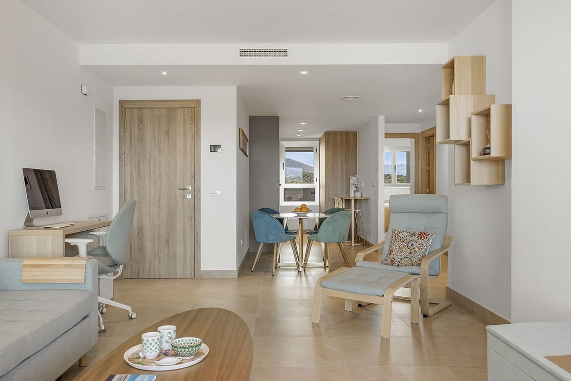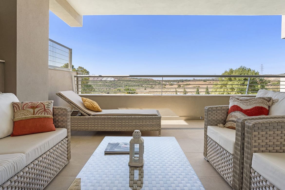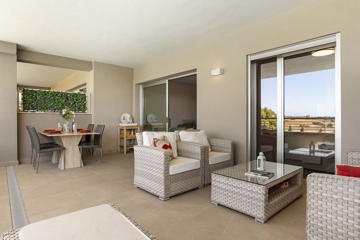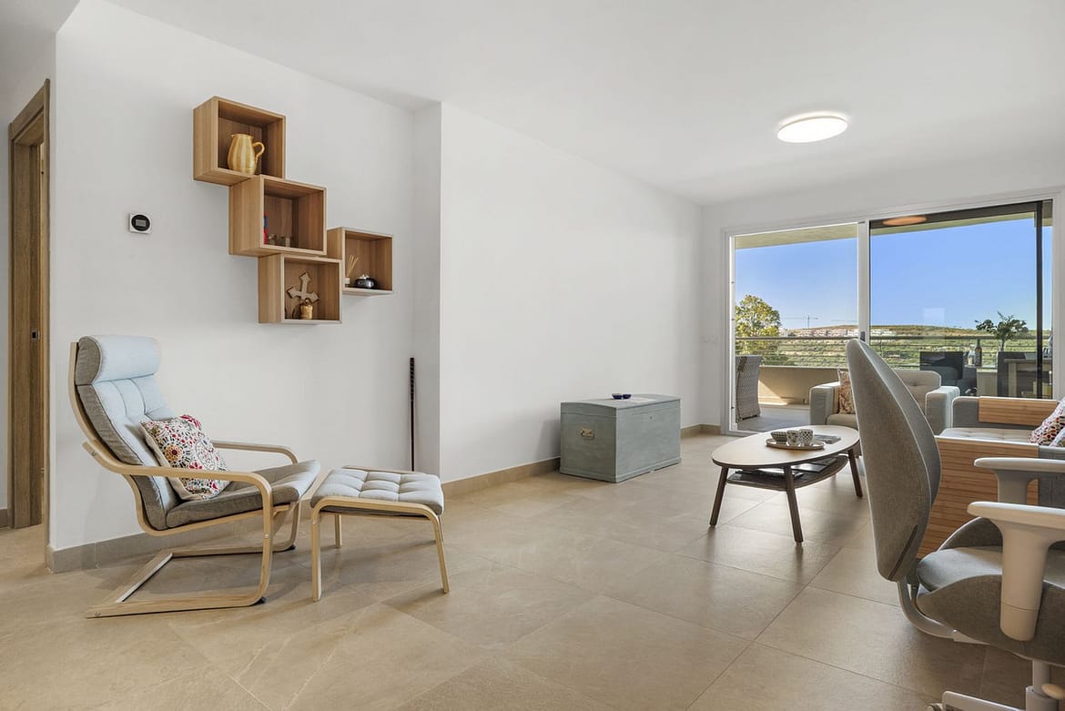 A large terrace with panoramic views of the golf course and surrounding mountains extends your living area outdoors – ideal for morning coffee, reading, or simply soaking up the Mediterranean light.