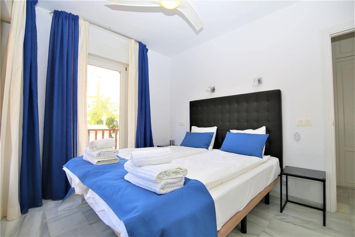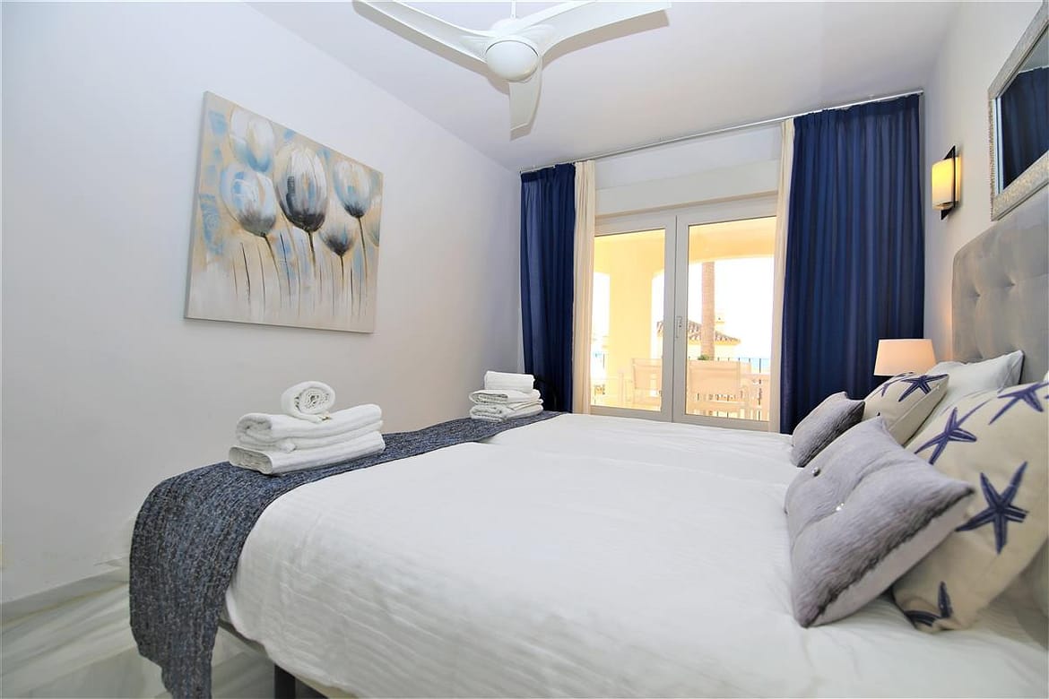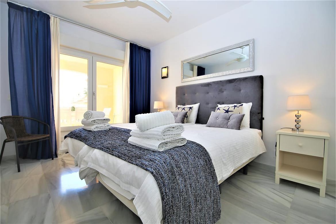 Fantastic stylish apartment perfect for small families or couples wanting to stay right next to the beach, close to Estepona port and town centre. It has two bedrooms, two bathrooms, a living room, a fully fitted kitchen and three balconies. This apartment has a high speed fibre optic WIFI connection and air-con units in all bedrooms and living room. The master bedroom has two single beds that can zip together to form a king size bed, with en-suite bathroom and balcony access. The second bedroom has a king size bed and also balcony access facing the street. The en-suite bathroom to the master bedroom has shower, bidet and toilet and also has radiating floors. The second en-suite bathroom provides a bath and overhead shower. The main south facing balcony area has a dining table for six guests ready to enjoy the morning sun and also a sunbed available. The living area has a dining table and seating for four guests and a high speed internet connection with an international TV streaming package for the 55" flat screen is also available. A fully fitted kitchen along with dishwasher and washing machine ready for your use. The urbanisation is small and very nicely built, well maintained with nice gardens and a large swimming pool available all year round. You may use the BBQ area next to the community swimming pool for an extra 10eur paid on arrival along with a communal Wifi connection. There is also secure parking spaces available inside the urbanisation and also direct access to the beach.