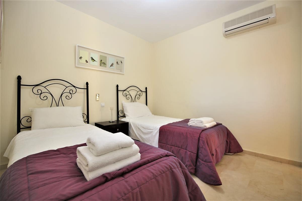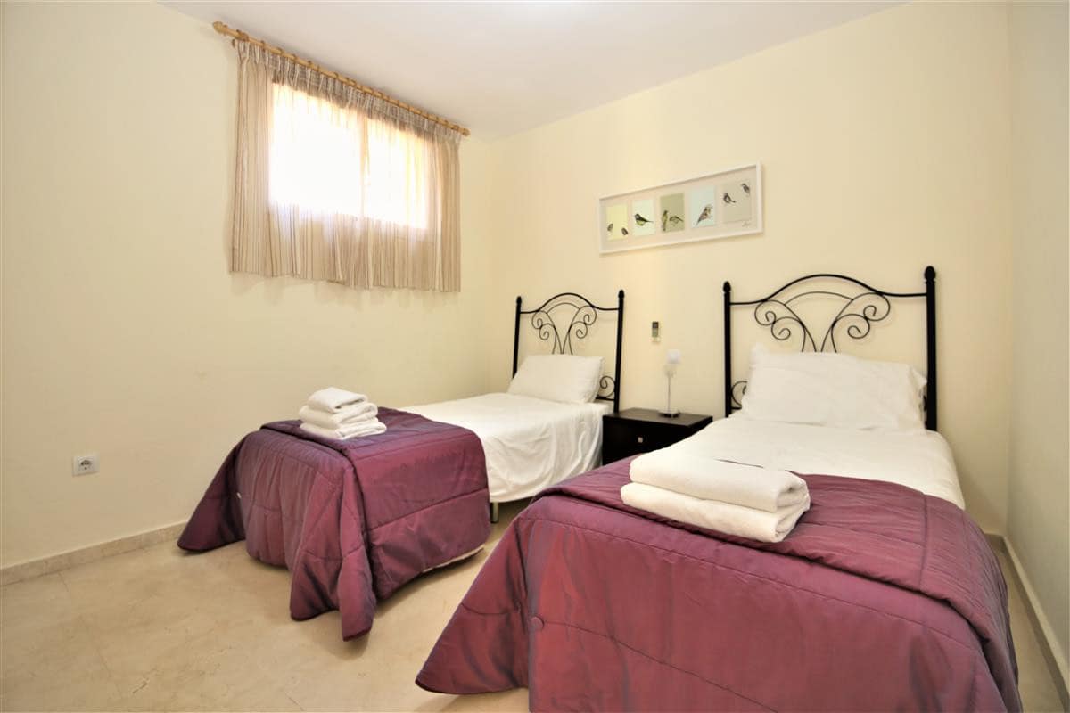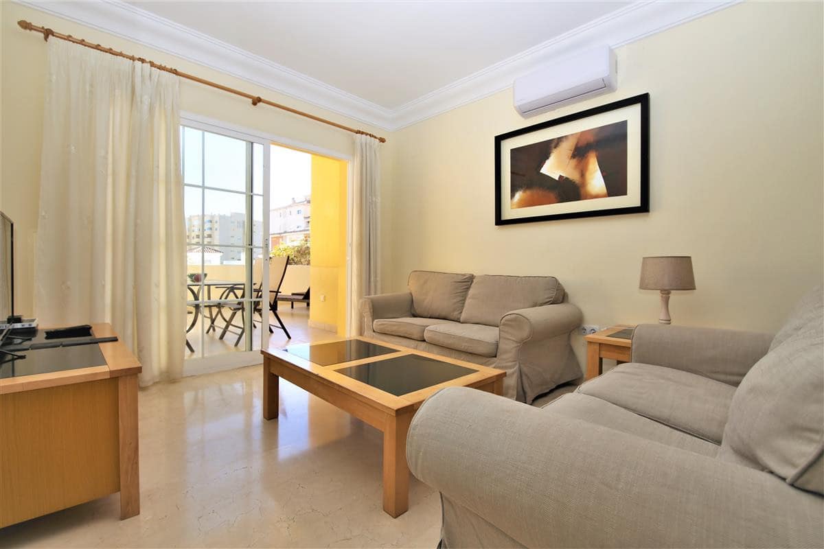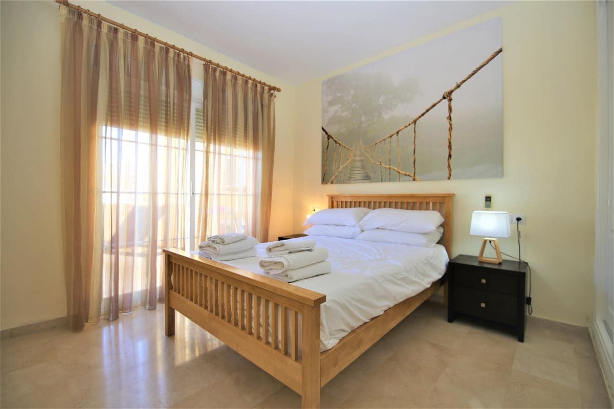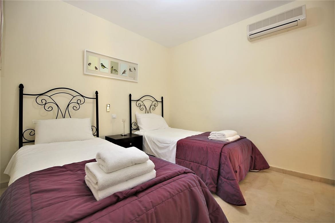 This lovely air-conditioned apartment with two bedrooms and two bathrooms offers comfortable accommodation for up to four guests. It is located very near to Estepona marina, only a five minute walk with its restaurants, bars, cafes and supermarkets. Two beaches – Playa la Rada and Playa del Cristo are within a seven minute walk. The apartment comprises of a double bedroom with en-suite bathroom and access to the balcony plus a twin bedroom which uses the family shower room. The contemporary styled lounge/diner has comfortable seating for four guests and offers a flat screen television with a high speed fibre optic connection plus full British TV including Sky and several international channels. From the lounge you have access to the large south facing balcony through sliding patio-style doors. On the balcony, with its partial views towards the harbour, you'll find comfortable exterior dining for four, with an umbrella for shade, along with two sun loungers. The kitchen has all mod cons such as dishwasher, washing machine, fridge freezer and oven. The community provides two swimming pools and it only offers street parking around the urbanisation. All in all, a very comfortable property near to everything that you could require for your family holiday in Estepona!