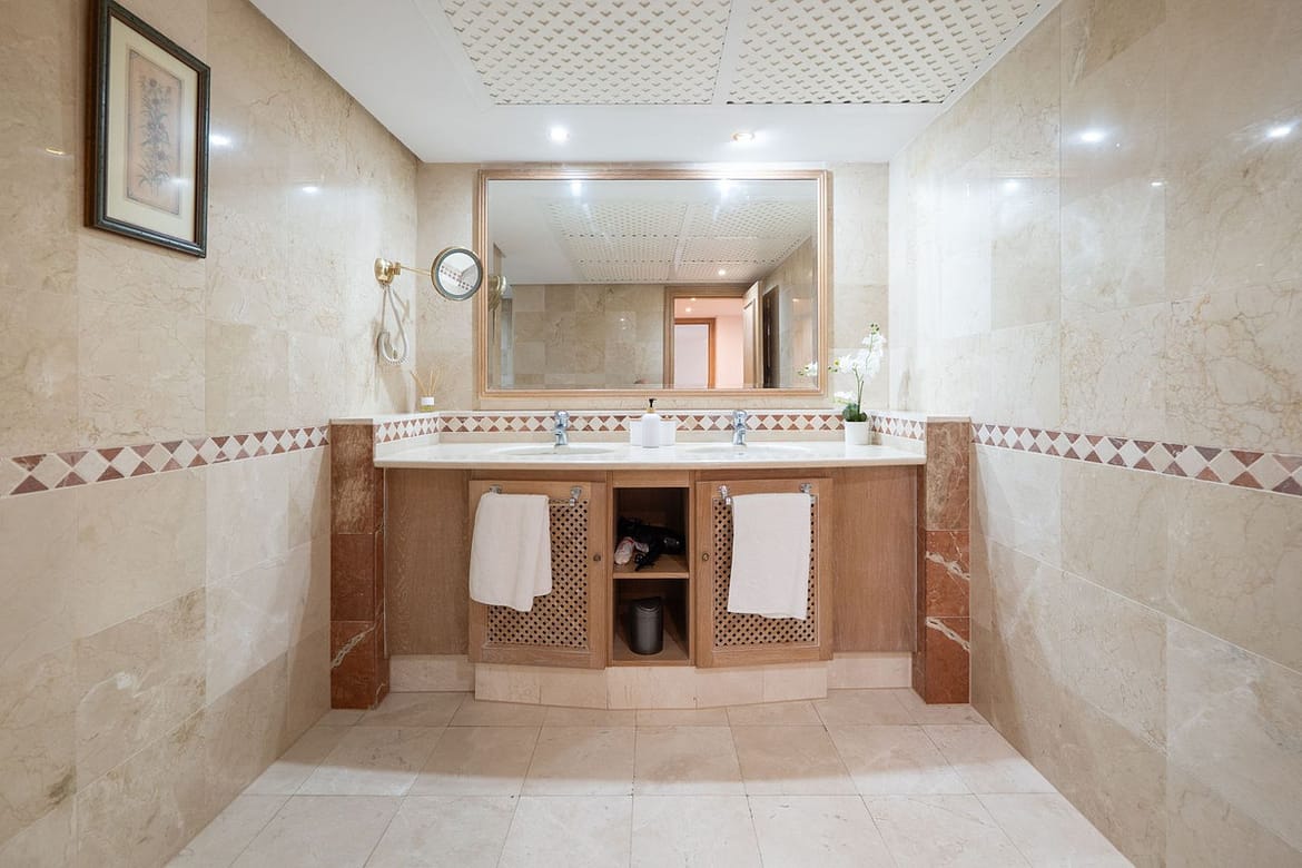 This elegant apartment offers two spacious bedrooms, each with its own en-suite bathroom and large walk-in wardrobes, ensuring comfort and privacy. A separate guest bathroom is also available. The modern kitchen comes fully equipped with top-quality appliances and is complemented by stylish furnishings, as the property is rented fully furnished.