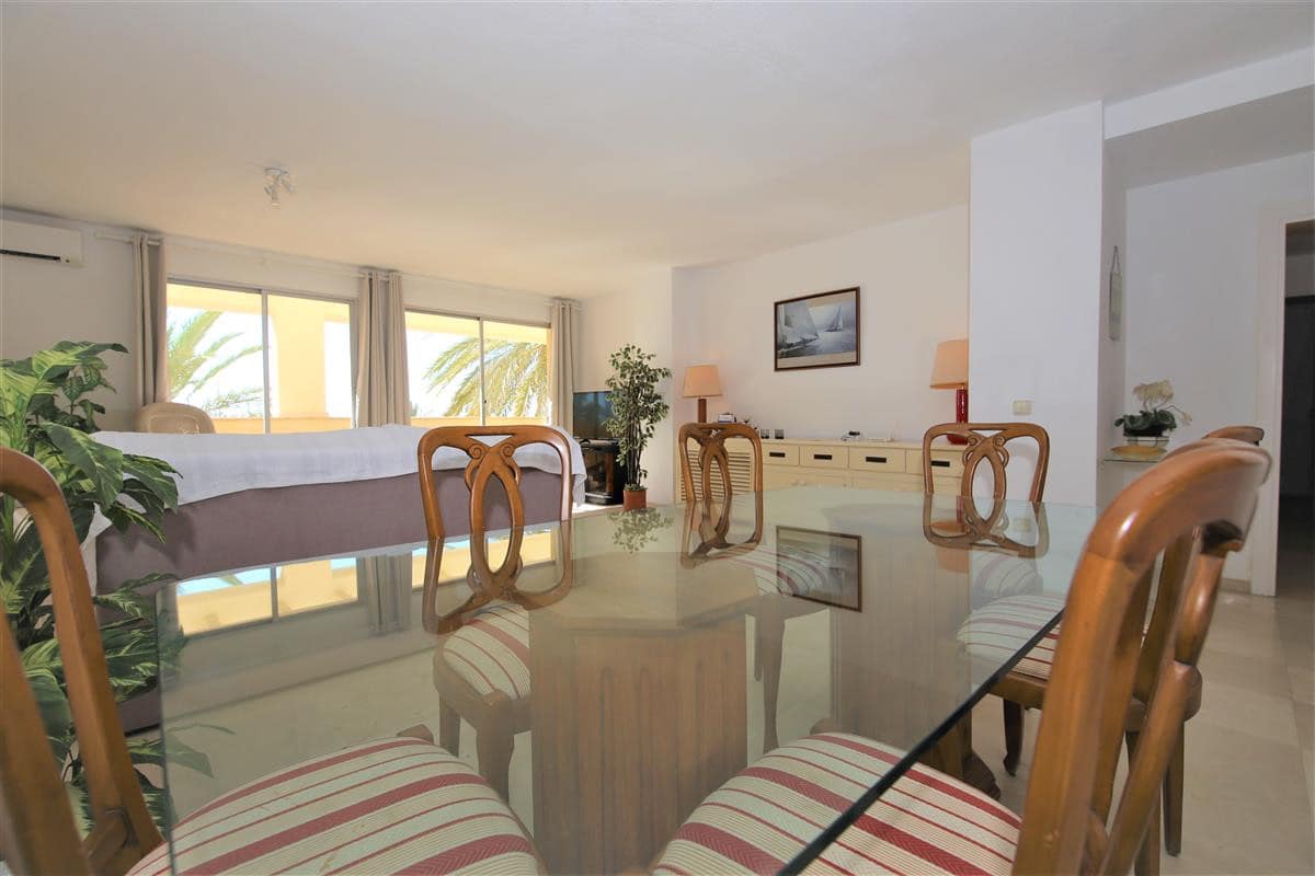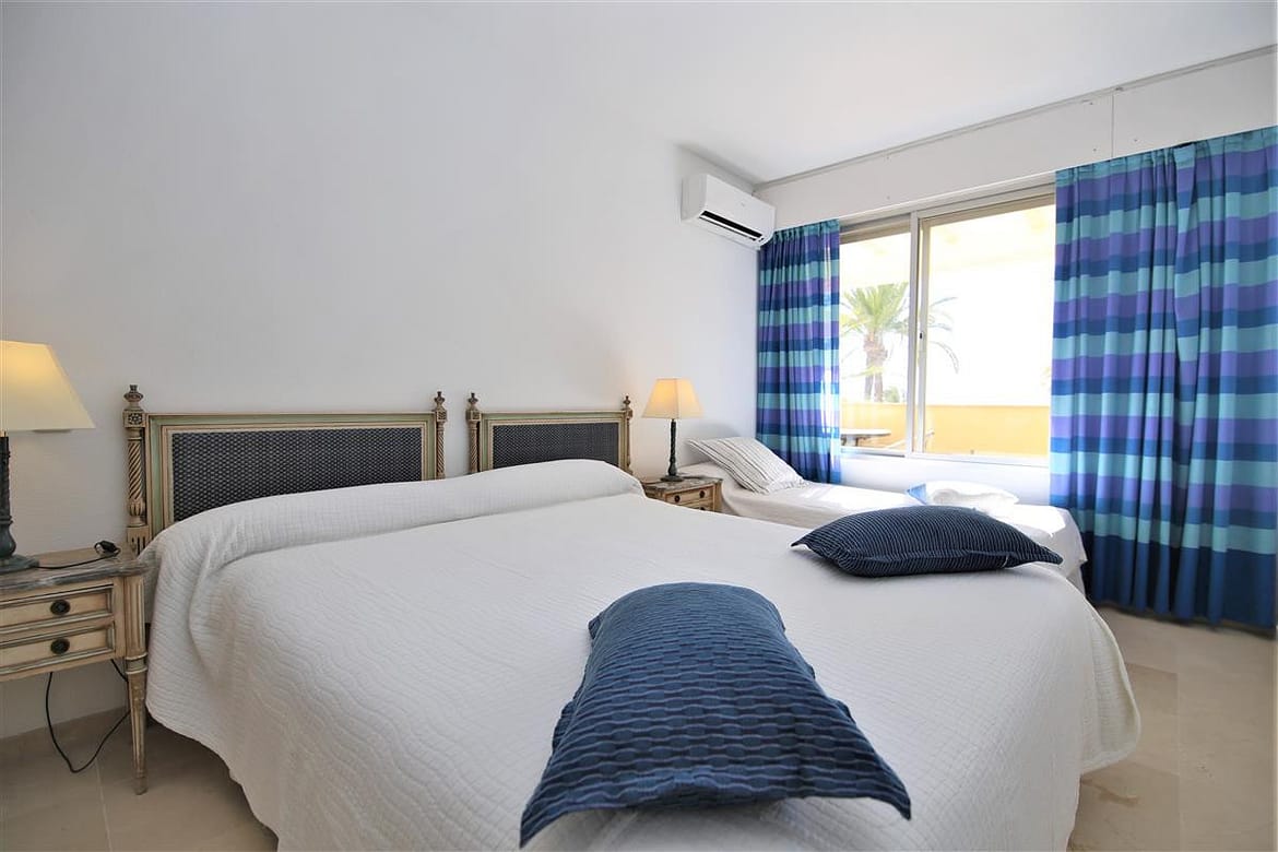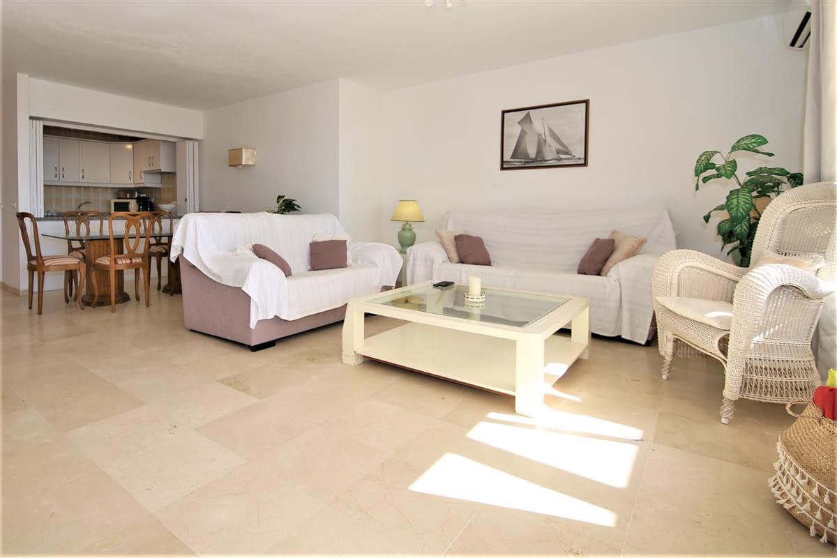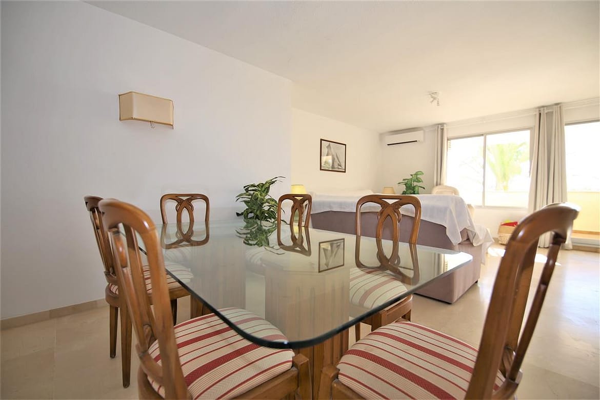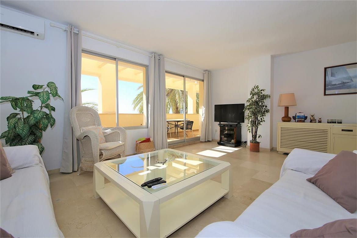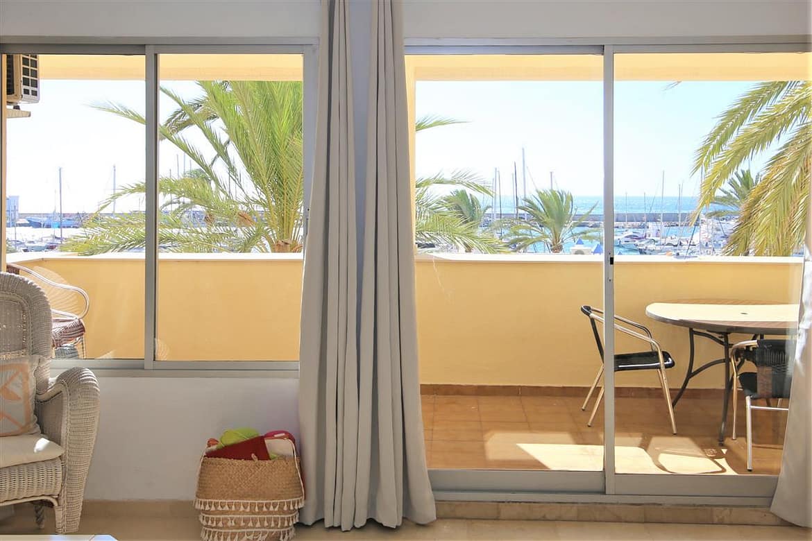 A lovely south facing, front line apartment located in Estepona port. A good size ground floor property with two spacious bedrooms, two bathrooms a bright lounge-dining area and kitchen. The master bedroom has a king size bed and a completely renovated en-suite bathroom with shower, WC and hand basin. It also has a dressing area with spacious built-in wardrobes. The master bedroom has air conditioning and direct access to the south facing balcony. The second bedroom has a king size bed and an extra single bed with beautiful views to the sea through the balcony. There is another renovated family shower room with shower, WC and hand basin. The large and bright lounge area leads out onto the long balcony which runs along the front of Estepona marina. It has two sun loungers and an extra outdoor dining area with space enough for six guests. The lounge offers comfortable sofas and an independant air conditioning system. A high speed Wifi internet connection is available and the TV offers plenty of British channels (Sky) plus Dutch, Russian, German, French and Scandinavian channels. Spanish TV is all provided by the digital terrestrial broadcast. The kitchen is fully equipped with all the appliances and is half-open to the dining area in the living room. There are two large swimming pools available in the urbanisation, one is set amongst landscaped gardens with a grassy area while the other is terraced around the pool. The property benefits from a private garaged parking space just 250 meters from the property in another urbanisation. There is also a communal parking area which operates on a first come, first served basis. The property would suit golfers, retirees and families. All in all, a highly recommended accommodation in Estepona port.