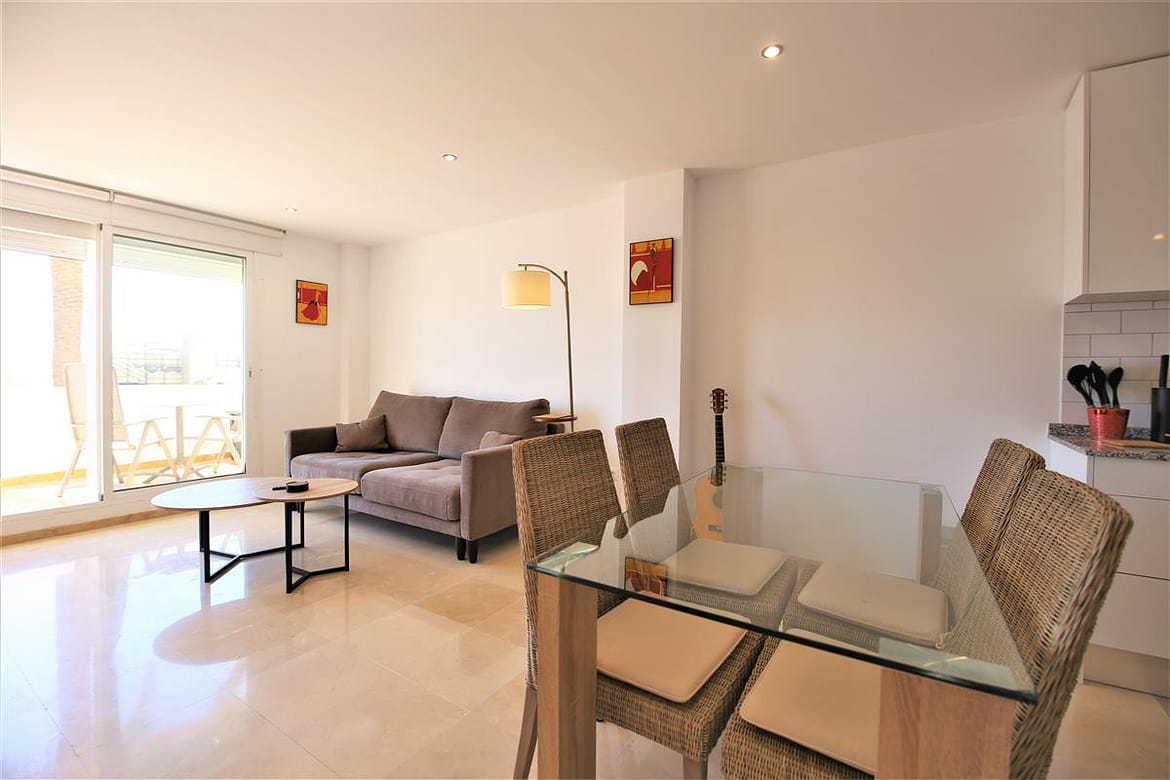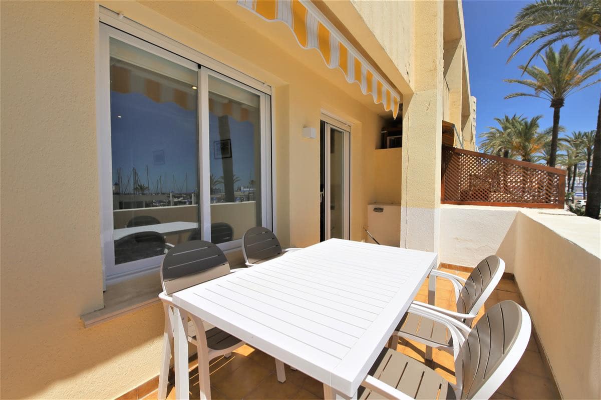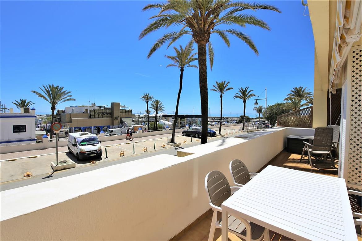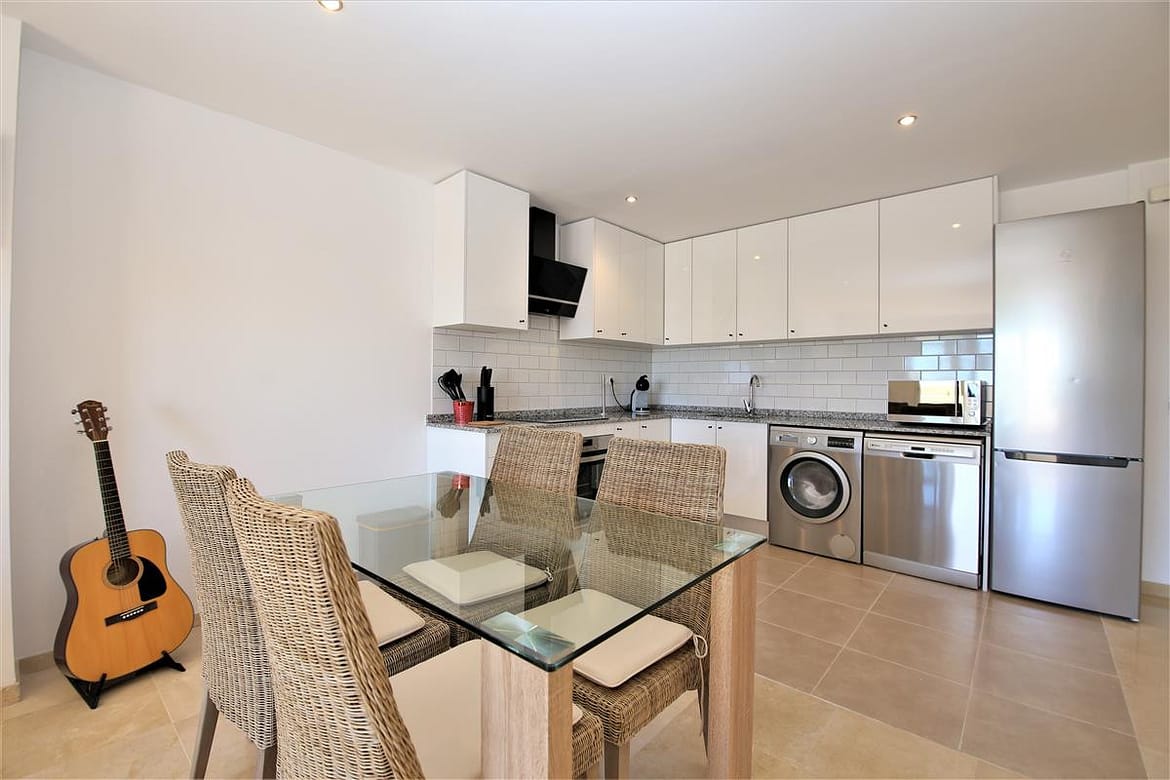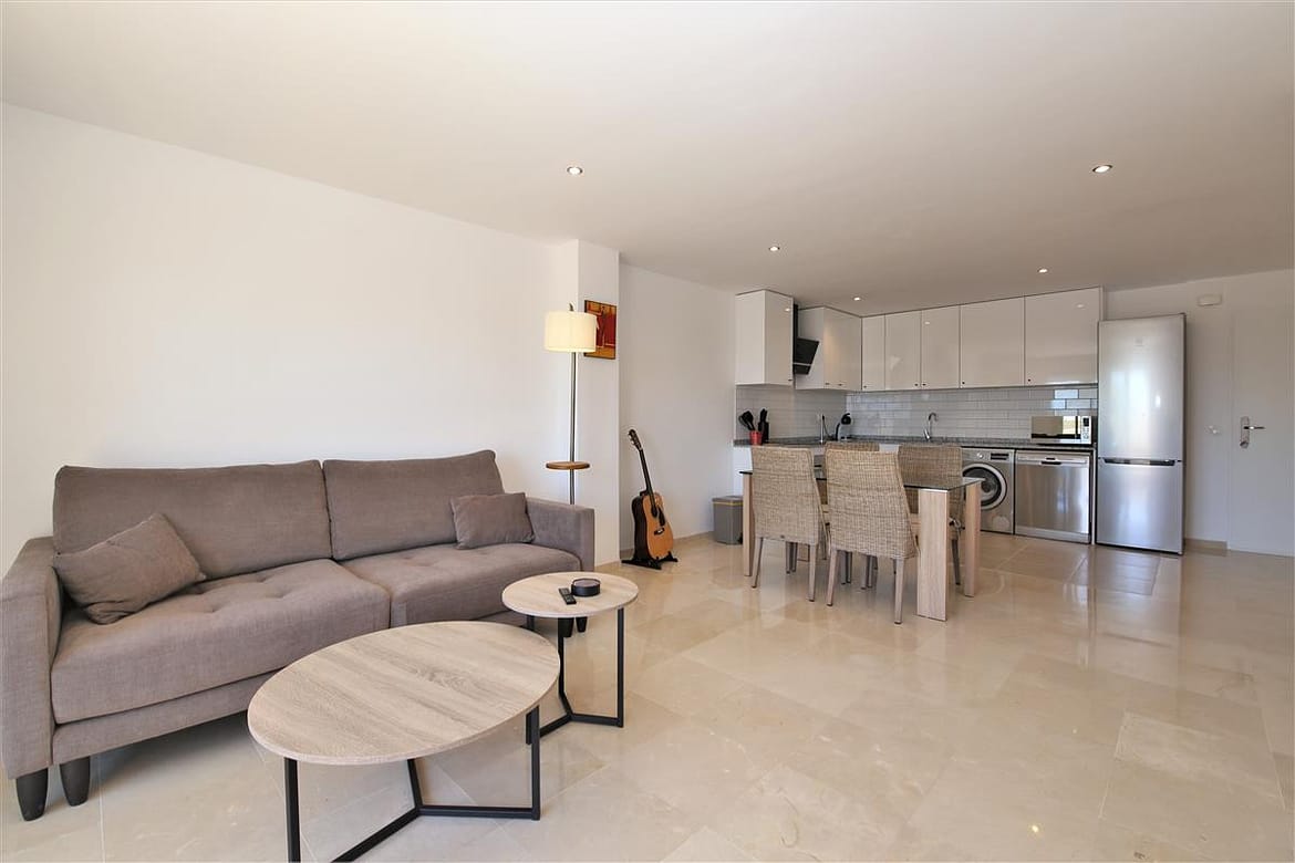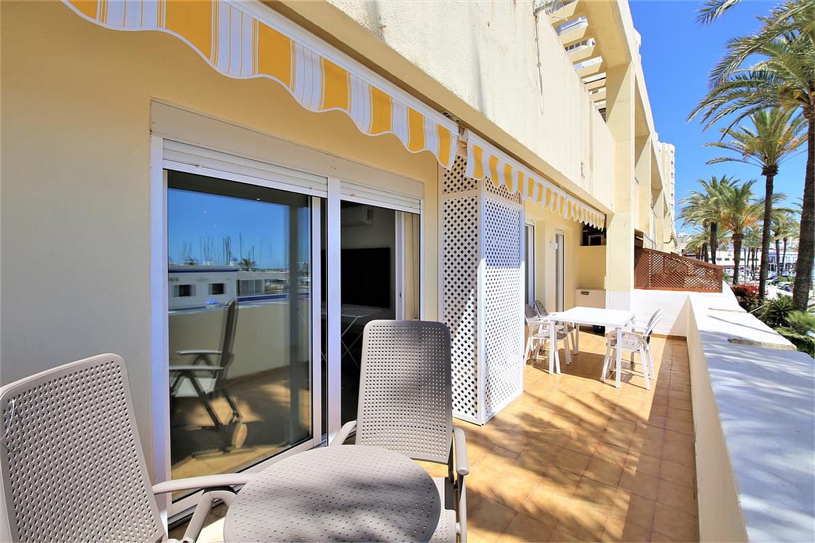 A modern, south facing front line apartment that has been completely renovated in a high standard and quality. The spacious property offers two large bedrooms and two bathrooms. The master bedroom has a super king size bed and air conditioning with direct access to the balcony with an outdoor dining area. It has an en-suite bathroom with walk-in shower, WC and sink. It also offers plenty of storage space in its built-in wardrobes. The second bedroom has two single beds and it is also equipped with air conditioning and built-in wardrobes. There is a family bathroom in the main hallway with shower, WC and sink. The modern lounge is very bright and offers comfortable seating for four guests along with a Wifi internet connection and international TV including Sky. The property has a modern open kitchen with all the appliances you may need for your holiday. Parking is possible in the communal parking area and operates on a first come, first served basis however finding a space isn't normally a problem. You can also park nearby for free and the property would suit families, golfers and retirees in particular. To reach this property you must go up a flight of around 15 steps from the port entrance.