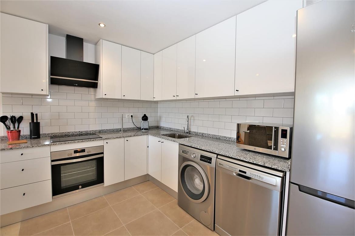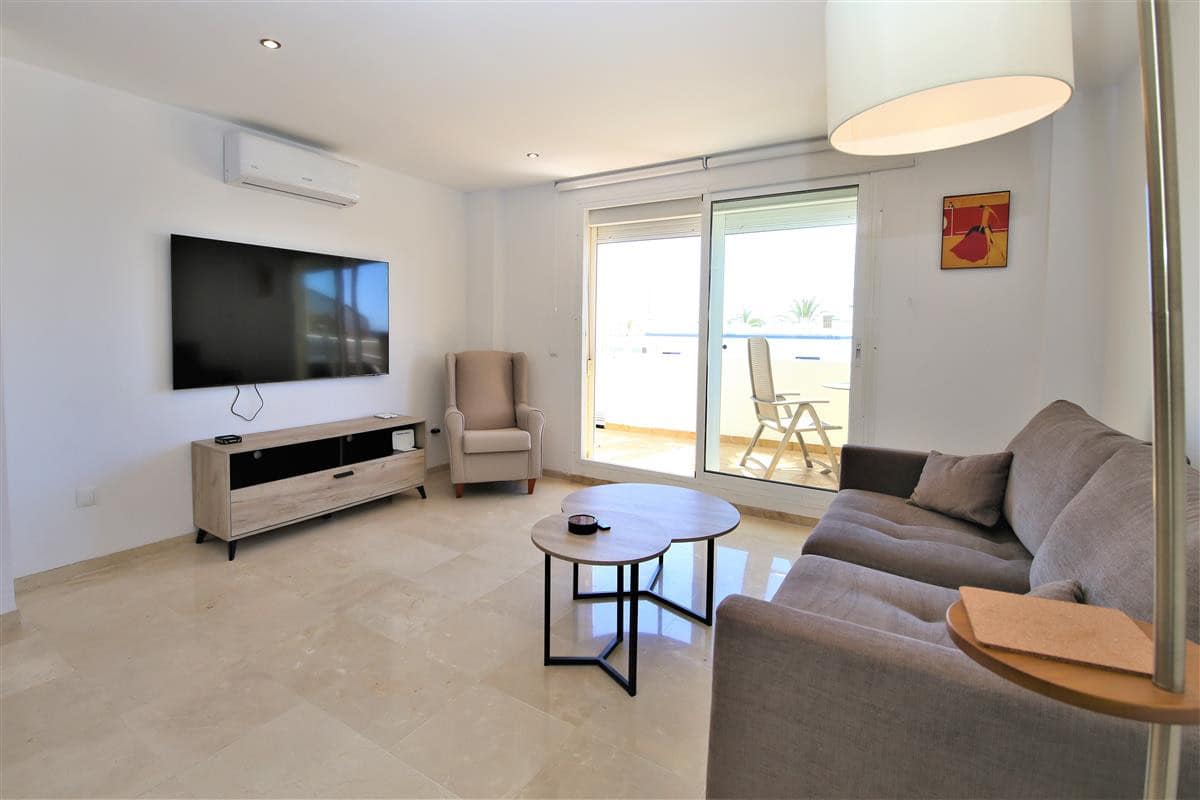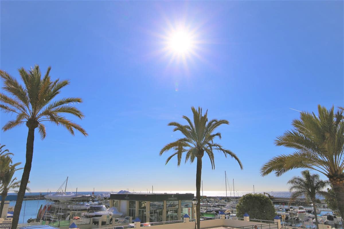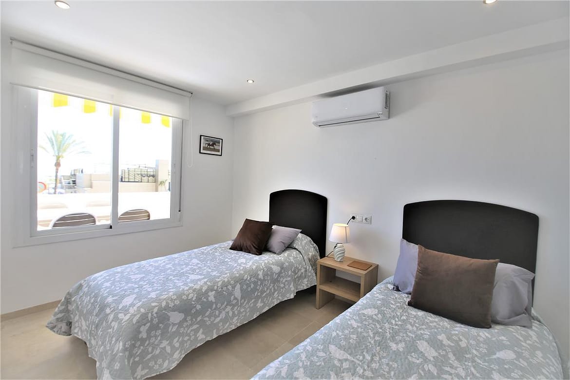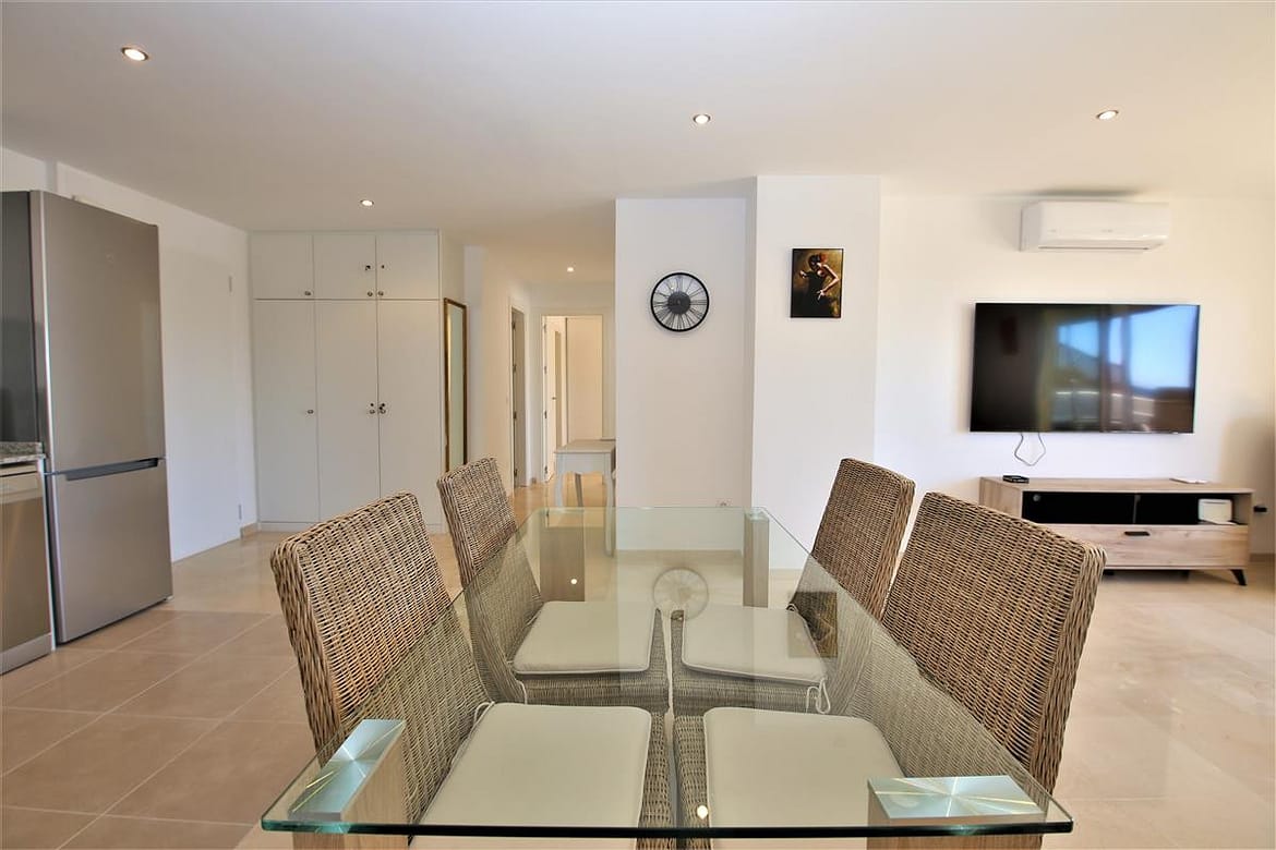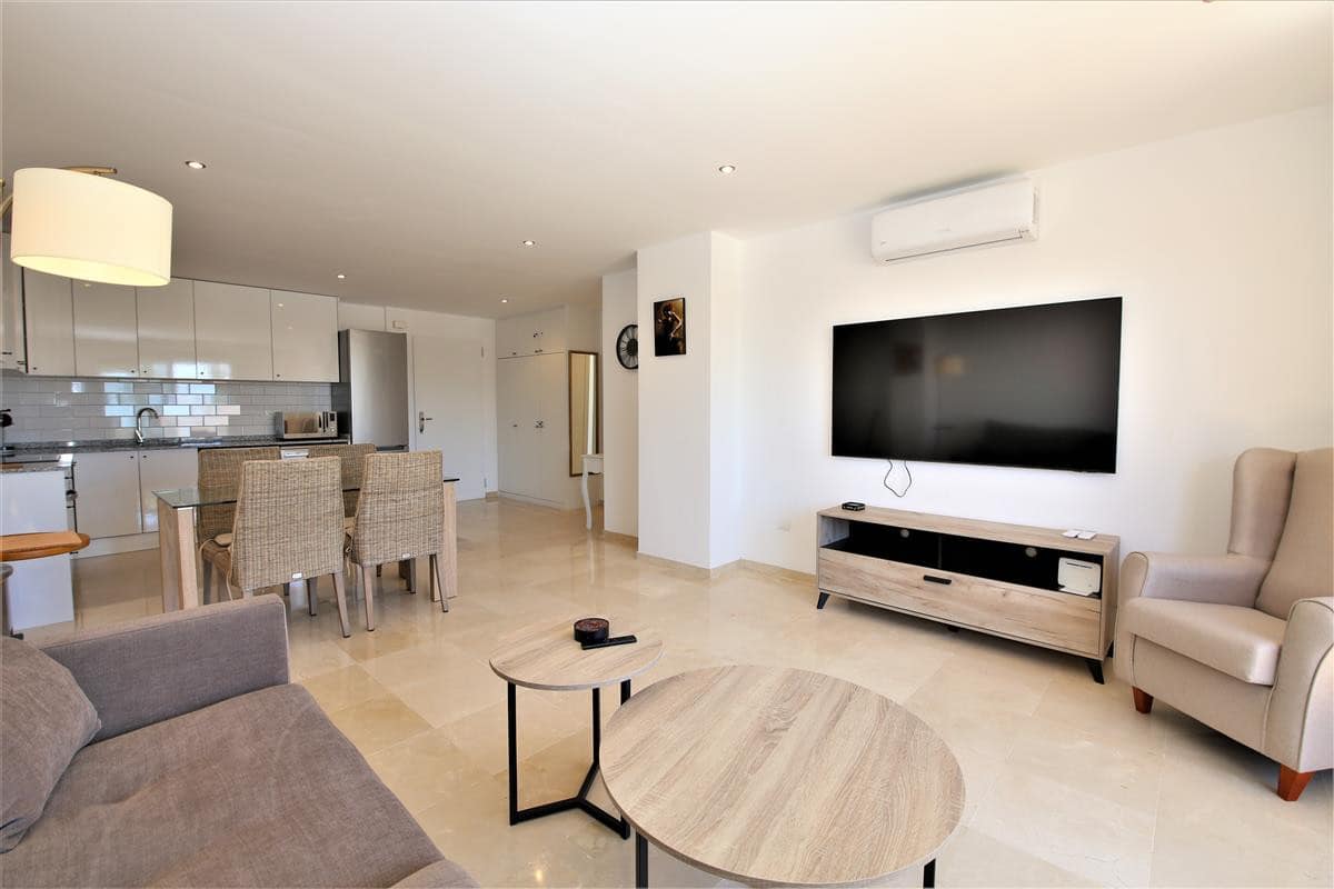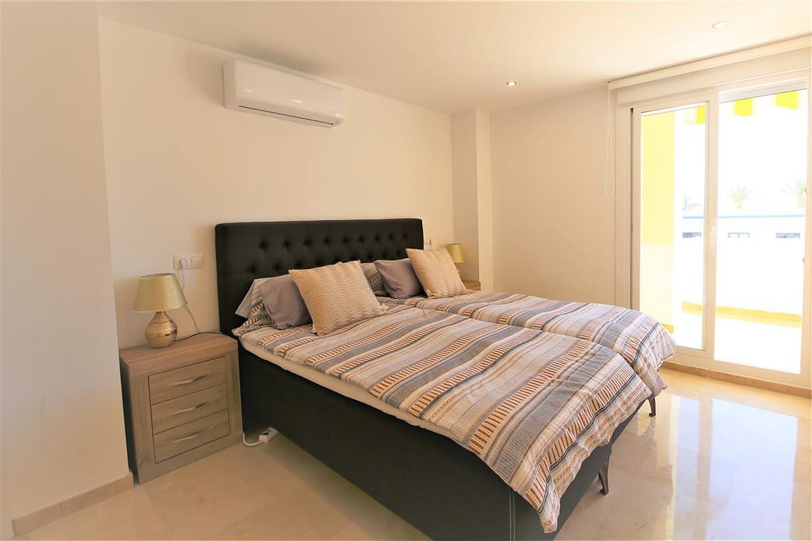 A modern, south facing front line apartment that has been completely renovated in a high standard and quality. The spacious property offers two large bedrooms and two bathrooms. The master bedroom has a super king size bed and air conditioning with direct access to the balcony with an outdoor dining area. It has an en-suite bathroom with walk-in shower, WC and sink. It also offers plenty of storage space in its built-in wardrobes. The second bedroom has two single beds and it is also equipped with air conditioning and built-in wardrobes. There is a family bathroom in the main hallway with shower, WC and sink. The modern lounge is very bright and offers comfortable seating for four guests along with a Wifi internet connection and international TV including Sky. The property has a modern open kitchen with all the appliances you may need for your holiday. Parking is possible in the communal parking area and operates on a first come, first served basis however finding a space isn't normally a problem. You can also park nearby for free and the property would suit families, golfers and retirees in particular. To reach this property you must go up a flight of around 15 steps from the port entrance.