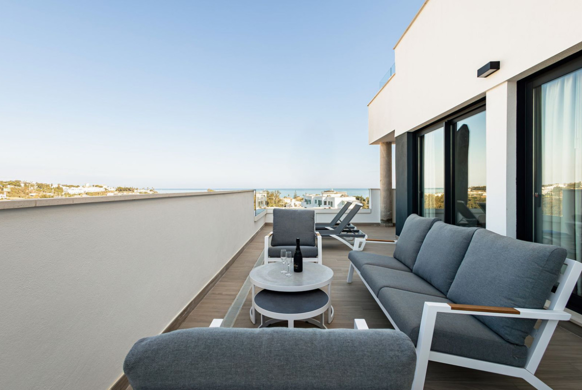Step into this spacious 100 m² apartment featuring bright, open-plan living, contemporary décor, and high-quality finishes. The highlight is a stunning 62 m² private terrace, beautifully furnished with a dining table, outdoor sofa, and sunbeds — ideal for relaxing mornings or sunsets.