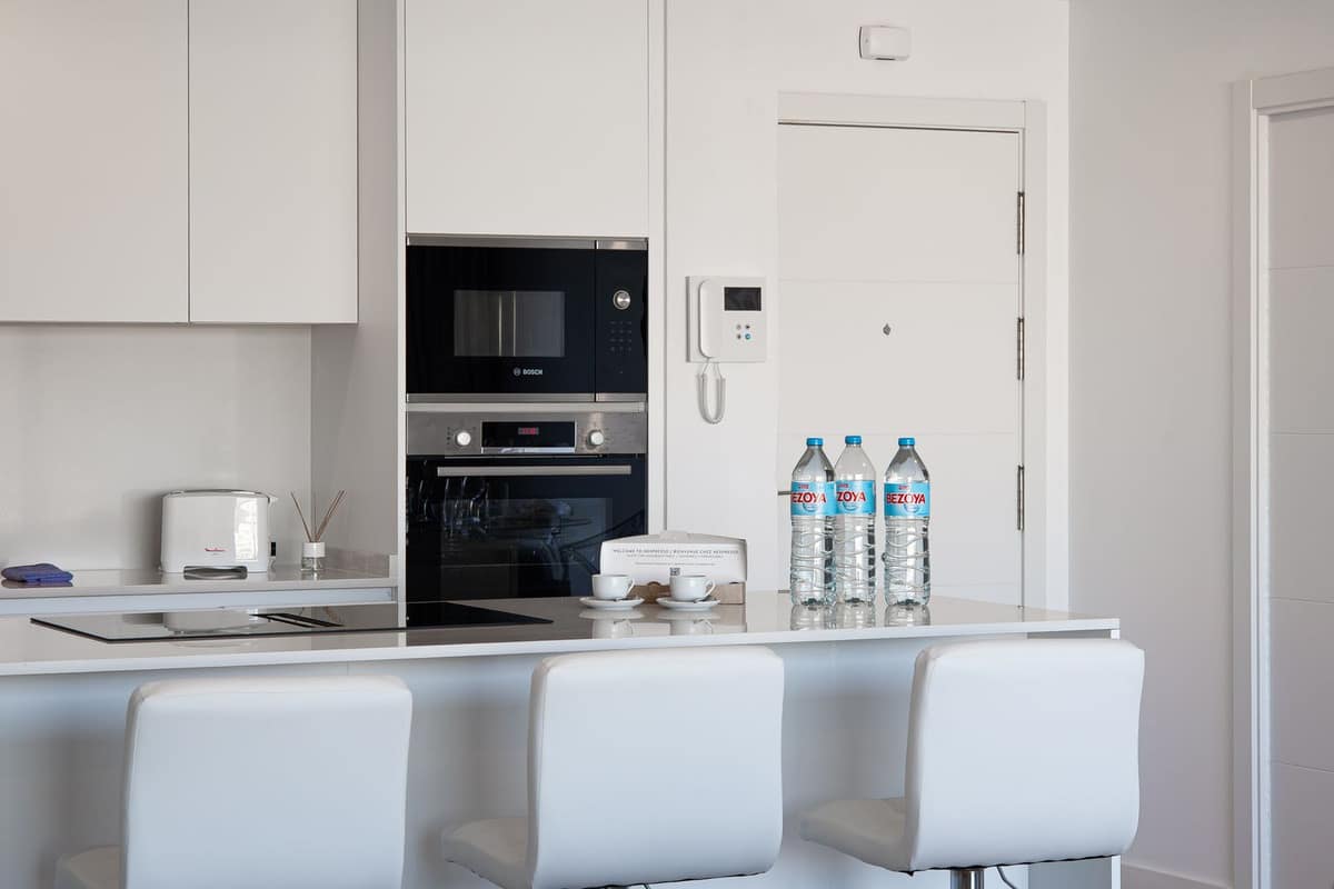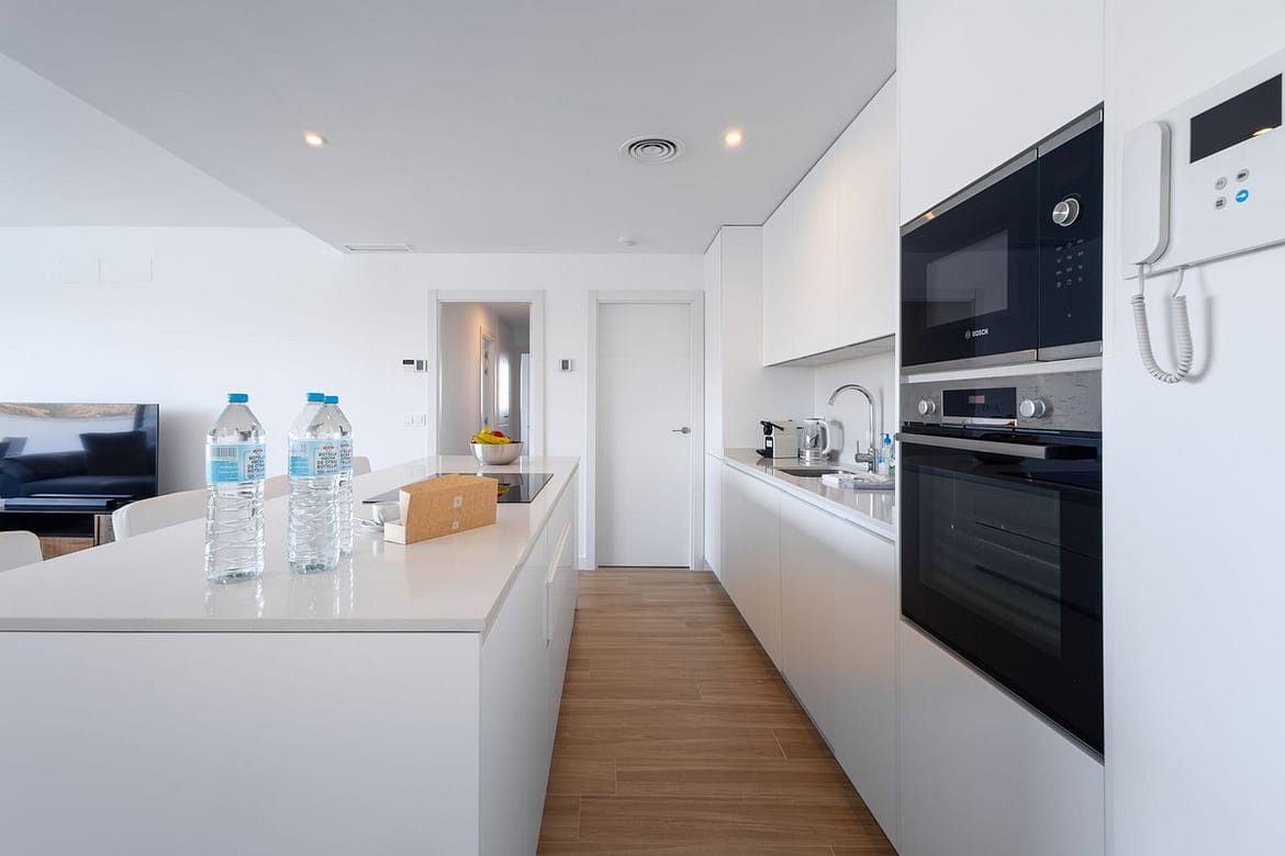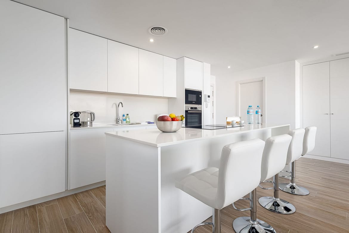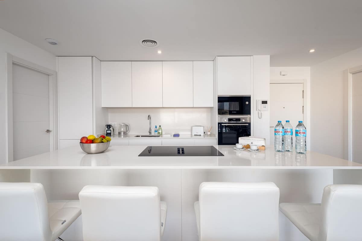 A fully equipped open-plan kitchen with modern appliances.