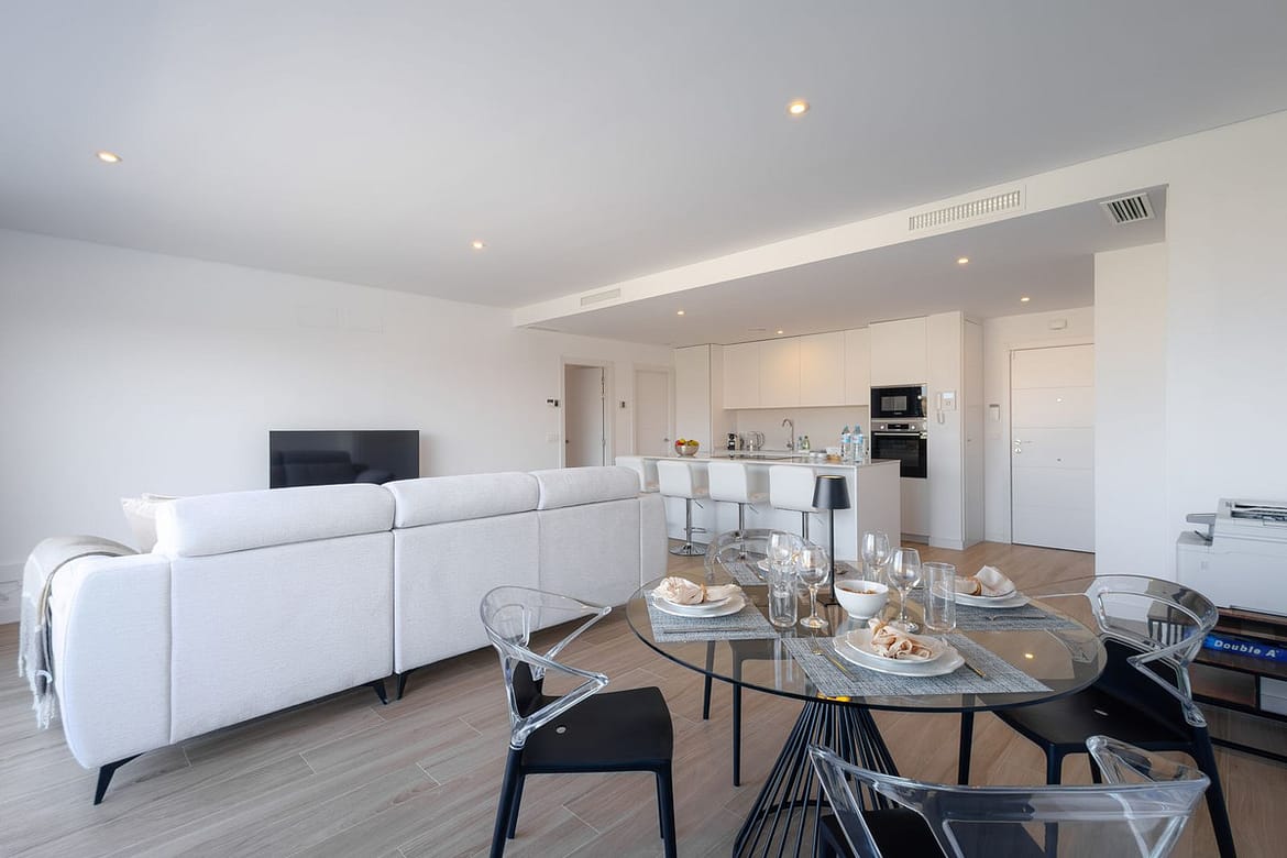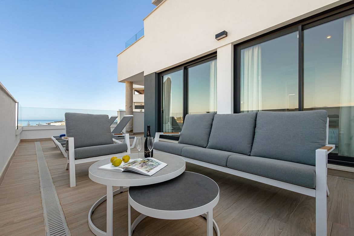 Step into this spacious 100 m² apartment featuring bright, open-plan living, contemporary décor, and high-quality finishes. The highlight is a stunning 62 m² private terrace, beautifully furnished with a dining table, outdoor sofa, and sunbeds — ideal for relaxing mornings or sunsets.