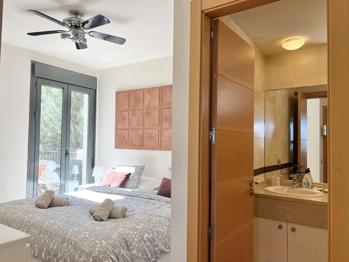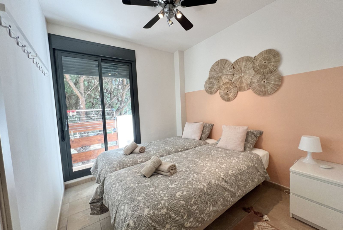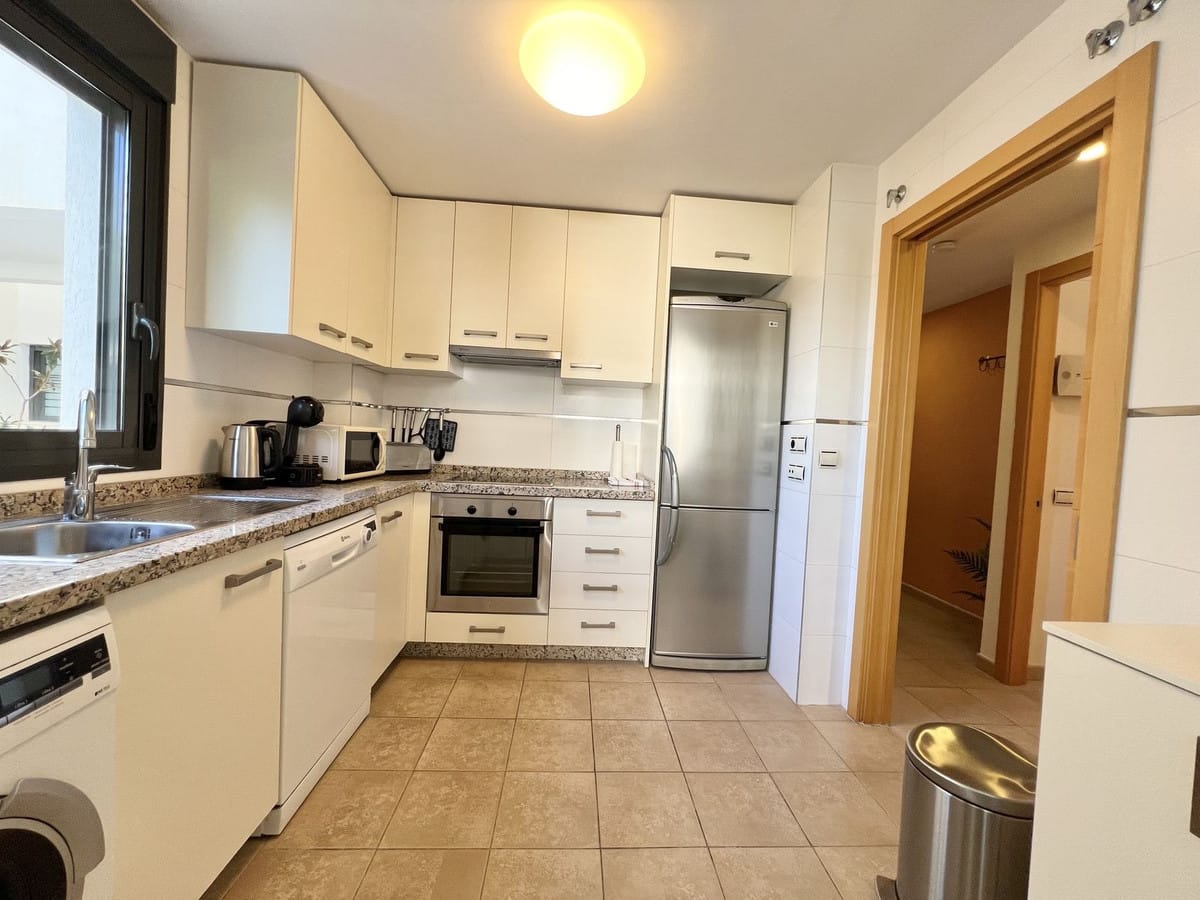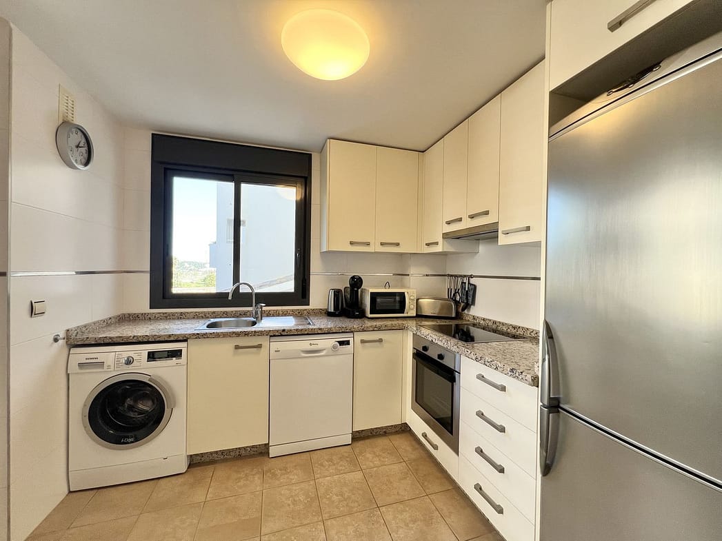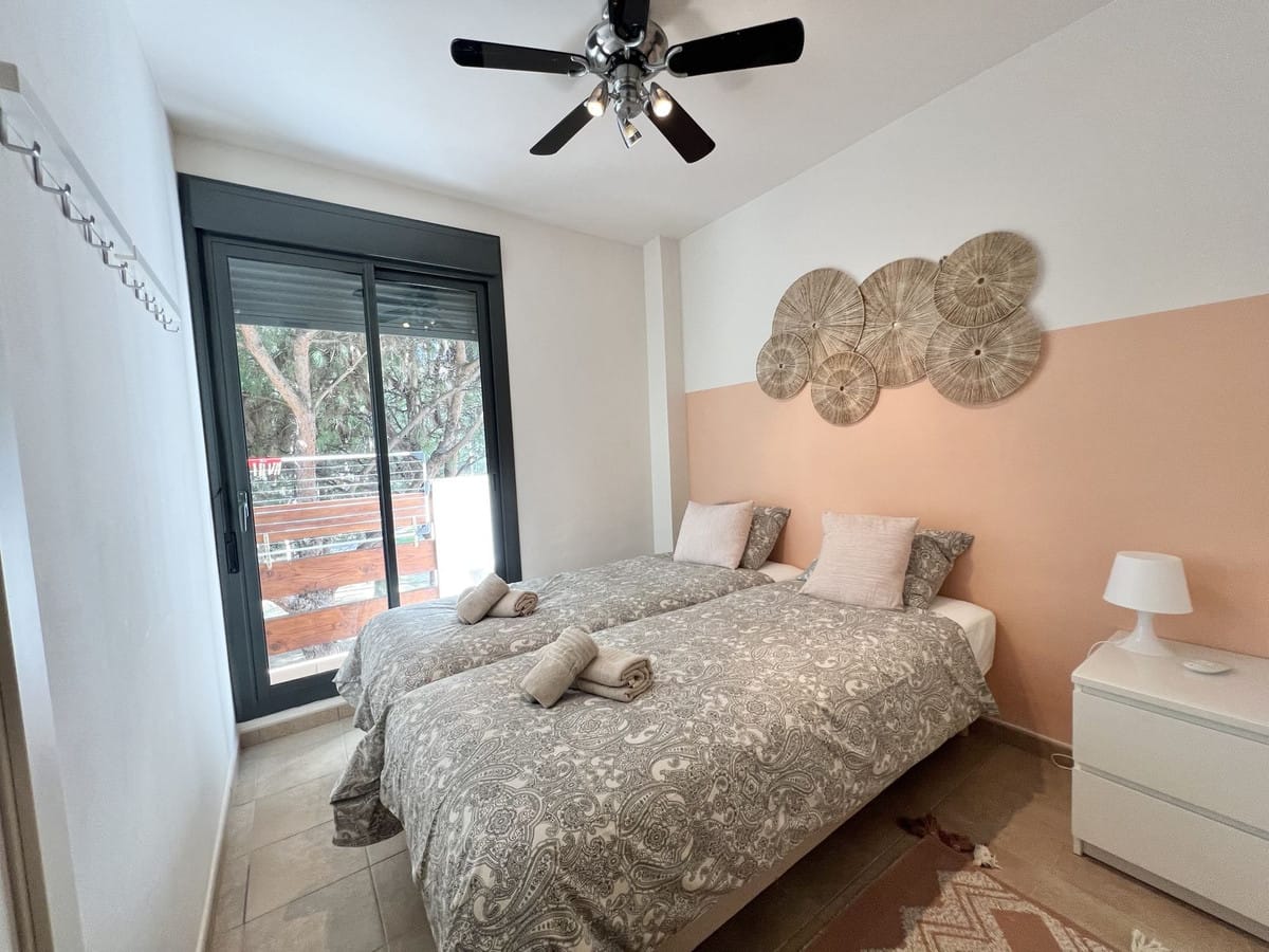 The apartment: When you step into the apartment you will find the hall that leads into the cozy living room with access to two terraces. The comfortable sofa, dining table for 4, TV will make you feel home. Also the south west facing covered terrace, where you best spend the days and evenings with friends and family.The kitchen is on the right after entering and it is fully equipped with dishwasher, fridge and freezer, coffee maker, kettle, toaster and much more. There is hot and cold A/C through the apartment. The main bedroom with its en-suite bathroom, double bed and plenty of storage place. The second bedroom has two single beds and access to a small balcony. The second bathroom with a shower is right outside. The apartment is otherwise fully equipped with A / C in all rooms, WIFI in all rooms, Underground parking included,
