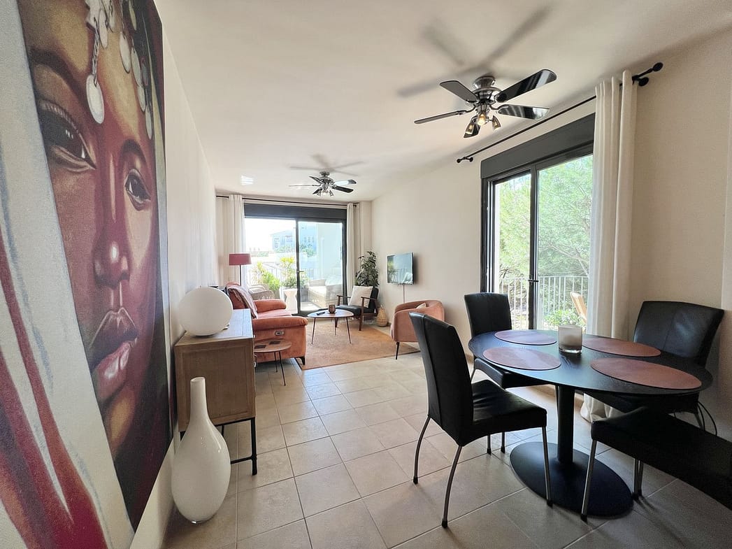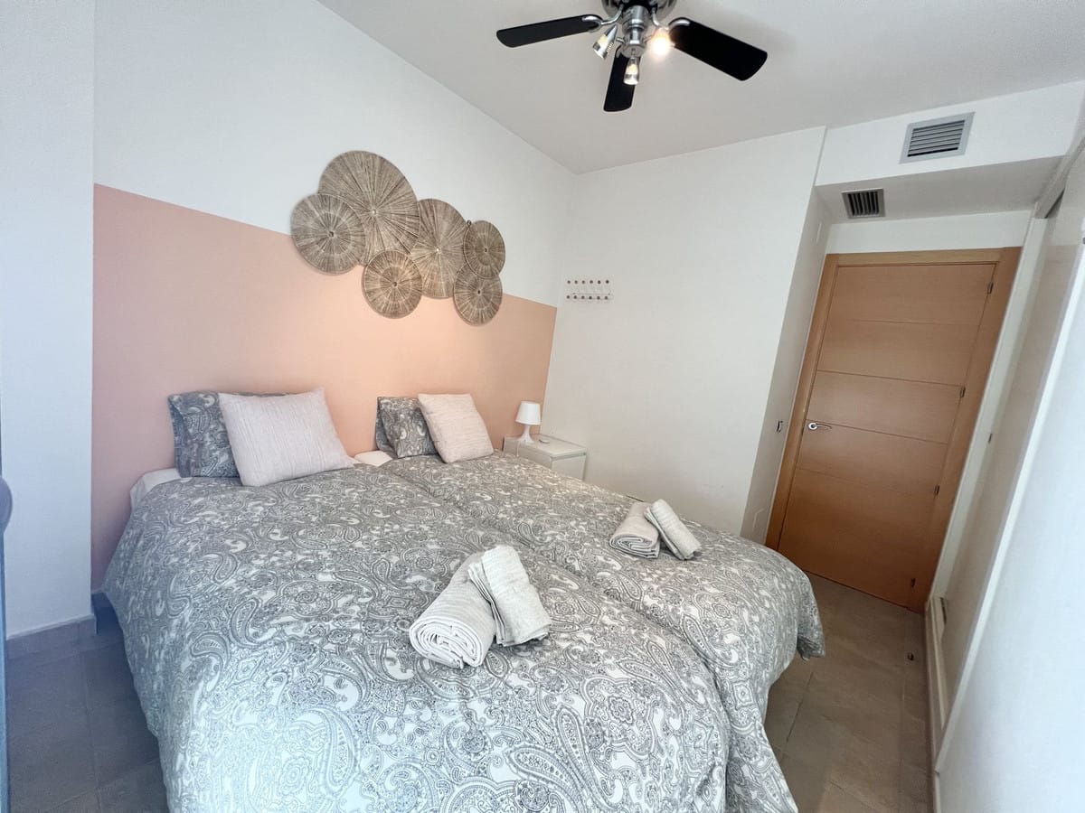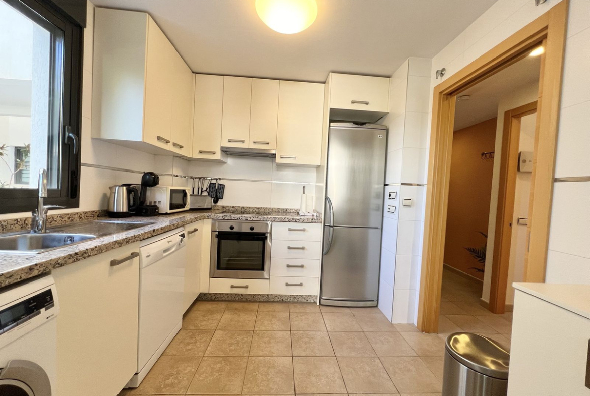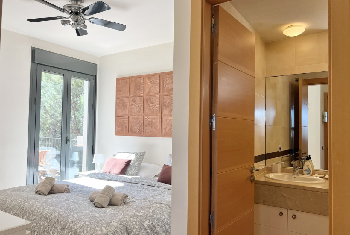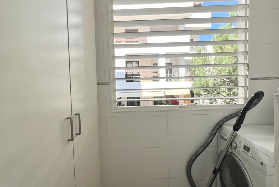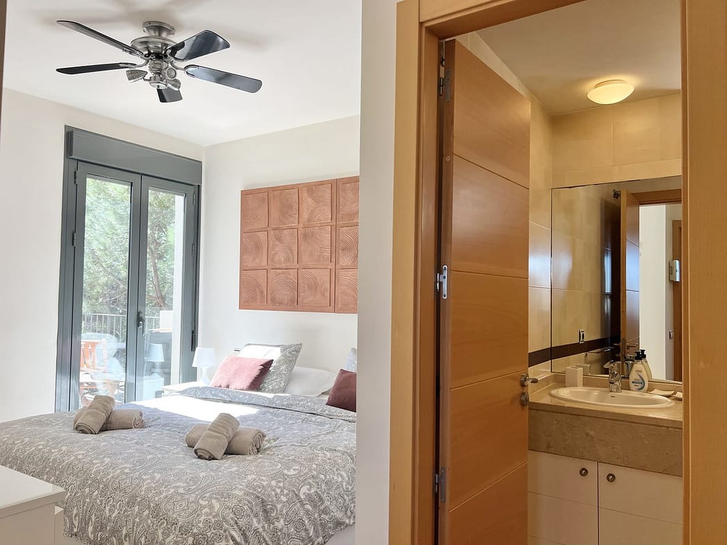 The apartment: When you step into the apartment you will find the hall that leads into the cozy living room with access to two terraces. The comfortable sofa, dining table for 4, TV will make you feel home. Also the south west facing covered terrace, where you best spend the days and evenings with friends and family.The kitchen is on the right after entering and it is fully equipped with dishwasher, fridge and freezer, coffee maker, kettle, toaster and much more. There is hot and cold A/C through the apartment. The main bedroom with its en-suite bathroom, double bed and plenty of storage place. The second bedroom has two single beds and access to a small balcony. The second bathroom with a shower is right outside. The apartment is otherwise fully equipped with A / C in all rooms, WIFI in all rooms, Underground parking included,