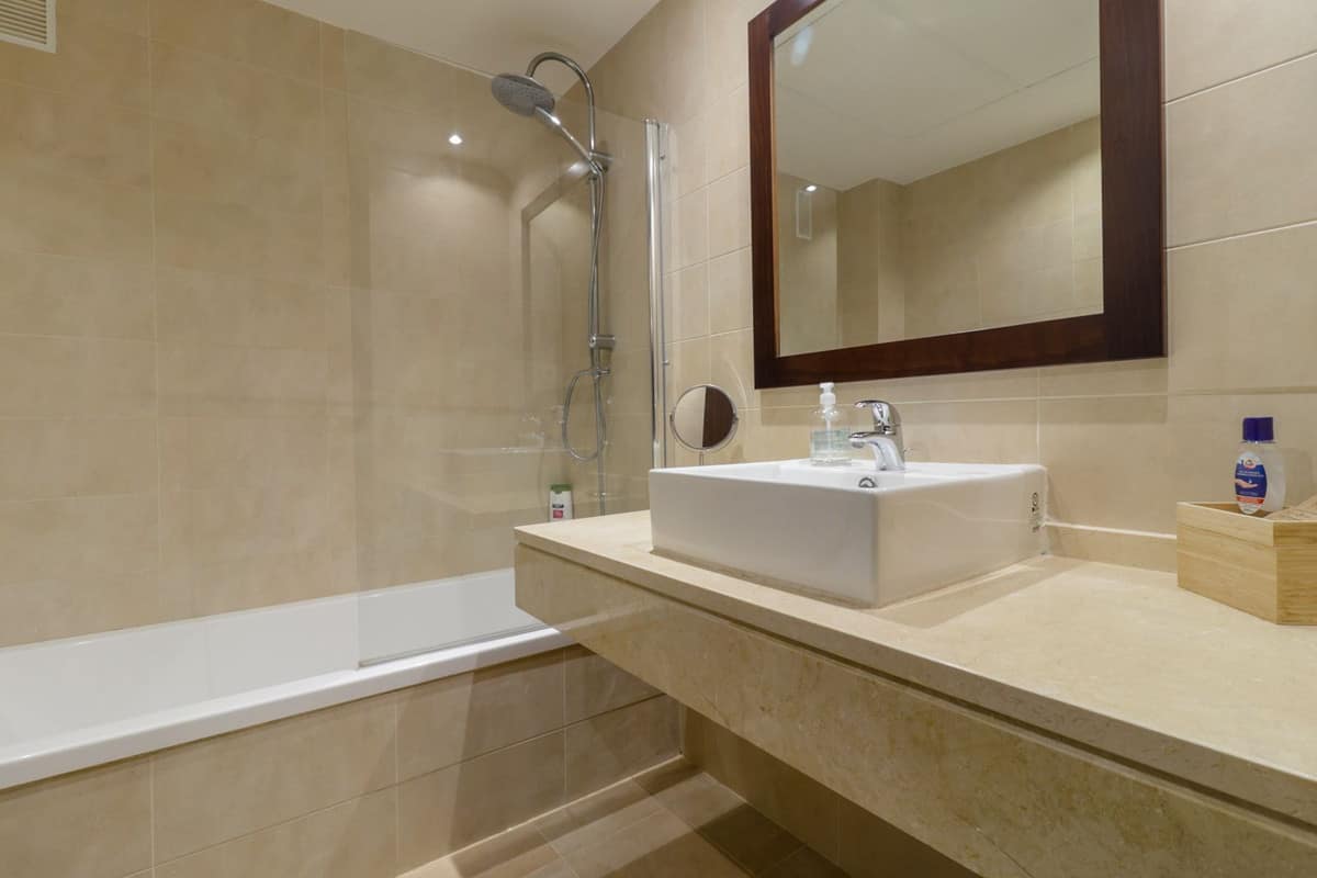 The apartment offers 2 spacious bedrooms, both tastefully decorated with warm, natural tones. The master bedroom has direct access to the terrace and beautiful green views. There are 2 bathrooms, one with a bathtub and one guest bathroom.