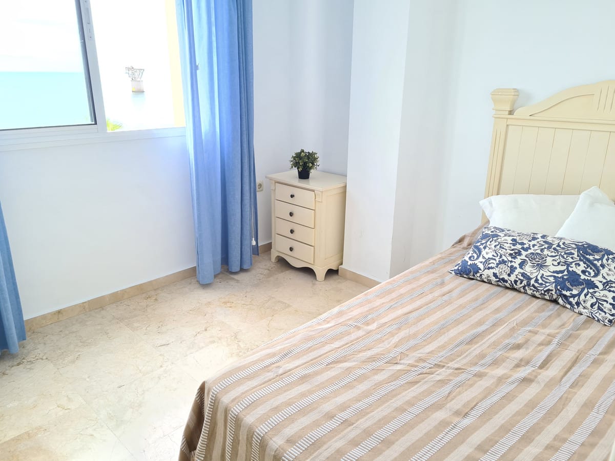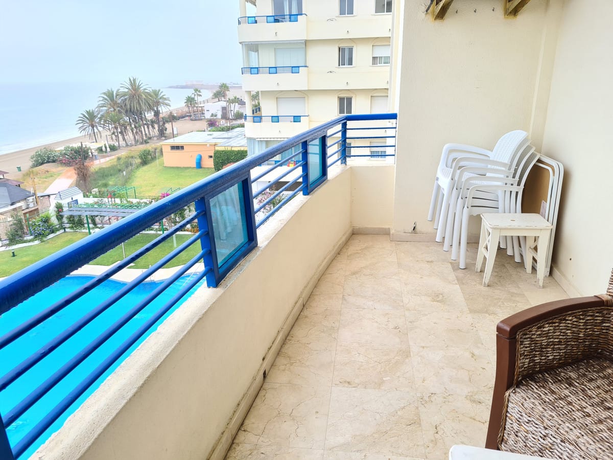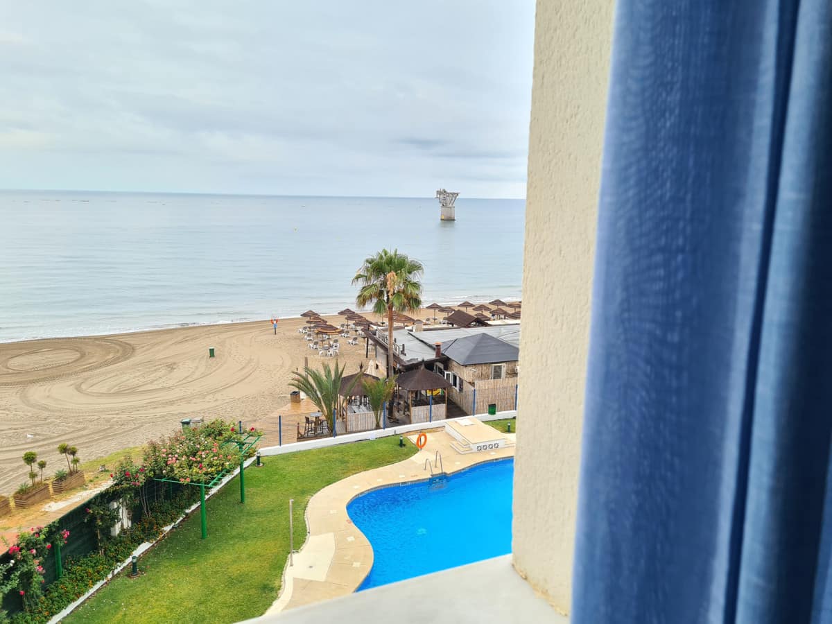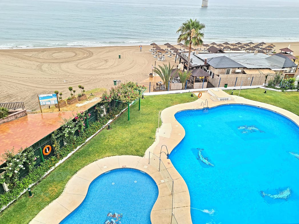 Apartment on the beachfront with frontal views of the sea in a complex with communal pool. The complex has excellent qualities and is right in front of a Dolce Vita beach bar and is very close to Playa Padre.