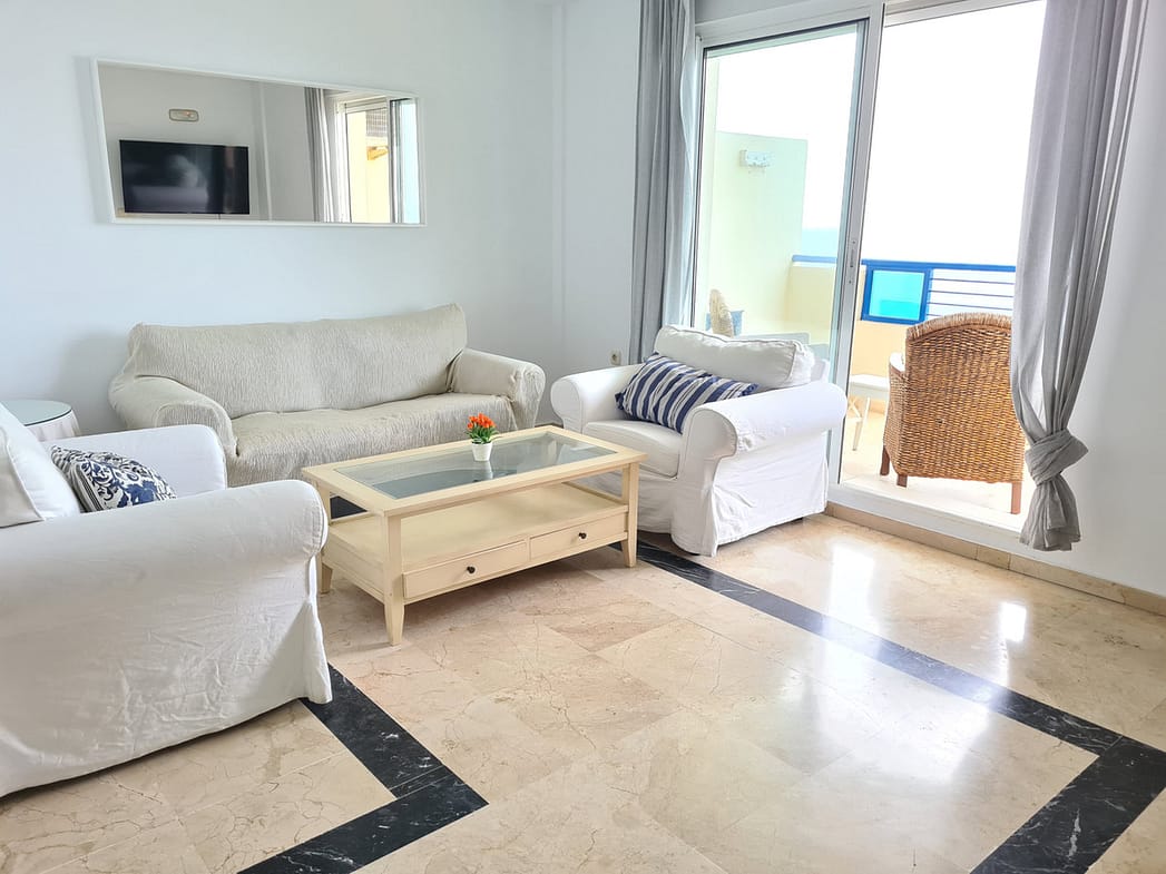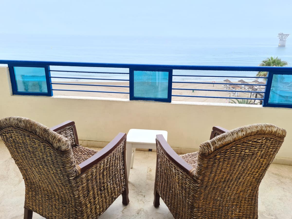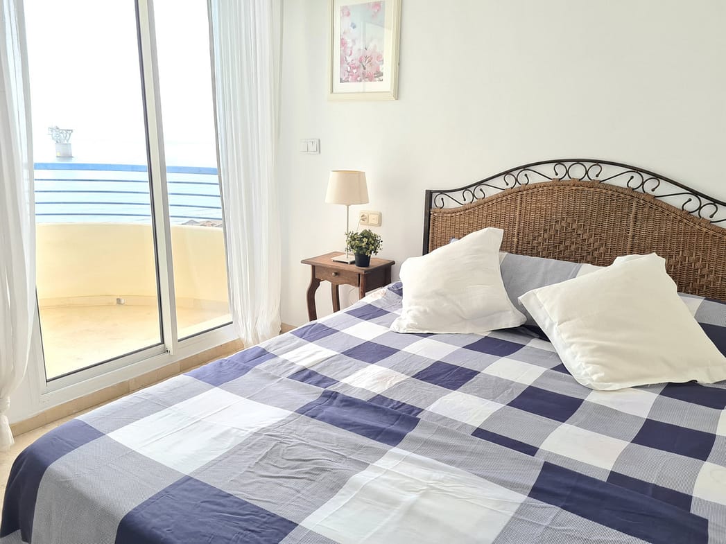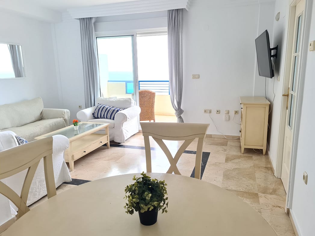 Apartment on the beachfront with frontal views of the sea in a complex with communal pool. The complex has excellent qualities and is right in front of a Dolce Vita beach bar and is very close to Playa Padre.
