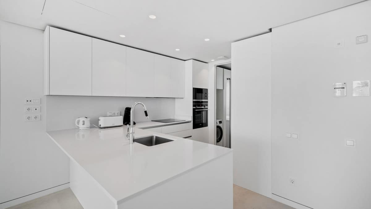 The flat has a spacious, bright open plan living/dining room with a beautiful open plan kitchen including top-end appliances, with American fridge integrated microwave and oven, with a separate room off the kitchen with washing machine and tumble dryer leading to the terrace, 2 bedrooms with fitted wardrobes and 2 bathrooms. There is also 24/24 security. The property also has 1 underground parking space.