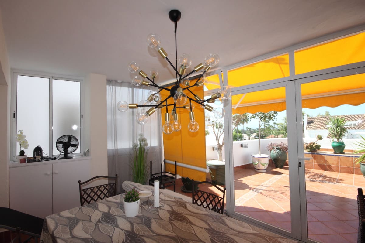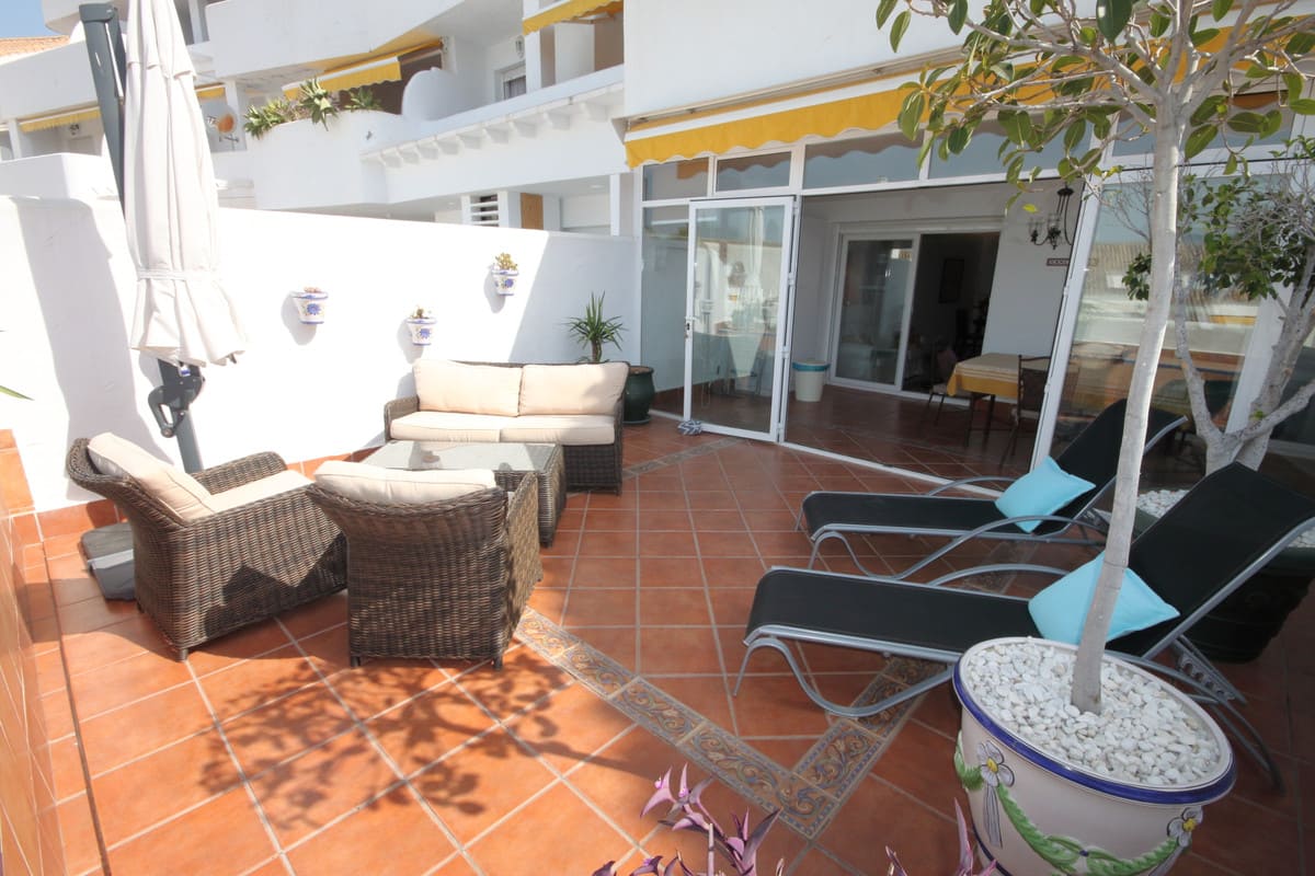 This is a spacious 2 bed and 2 bath apartment, situated in a popular urbanisation called El Dorado, which is situated just a few minutes' walk away from all amenities. Walking into the apartment you are greeted by a large dining and living room area which connects to the kitchen and a hallway that access the two bedrooms. From the living room you can access a huge terrace space where you can enjoy lovely sea and garden views. As well as that, within this community, you can take advantage of a well maintained communal pool and garden.