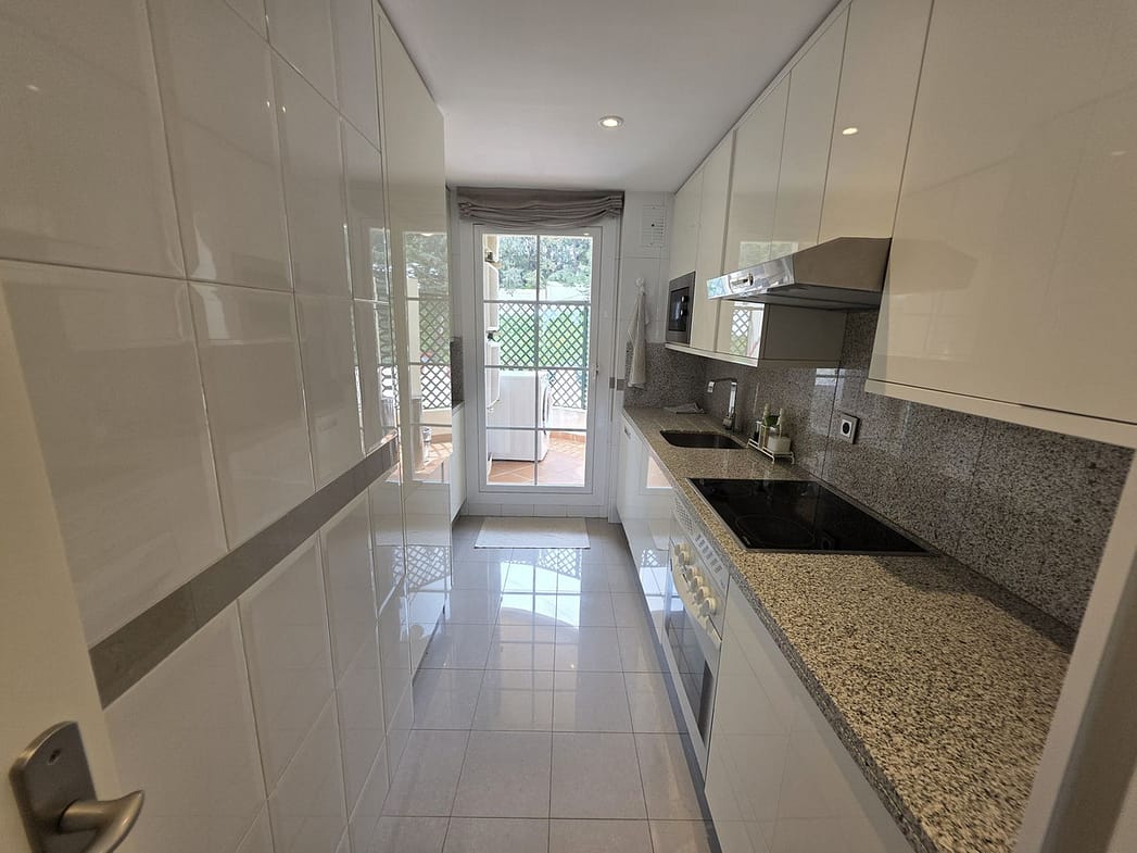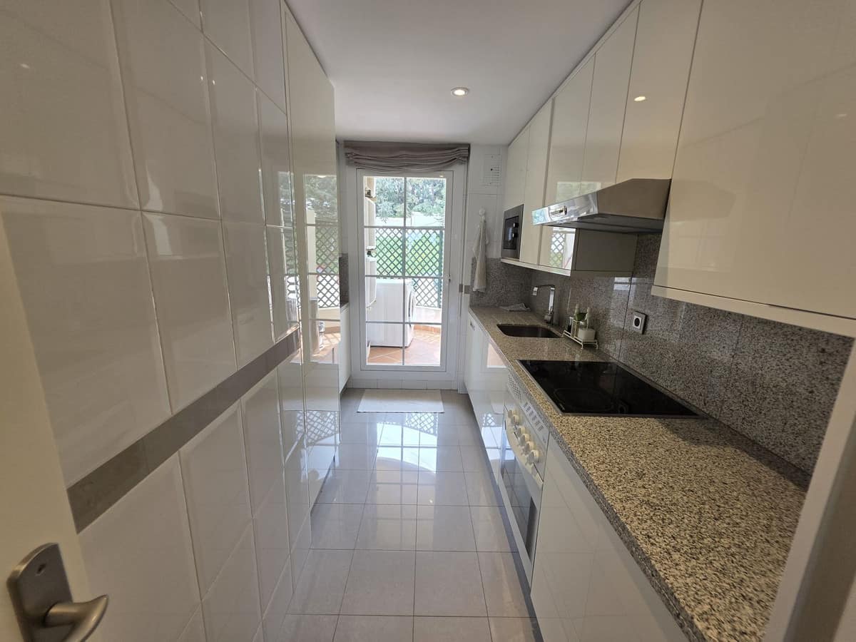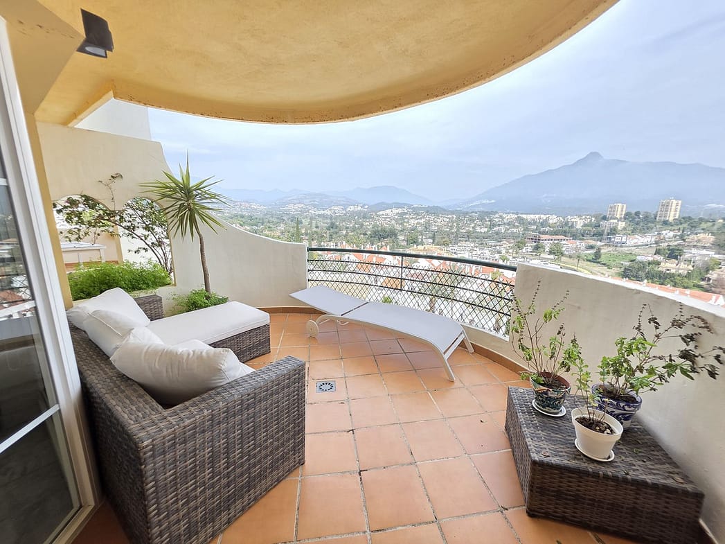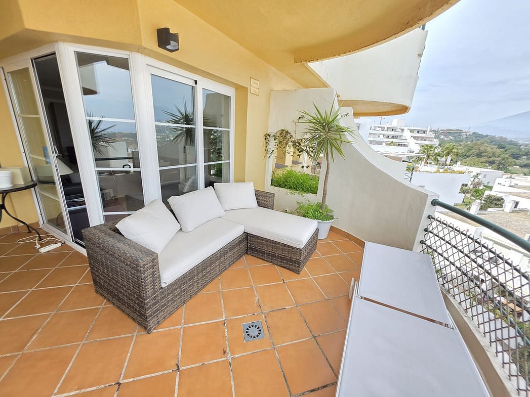 This beautifully designed 2-bedroom, 2-bathroom apartment in Nueva Andalucía, Marbella, is available for rent, offering the perfect combination of comfort, luxury, and convenience. With 92 m² of built space and a 20 m² terrace, it boasts breathtaking panoramic views of the mountains and lush surroundings. The open-plan living and dining area is spacious and bright, seamlessly extending to the terrace for a perfect indoor-outdoor living experience. The fully equipped modern kitchen includes high-quality appliances and ample storage, complemented by a separate utility area. The master bedroom features an en-suite bathroom, while the second bedroom is spacious with access to the second bathroom.