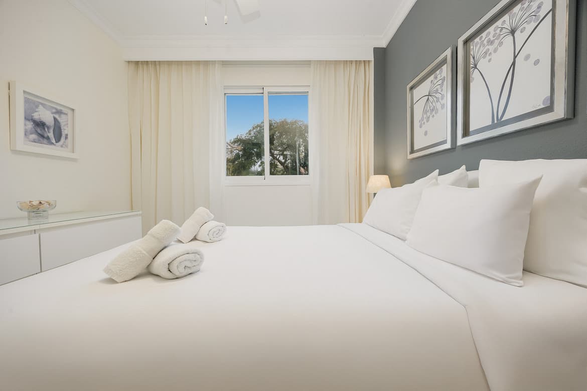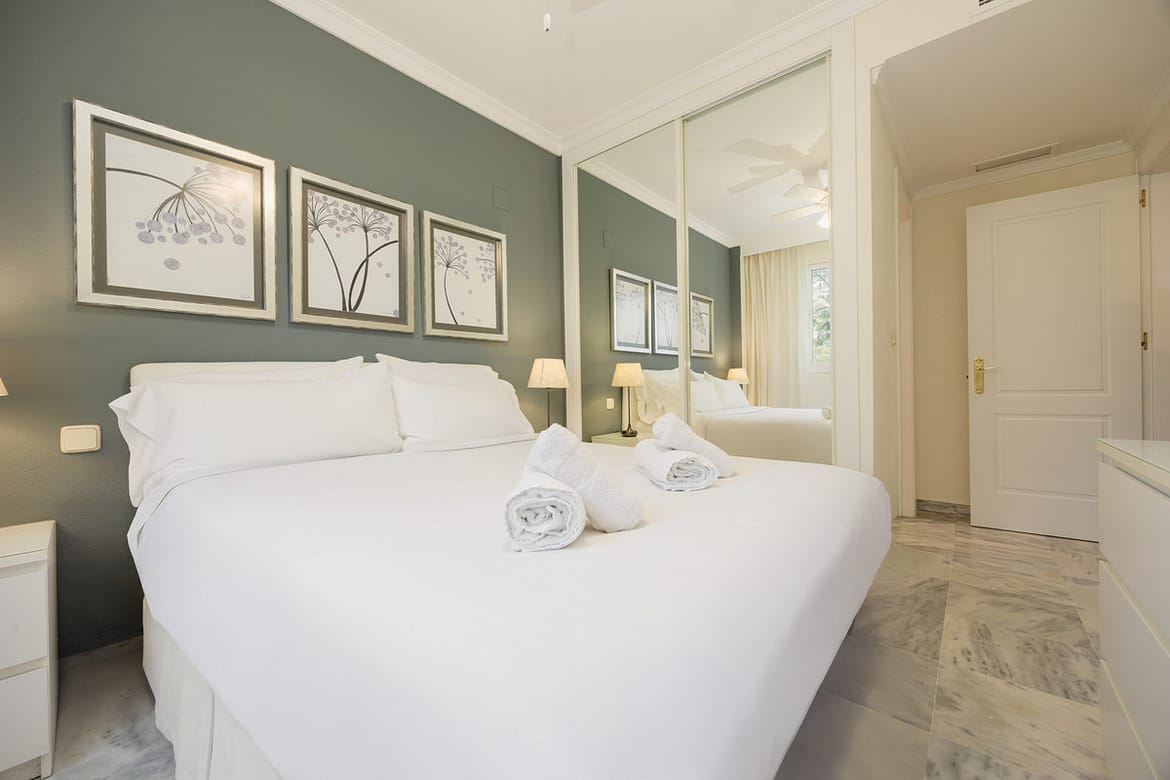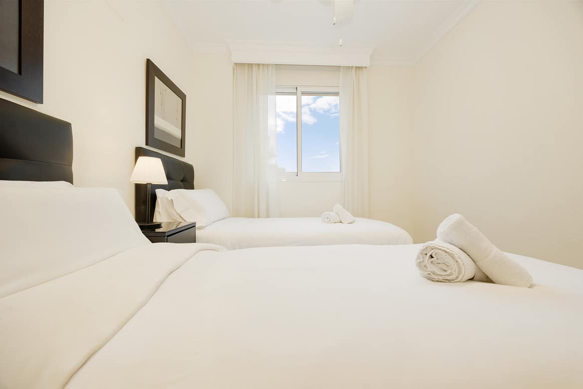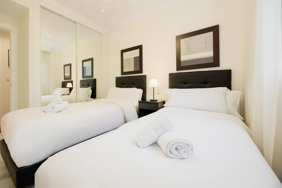 The master bedroom, en suite, has a double bed and a full mirrored closet, while the secondary bedroom has two comfortable single beds of 90, and another closet, this also full-length, it is also next to the other bathroom of the property. Both bathrooms, the en-suite and the one outside, have a bathtub with built-in shower, and the en-suite bathroom is lacquered in marble. Both bedrooms have our own bed linen and towels.