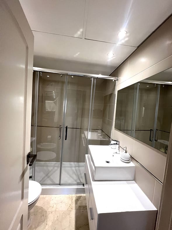 Set on the fourth floor, the apartment welcomes you with an elegant entrance hall leading into a bright and spacious living–dining area that opens onto a generous terrace. A fully renovated designer kitchen enhances the home’s contemporary appeal. The master suite features terrace access and a refined en-suite bathroom, complemented by a comfortable second bedroom and full guest bathroom.