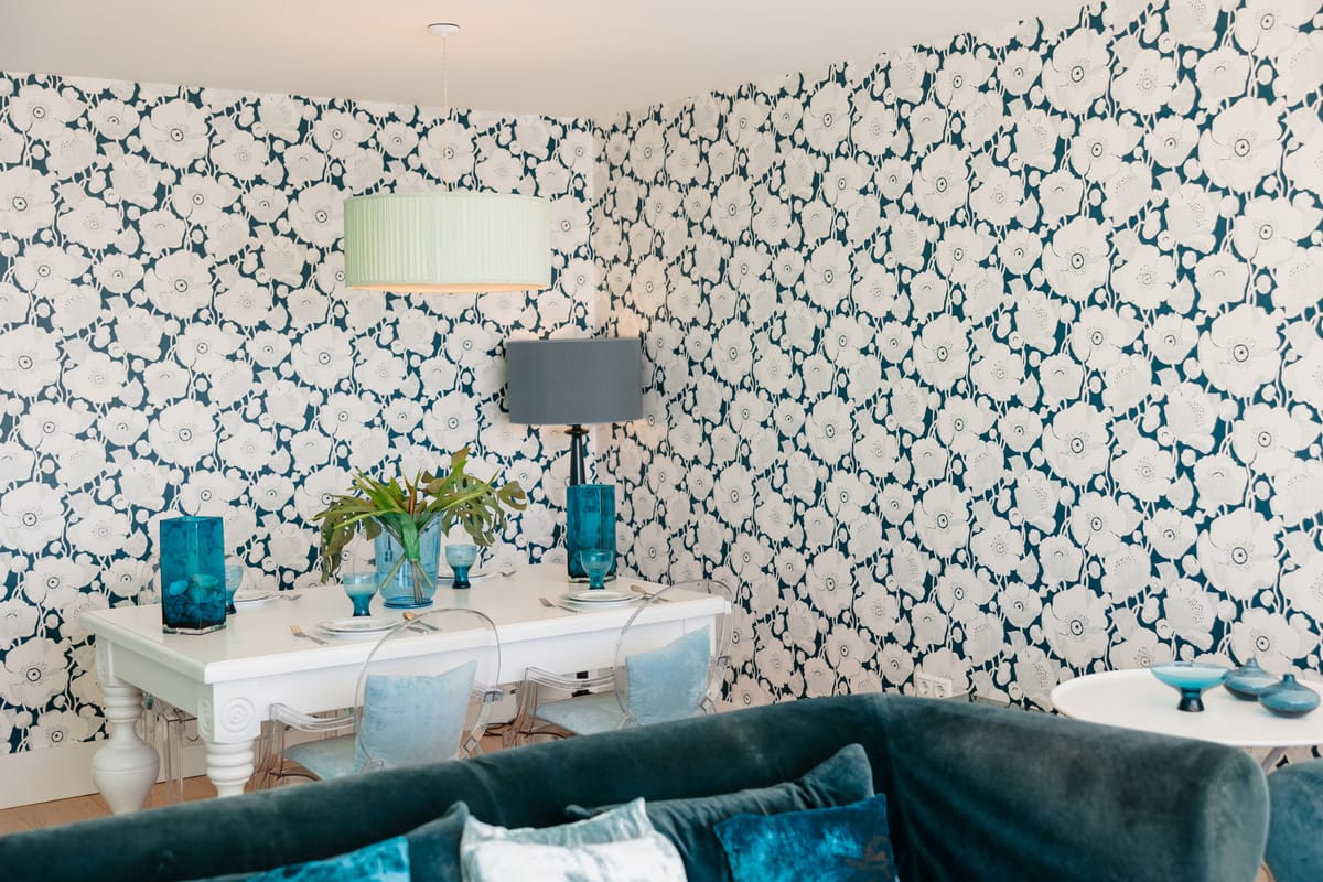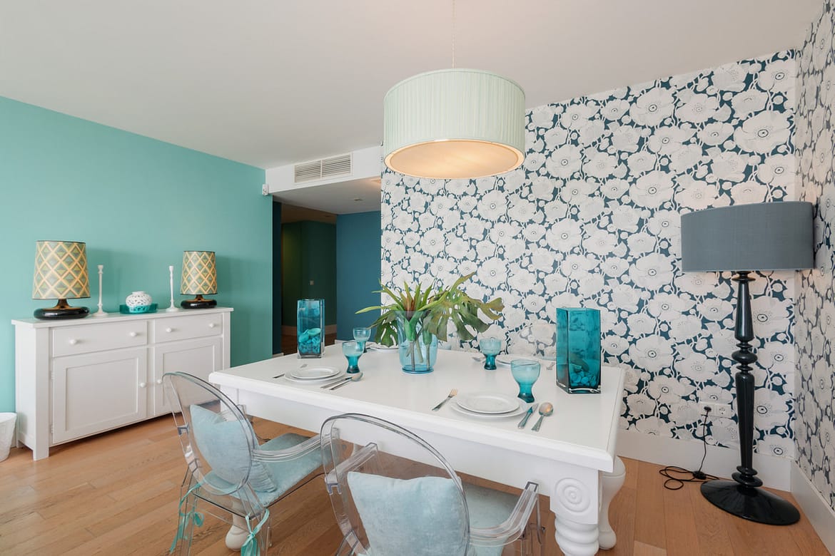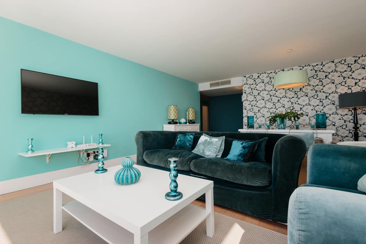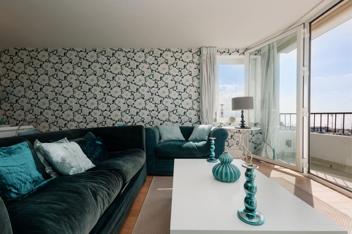 Upon entering, you are welcomed by a spacious and bright living room, elegantly and simply decorated. The living room features turquoise sofas, a smart TV, and large windows that connect directly to the private terrace, where you can enjoy views of the marina and the sea.