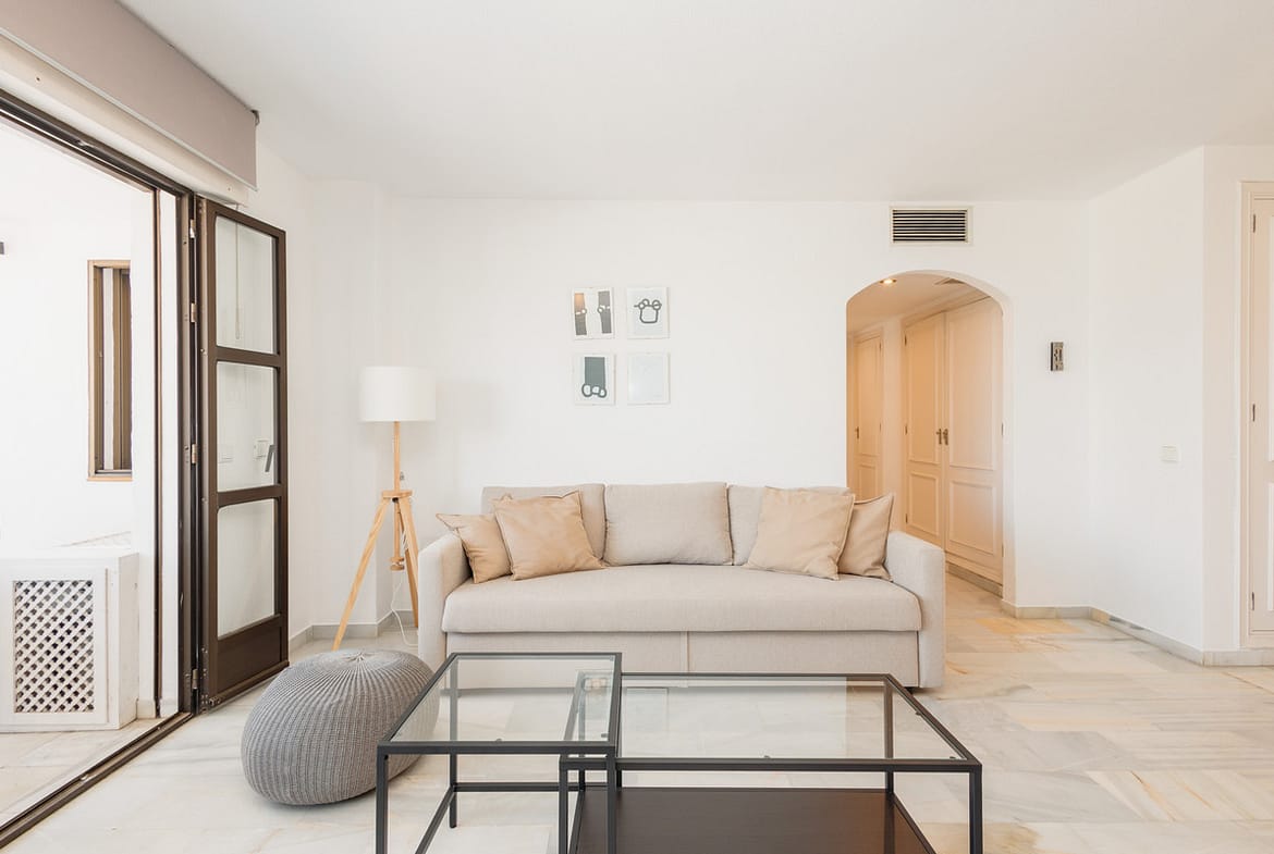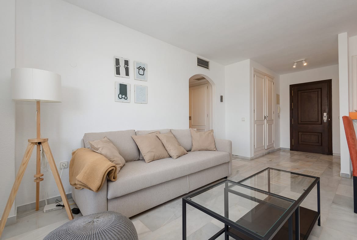 Upon entering, you’re welcomed by a bright living-dining area with direct access to the private terrace, featuring a chill-out area and a dining table for six guests. From here, you can enjoy panoramic views of La Concha Mountain and the vibrant urban surroundings of Puerto Banús.