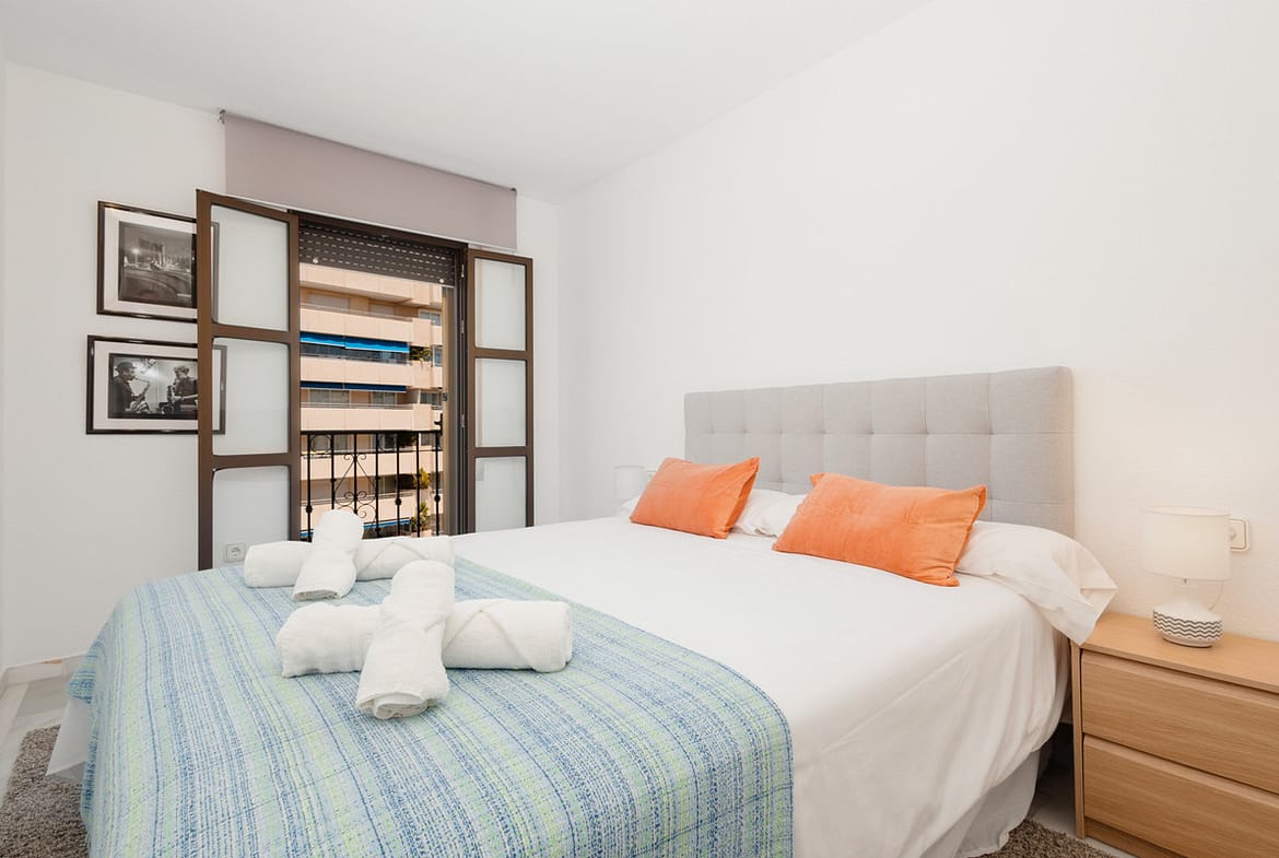 The two bedrooms are tastefully decorated and designed for comfort. The master bedroom features a double bed, natural light, and a private balcony. The second bedroom has a single bed and a sofa bed. Additionally, the living room includes a sofa bed for added flexibility.